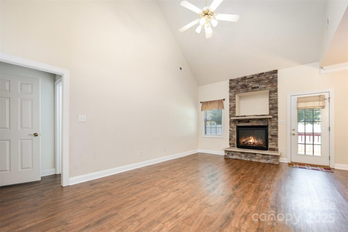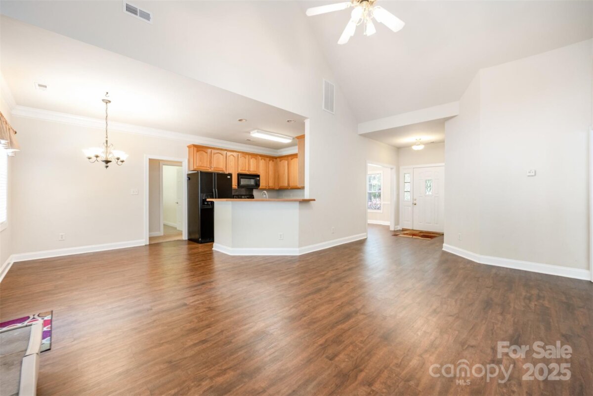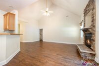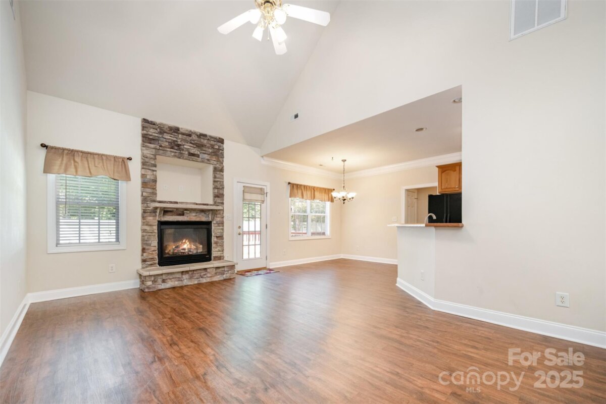 Sitting on over half an acre, this 4-bedroom, 2-bath home offers a spacious floor plan, 2-car garage, and a huge fenced backyard — all at an unbeatable value. The kitchen features 42" cabinets, generous counter space, and overlooks the airy living room with vaulted ceilings, a stone fireplace, and abundant natural light. Step outside to the large back deck overlooking the private yard — perfect for relaxing or entertaining. Located less than a mile from Harris Teeter, I-485, and Stevens Creek Nature Preserve, which offers scenic trails, community events, and outdoor programs.