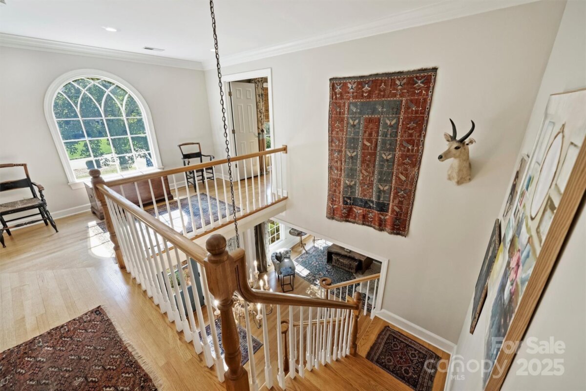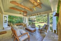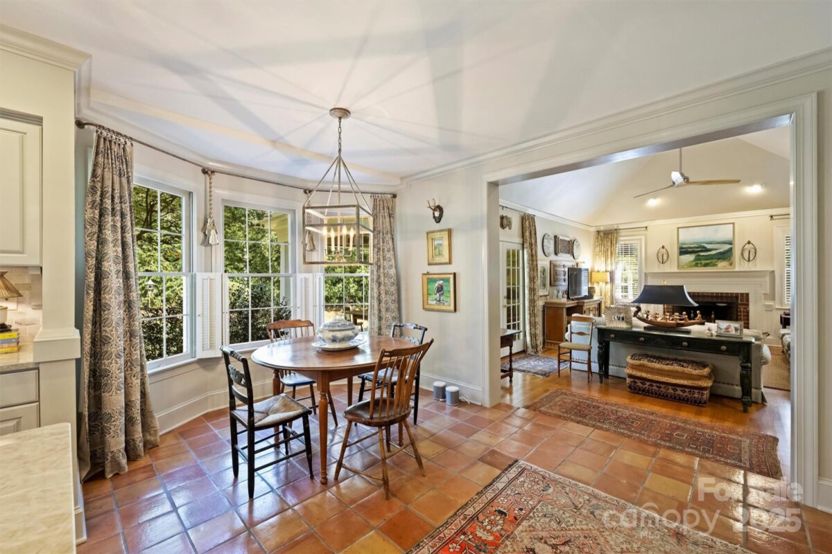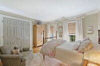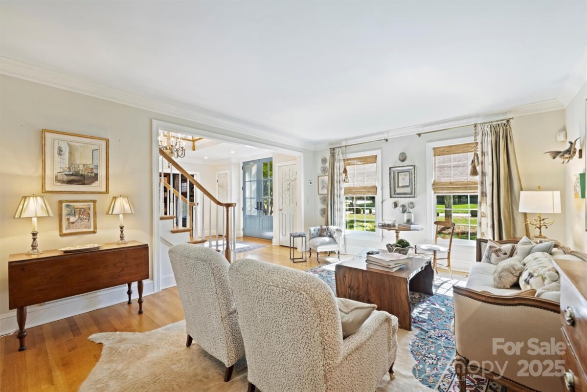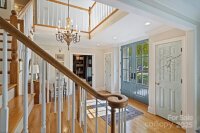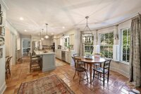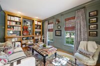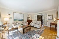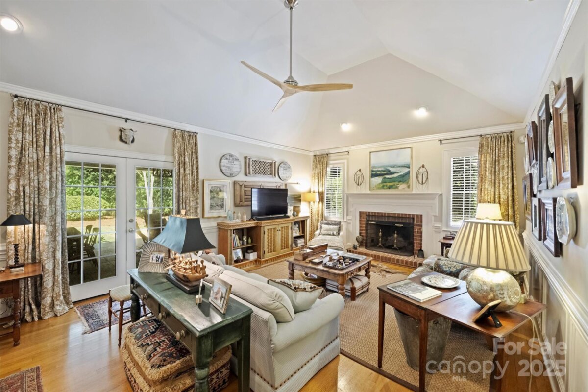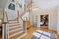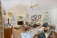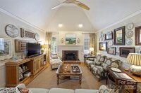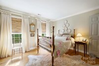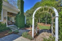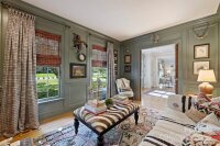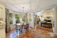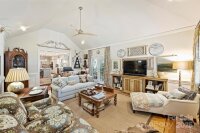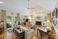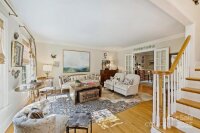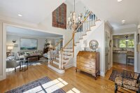 Welcome to the exceptional property set on .56 acre beautifully landscaped lot with a private, serene backyard. Step inside through the bright, welcoming foyer, featuring 3 hand-painted closet doors on either side of the entry and one near the kitchen for storage. Throughout the home, quarter-sawn hardwood floors add warmth, durability and craftsmanship. To the right, a powder room and private study (with pocket doors), offer convenience and a quiet workspace. To the left, the living room flows effortlessly into the dining room with French doors, creating ideal spaces for gatherings. At the heart of the home lies the kitchen, featuring an oversized mother-of-pearl quartzite countertop, Mexican Saltillo tiled floors, and a charming breakfast nook framed by bay windows looking over the private backyard. Adjacent to the kitchen is the expansive bonus/ family room with vaulted ceiling and fireplace. French doors lead to the covered vaulted porch with a fireplace and antique pine- wrapped beams; extending your living space to year-round outdoor enjoyment. (think morning coffee and nighttime dinners). Bamboo shades or plantation shutters on majority of windows. Upstairs a spacious mezzanine leads to the primary suite, complete with a jacuzzi tub and separate shower. Three additional bedrooms and a full bath, along with a convenient hall closet, complete the upper level. An extended driveway leads to a spacious 2 car garage including storage space and easy access. Inside, a drop zone with washer and dryer and office desk sits conveniently off the kitchen. The crawlspace has a concrete floor! This thoughtfully designed home combines elegance, comfort, and functionality in a peaceful, beautifully maintained setting. A must see!