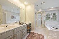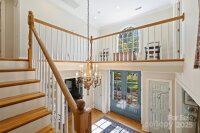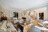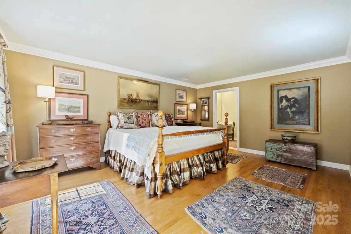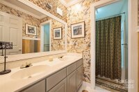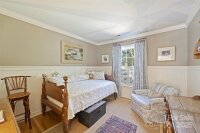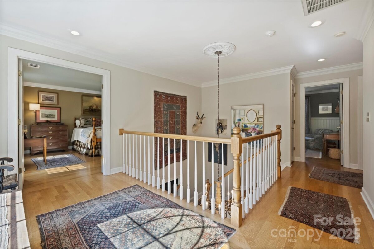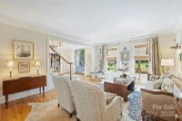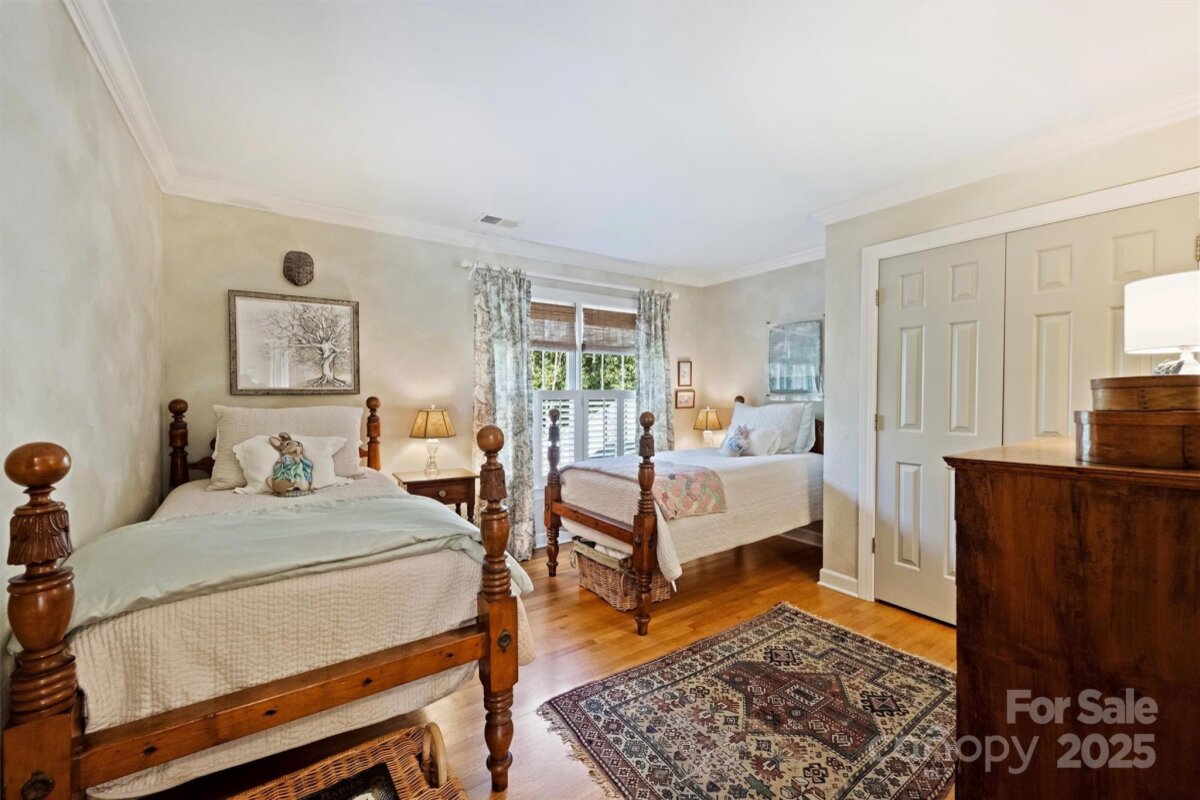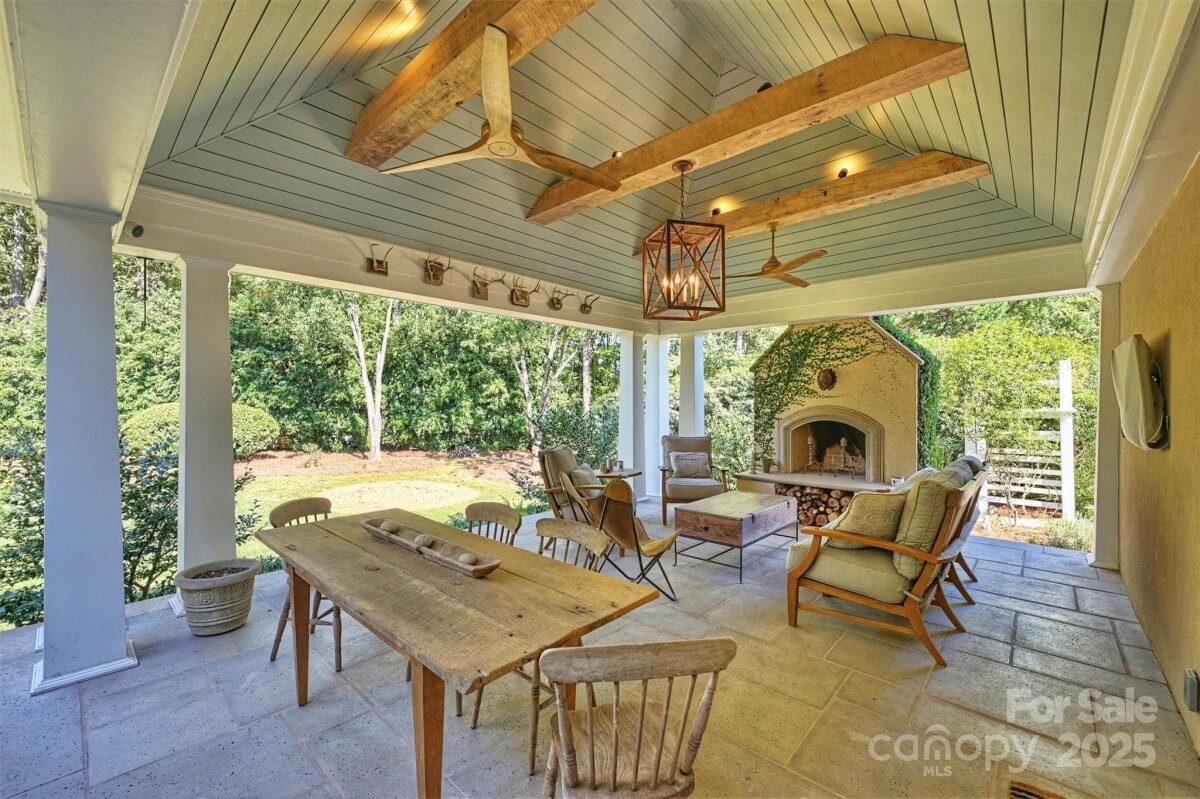 Welcome to the exceptional property set on .56 acre beautifully landscaped lot with a private, serene backyard. Step inside through the bright, welcoming foyer, featuring 3 hand-painted closet doors on either side of the entry and one near the kitchen for storage. Throughout the home, quarter-sawn hardwood floors add warmth, durability and craftsmanship. To the right, a powder room and private study (with pocket doors), offer convenience and a quiet workspace. To the left, the living room flows effortlessly into the dining room with French doors, creating ideal spaces for gatherings. At the heart of the home lies the kitchen, featuring an oversized mother-of-pearl quartzite countertop, Mexican Saltillo tiled floors, and a charming breakfast nook framed by bay windows looking over the private backyard. Adjacent to the kitchen is the expansive bonus/ family room with vaulted ceiling and fireplace. French doors lead to the covered vaulted porch with a fireplace and antique pine- wrapped beams; extending your living space to year-round outdoor enjoyment. (think morning coffee and nighttime dinners). Bamboo shades or plantation shutters on majority of windows. Upstairs a spacious mezzanine leads to the primary suite, complete with a jacuzzi tub and separate shower. Three additional bedrooms and a full bath, along with a convenient hall closet, complete the upper level. An extended driveway leads to a spacious 2 car garage including storage space and easy access. Inside, a drop zone with washer and dryer and office desk sits conveniently off the kitchen. The crawlspace has a concrete floor! This thoughtfully designed home combines elegance, comfort, and functionality in a peaceful, beautifully maintained setting. A must see!