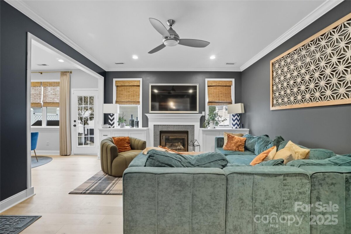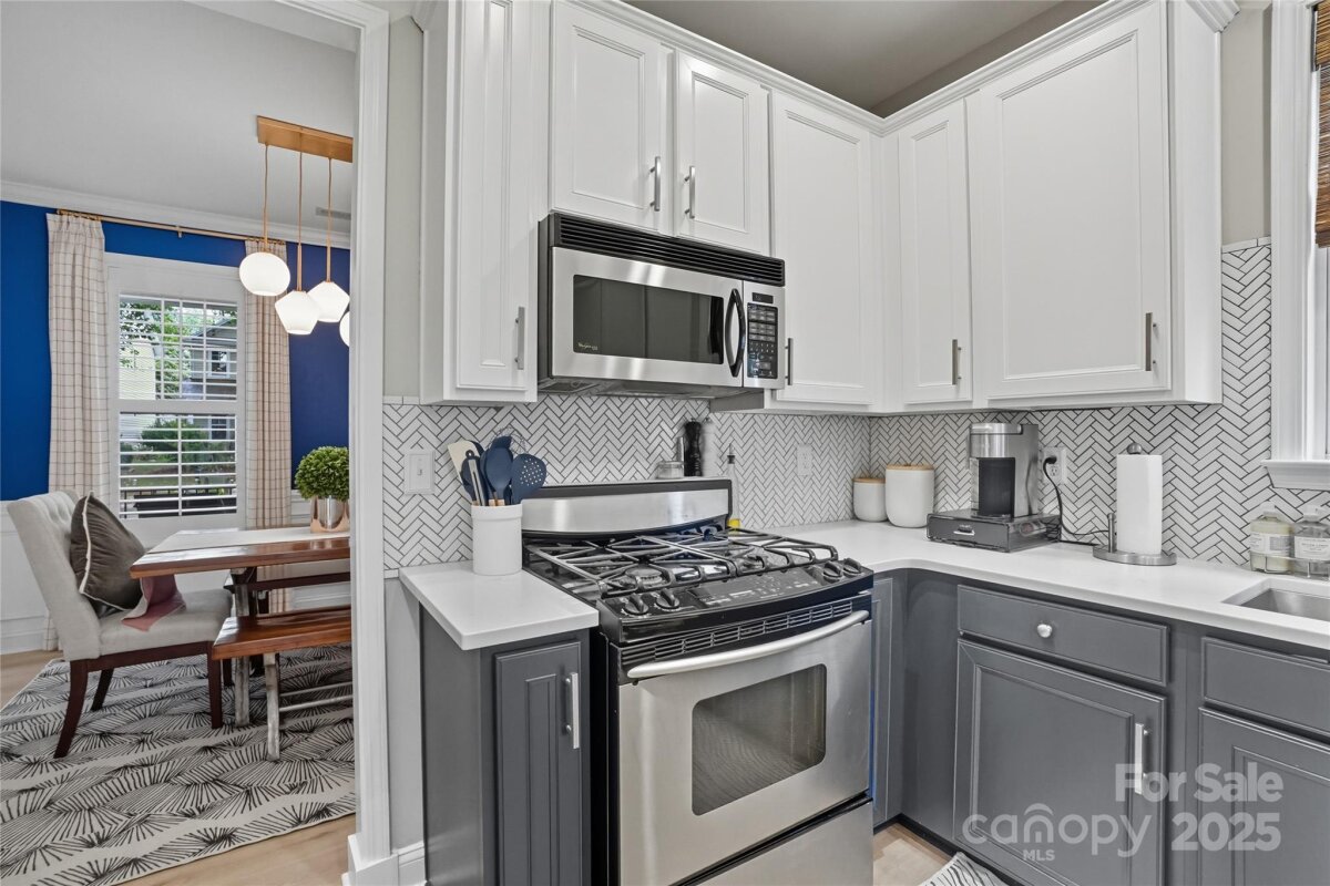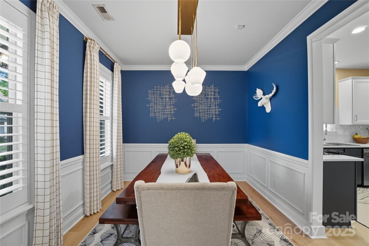 This beautifully maintained home on a corner lot is move-in ready and full of thoughtful upgrades inside and out. New HVAC!! Manufactured hardwood floors throughout, a spacious dining room with designer lighting, and custom window treatments, plus a cozy living room with crown molding, a gas fireplace, media cabinet, and tall ceilings. The kitchen is a true highlight with granite countertops, tile backsplash, stainless steel appliances including a gas range, pendant and recessed lighting—perfect for both everyday living and entertaining. Upstairs, large primary suite with vaulted ceilings and custom fixtures. The remodeled primary bath includes an upgraded tiled shower with a semi-frameless glass door. Additional attic storage with easy access. Outside, the backyard oasis features a 6-ft privacy fence, professionally installed concrete pavers, lush landscaping, a tranquil waterfall feature, and a storage shed. NO grass to cut in back as the yard is astroturf! The detached garage is insulated, drywalled, and ideal for a workshop or studio. All of this in the desirable Caldwell Station neighborhood, known for its charm and community feel. Five minute walk to the community pool center! This one won’t last!
