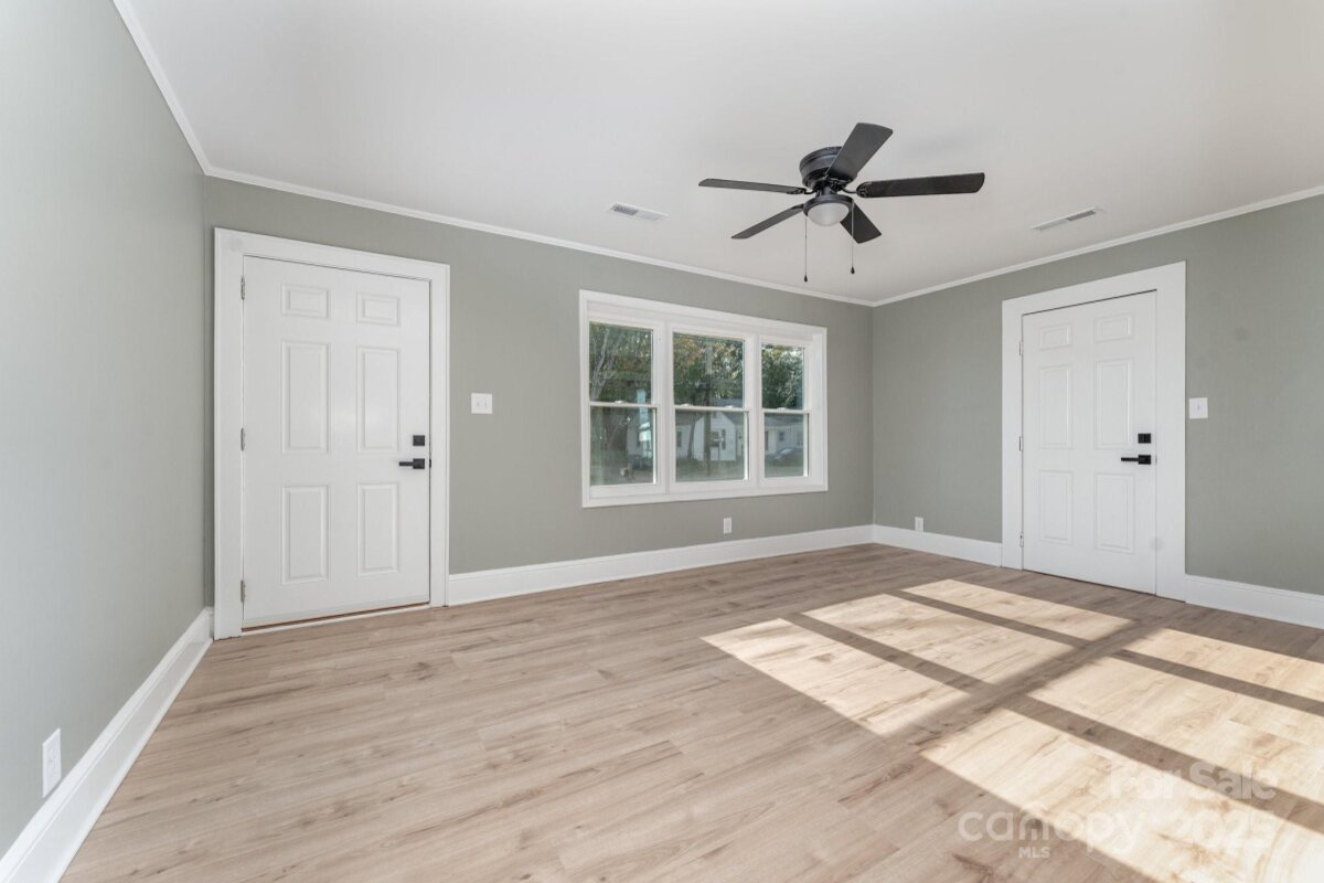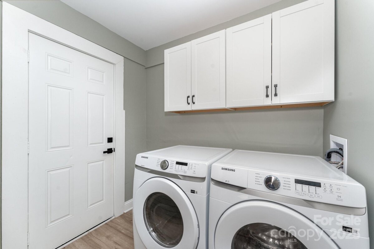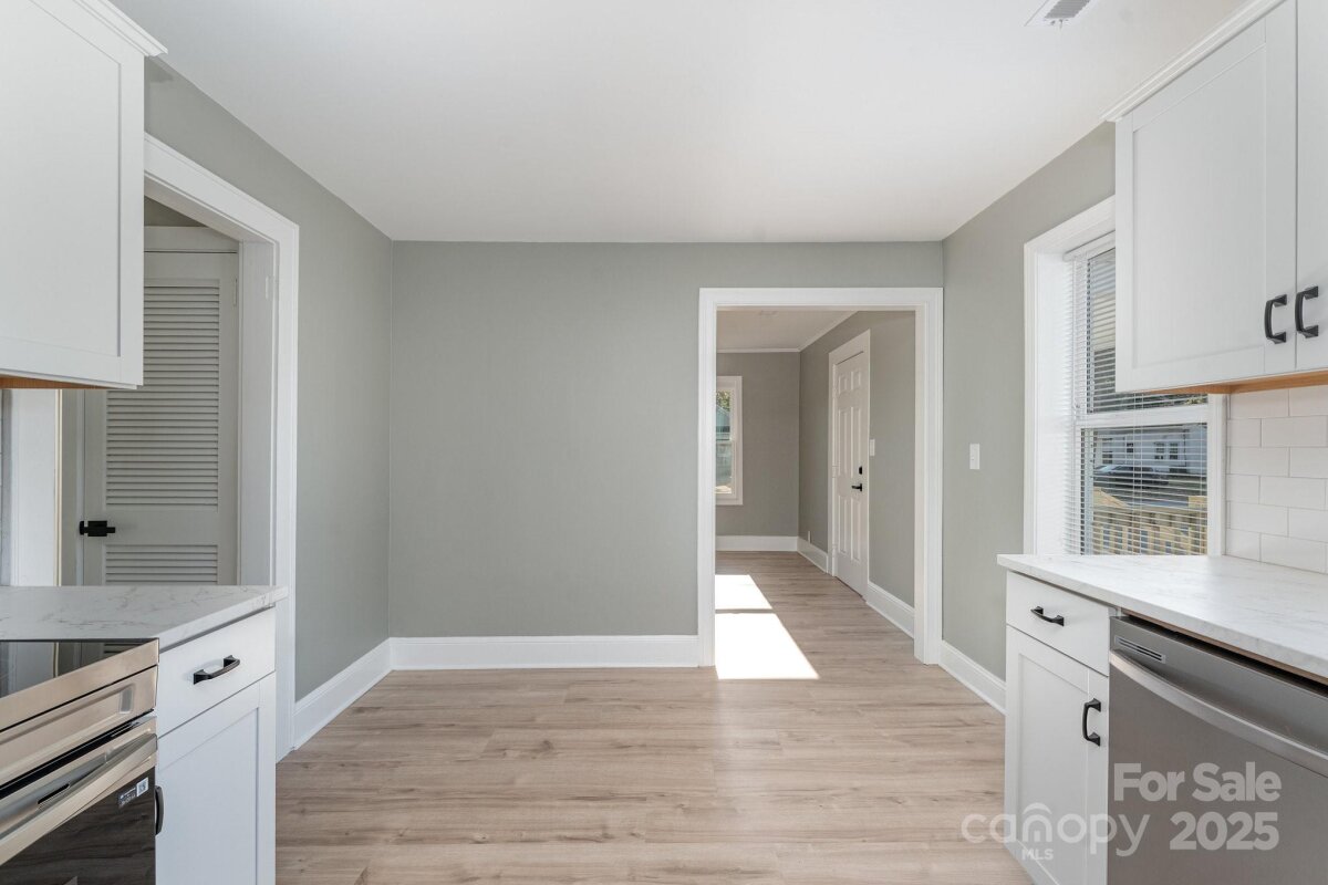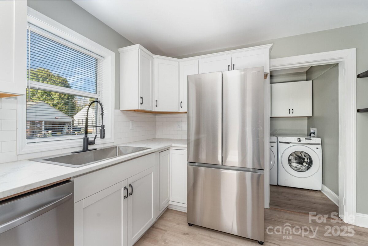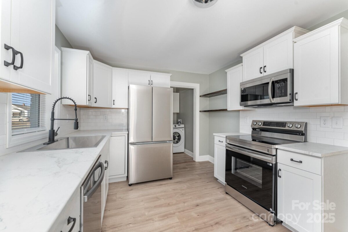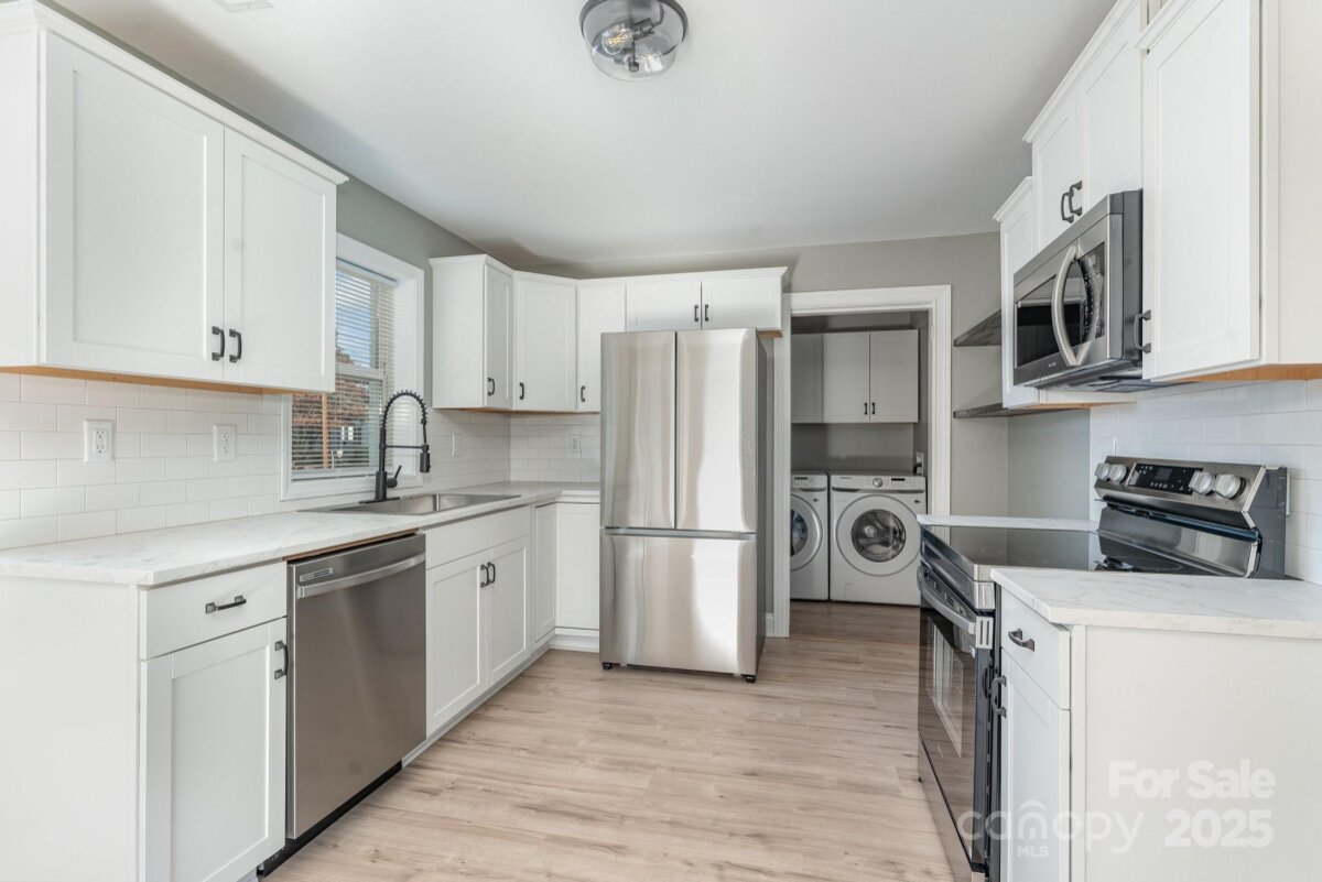 Beautifully renovated 2BR/1BA home in the heart of Lexington featuring a stunning kitchen with new cabinets, countertops, subway tile backsplash, custom shelving, pull-down faucet sprayer, and all-new stainless steel Samsung appliances: dishwasher, smooth-top stove, microwave, and front-load washer & dryer. Bathroom features new vanity, toilet, and linen pantry. Enjoy new HVAC, updated electrical and plumbing, luxury vinyl plank flooring throughout. Fresh paint, new lighting, ceiling fans, and new hardware. A bonus room offers space for an office, gym, or walk-in closet. New vinyl siding, black gutters, porch railings, painted brick, and new front door. Corner lot with concrete pad ideal for parking or patio. Seller is a licensed NC Broker & General Contractor offering $2,000 closing cost credit by Nov 8, 1-year home warranty and 1 point reduction with preferred lender. Lender offering appraisal credit as well!! Excellent Airbnb or rental potential recent comps show strong investor value! FHA, VA and NCHFA accepted.