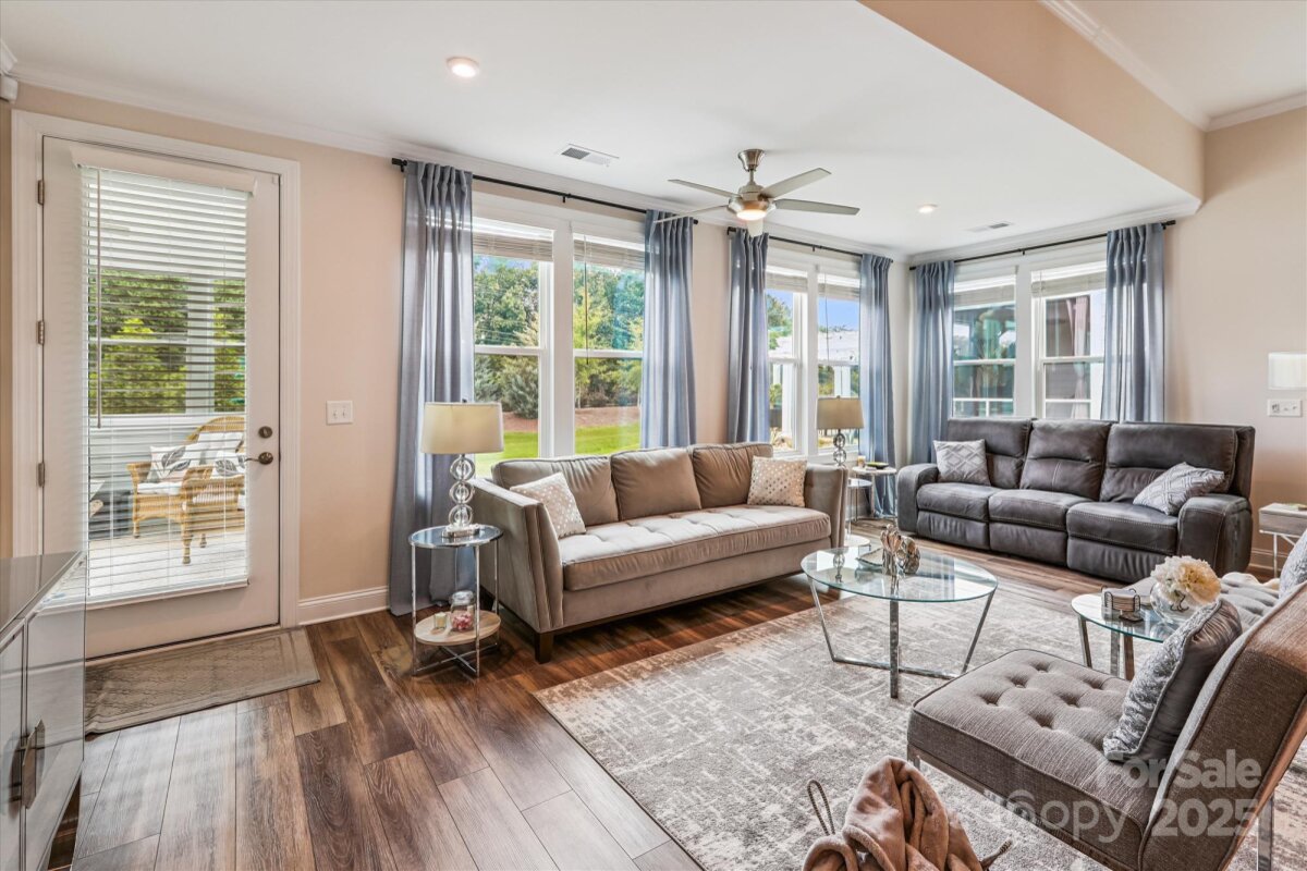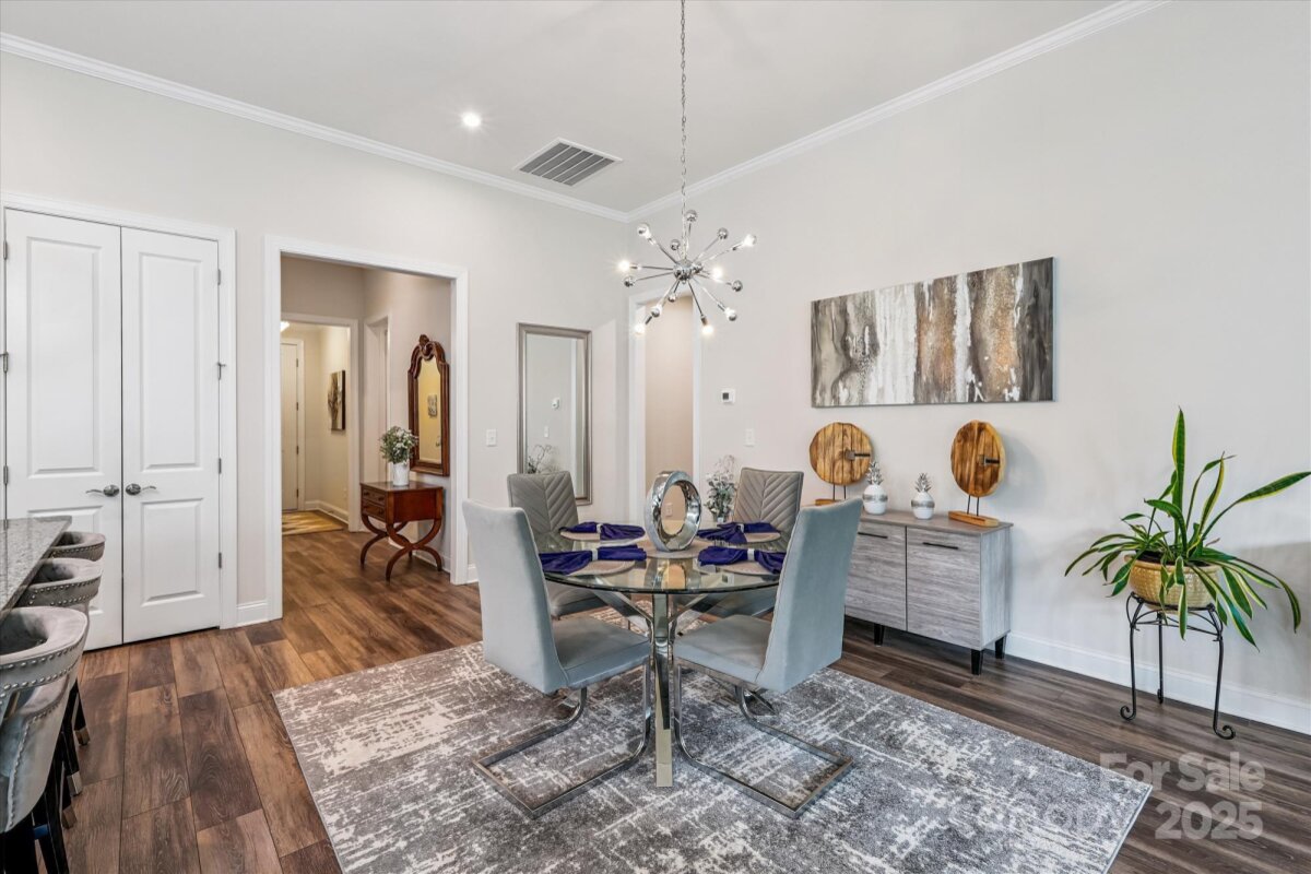 This impeccably designed 2-bedroom, 2-bath residence offers a seamless fusion of modern comfort and timeless elegance. Every detail from the thoughtful layout to the refined finishes has been curated to elevate your lifestyle in a space that feels both fresh and enduring. Step inside to discover graceful crown moulding that frames most rooms, adding a layer of sophistication to the open-concept design. The expansive great room is bathed in natural light and transitions effortlessly to a covered lanai, featuring durable polyurethane flooring perfect for year-round enjoyment and effortless entertaining. The kitchen is a culinary haven, outfitted with stainless steel appliances, a gas range, granite countertops, and abundant cabinetry that balances style with function. Both full baths are tastefully appointed, offering comfort and convenience. A spacious two-car garage completes the home, providing generous storage and everyday ease. Ideally located near shopping, dining, and Hwy 485, this residence is a true gem crafted with care, designed to impress, and ready to welcome you home. Close to restaurants, shopping, and I-485.