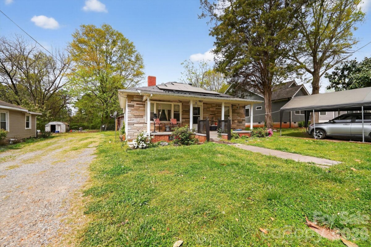 Charming 3BR home on an extra-deep double lot in Gastonia. Layout has a generous living room, three bedrooms, bath, laundry area, kitchen, and pantry. Interior is a mix of hardwood, vinyl and carpet. Roof is reported in good condition, HVAC is newer and operates well, and windows have been updated to tilt-in vinyl. Exterior features a back deck and multiple outbuildings; two sheds are usable. Solar panels are installed. Great option for investors or buyers looking to customize.