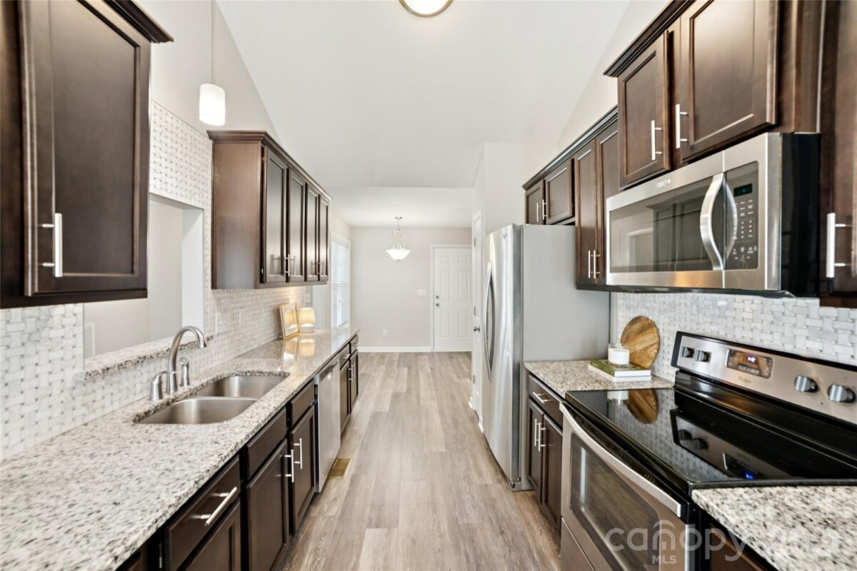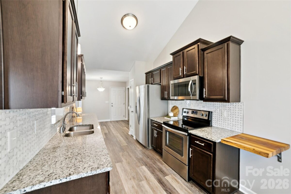 Welcome to this beautiful move-in ready ranch home in Stanley, NC, located in a quiet and desirable subdivision with no HOA. This one-story home offers modern finishes, an open layout, and thoughtful upgrades throughout. Step inside to find fresh neutral paint, durable LVP flooring, and a spacious great room featuring a cathedral ceiling and cozy fireplace with gas logs. The open-concept design flows into the kitchen and dining area, perfect for everyday living and entertaining. The kitchen features granite countertops, modern cabinetry, stainless steel appliances, and a functional layout with plenty of prep space. Granite countertops continue into the bathrooms for a cohesive, upgraded feel. The primary suite provides a comfortable retreat with a walk-in closet and private bath, while two additional bedrooms offer flexibility for guests, a home office, or hobbies. Enjoy outdoor living with a backyard retreat featuring wood decking and a unique stock tank plunge pool—perfect for cooling off and relaxing. The garage includes high ceilings, epoxy flooring, EV Charger and convenient attic pull-down access for additional storage. Additional highlights include a tankless water heater, city water and sewer, and a nice yard with room to enjoy the outdoors. Refrigerator plus washer and dryer convey. Conveniently located near shopping, dining, and major routes, this home offers easy access to Gastonia, Mount Holly, and Charlotte while maintaining a peaceful neighborhood feel. Don’t miss this opportunity to own a move in ready ranch home with modern upgrades and no HOA in up and coming Gaston county!