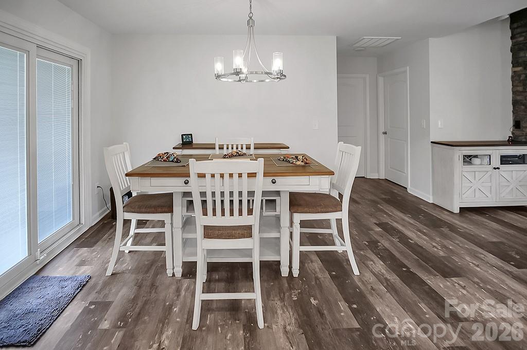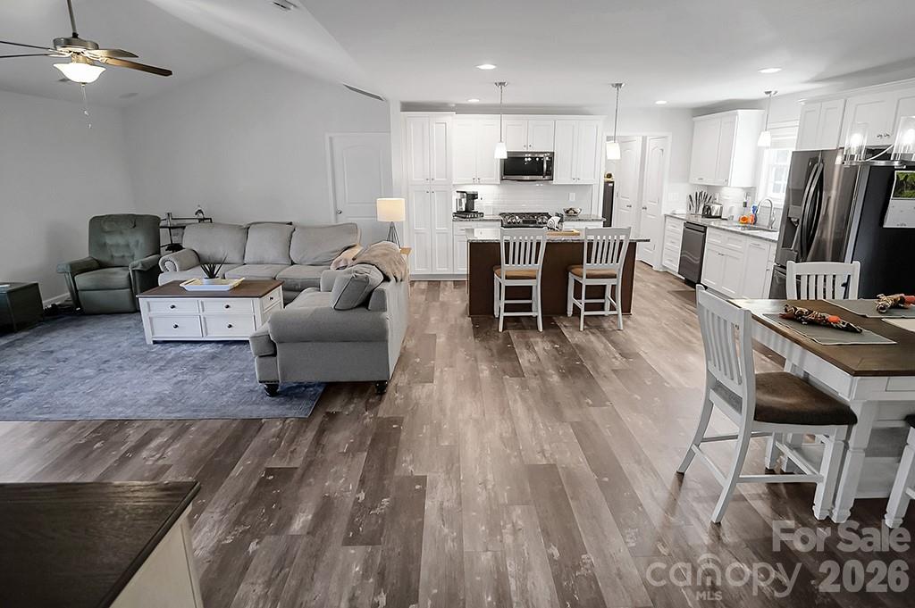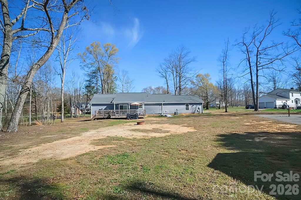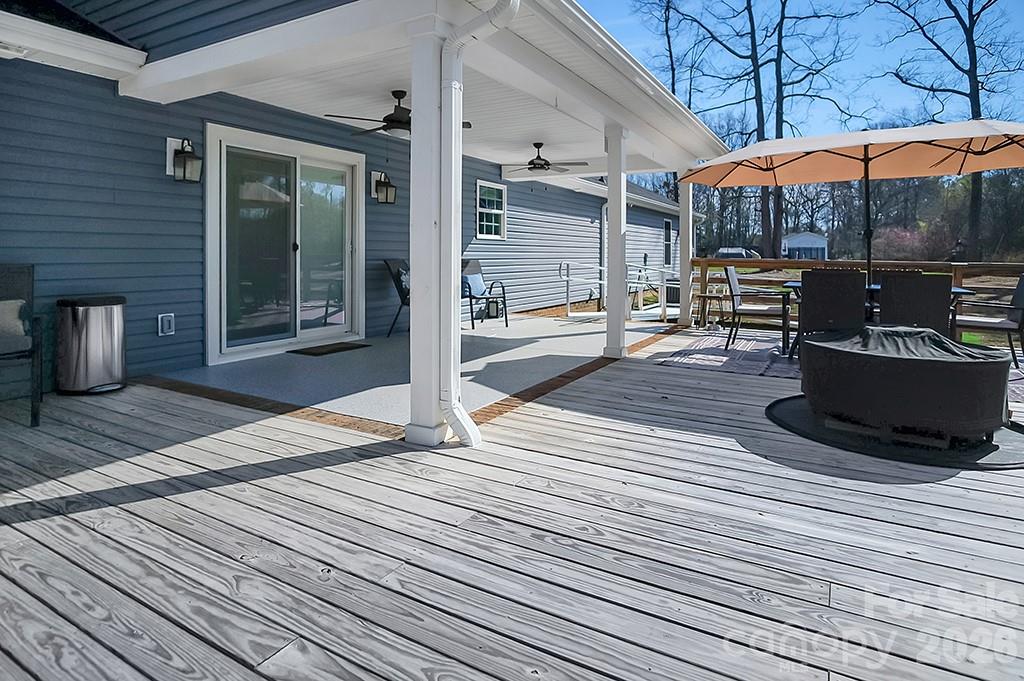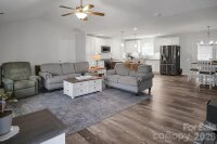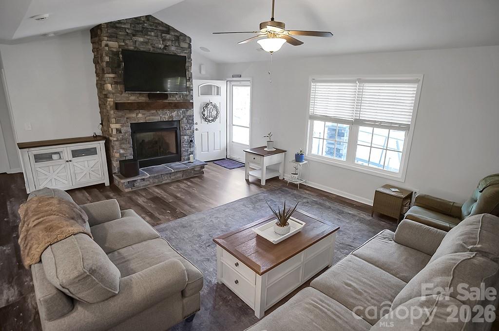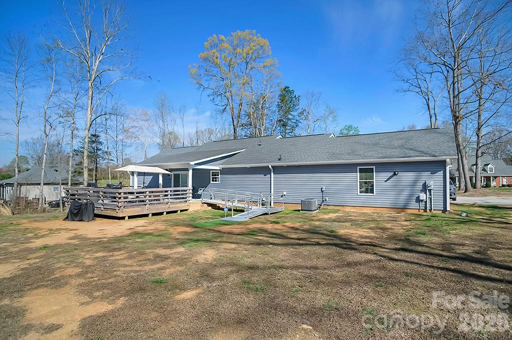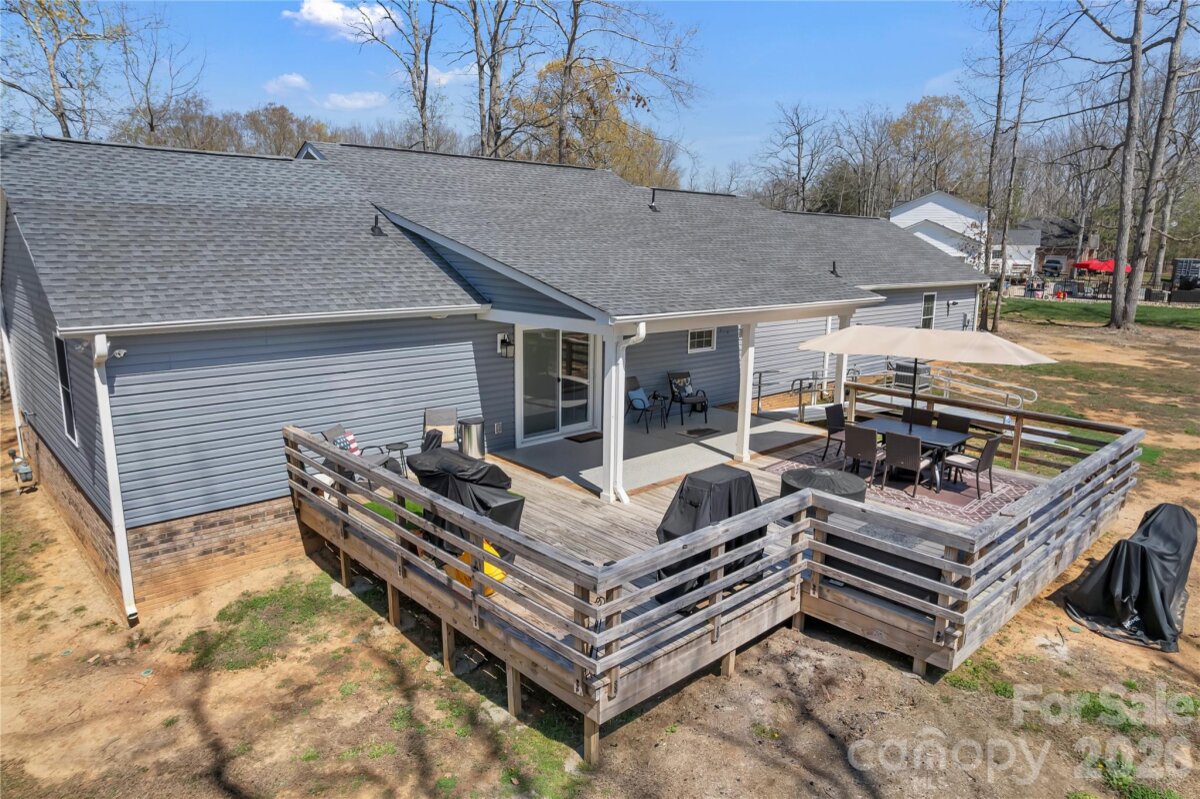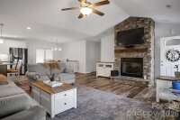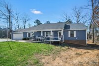 Located in a desirable Cherryville neighborhood, this beautifully designed single-level home offers the perfect blend of space, style, and functionality on a generous 1+ acre lot. Featuring a split-bedroom, open-concept layout with 3 bedrooms and 2.5 baths, this home is ideal for both everyday living and entertaining. Enjoy quiet mornings on the rocking chair front porch or unwind out back on the covered patio and attached deck overlooking a spacious yard complete with an outbuilding. A paved slab with RV hookups—including electric, water, and septic—adds incredible versatility. Inside, LVP flooring flows throughout with tile in primary bathroom. The stunning eat-in kitchen showcases white cabinetry, granite countertops, a large island, and stainless steel appliances including a gas range, dishwasher, and mounted microwave. The living room is anchored by a floor-to-ceiling stone fireplace with a wood mantle. A hallway connecting to the 2-car garage includes a convenient laundry area and a half bathroom. The spacious primary suite features a walk-in closet, dual vanity, and a custom tile shower with seamless glass. Two additional bedrooms share a well-appointed full bath with stand-up shower. Home is designed for handicap accessibility. A rare find combining comfort, upgrades, and outdoor amenities!