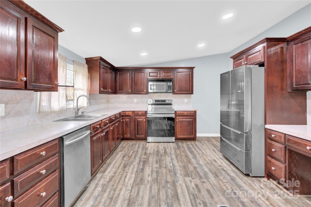 Welcome home! This well maintained 3 bedroom, 2 bath home is situated on a beautiful .57 acre lot and features an open floor plan with a desirable split-bedroom layout. LVP flooring runs throughout the home. The spacious kitchen offers ample cabinet and counter space, built ins & a breakfast bar. The primary suite includes a dual vanity, a relaxing garden tub, and a newly tiled shower. Enjoy outdoor living on the covered back deck overlooking the fully fenced in backyard. Major updates include brand NEW ROOF 2025 and HVAC 2022. Conveniently located near Troutman, Statesville & Catawba. This move in ready home offers comfort, privacy & NO HOA!