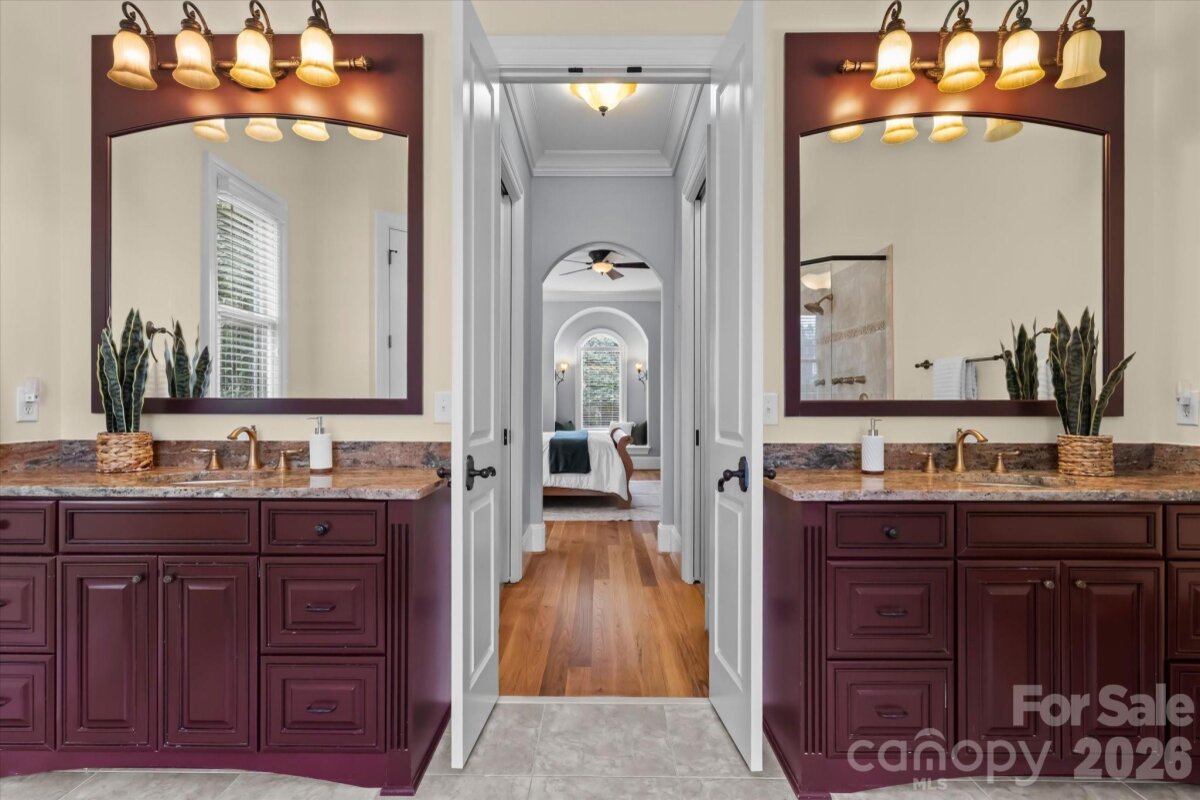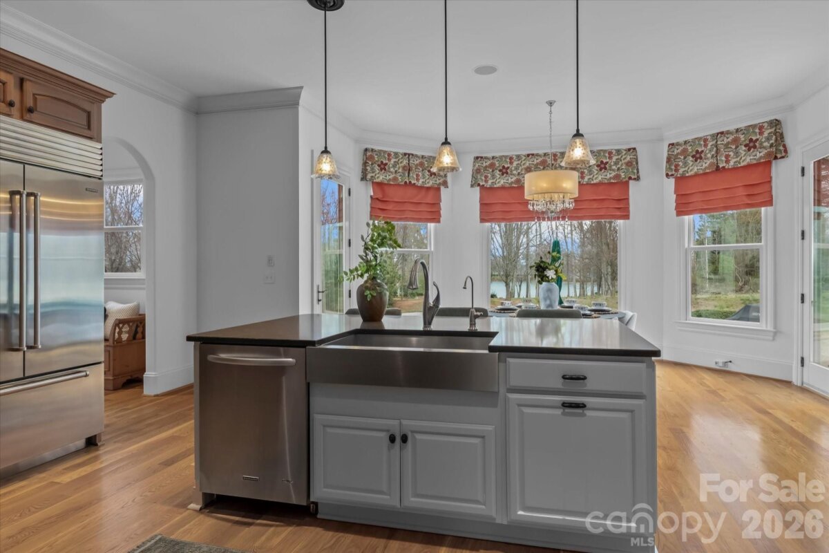 Elegant custom home by Arcadia Builders on 1.3 private acres with views of Lake Norman. Tucked away on a quiet cul-de-sac, this beautifully crafted residence offers 4 bedrooms with a main-level primary suite and timeless design throughout. The spacious kitchen features new stainless steel appliances, granite countertops, abundant cabinetry, a center island, and a sunny breakfast area, perfect for everyday living and entertaining. A butler’s pantry and large walk-in pantry provide exceptional storage and functionality. The primary suite on the main level offers a relaxing retreat with a spa-like bath featuring a garden tub, separate shower, and dual vanities. Thoughtfully designed living spaces include an office and dining room with French doors opening onto a charming Southern-style front porch. Upstairs, you’ll find three additional bedrooms, a family/media room, a built-in desk nook perfect for work or study, and a large entertainment or bonus room with its own private bath, offering flexible space for guests, recreation, or multi-generational living. The rear of the home captures beautiful views of Lake Norman and a large space for a pool. Recent improvements include a newer roof and a spacious 3-car garage with a newly finished epoxy floor and abundant storage. Set on 1.3 acres in a private cul-de-sac setting, this elegant home offers the perfect blend of space, craftsmanship, and Lake Norman lifestyle, just minutes from Mooresville shopping, dining, and lake access. There is access to a boatslip with lift located in Pier T.