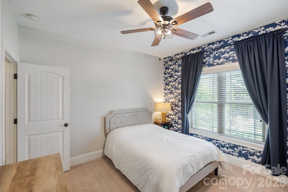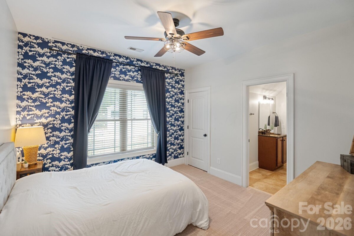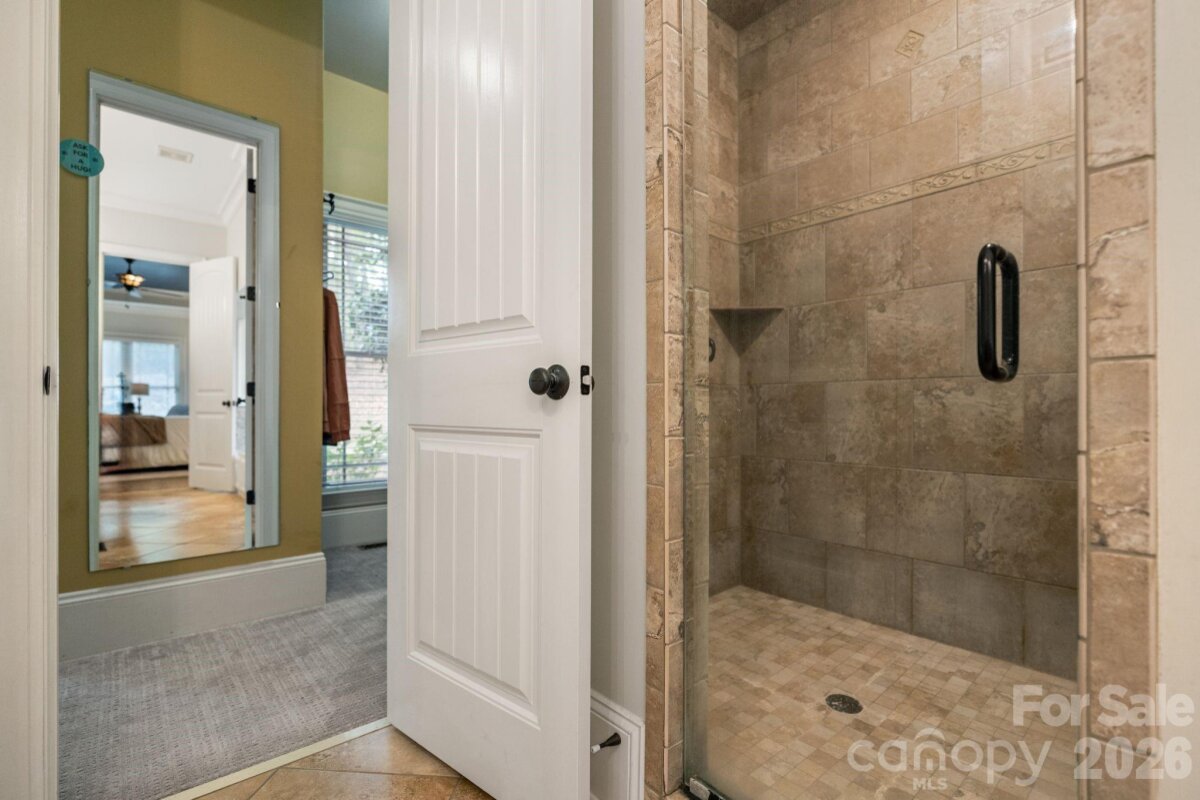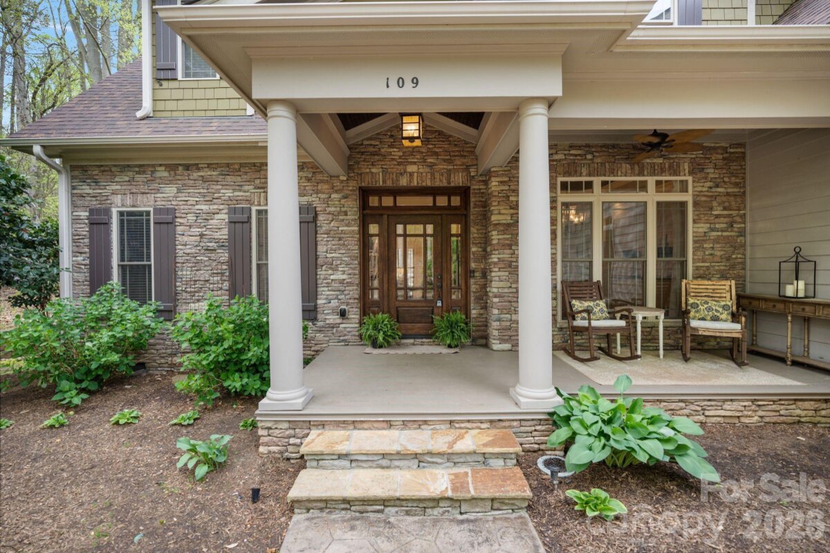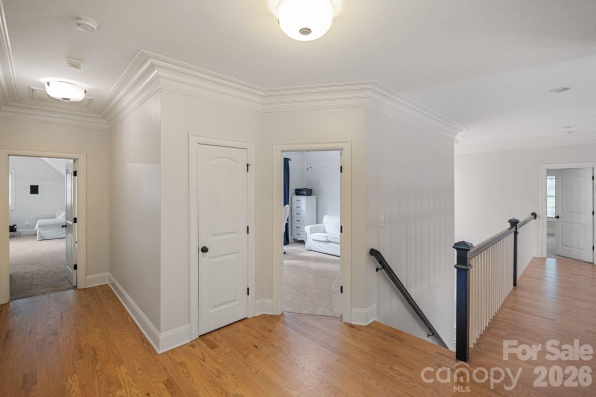 A rare offering of privacy and refinement, this exceptional property includes both the home site and an adjoining lot—together creating over 2 acres of beautifully wooded seclusion. Designed with elegance and comfort in mind, the home welcomes you with abundant natural light and a flowing open-concept layout. A dramatic two-story great room, highlighted by a soaring ceiling and open upper-level overlook, features a fireplace and creates a stunning focal point for both everyday living and entertaining. A separate cozy den with its own fireplace offers an intimate retreat. At the heart of the home, the chef’s kitchen is anchored by a large center island and opens effortlessly to the main living spaces, ideal for gathering and hosting. The main-level primary suite is a true sanctuary, generously sized and complemented by a luxurious en-suite bath featuring a soaking tub. Laundry on the main floor adds convenience to the home’s thoughtful design. Upstairs, you’ll find three spacious secondary bedrooms—each with its own private en suite bath, offering exceptional comfort and privacy. In addition, two versatile bonus/flex spaces provide endless possibilities for a media room, home gym, playroom, or additional work-from-home areas—one of which includes a closet and is currently utilized as an office. The home offers 4 full baths and 1 half bath, providing ample accommodation for both everyday living and guests. Recent upgrades include new carpet and refinished hardwoods (2025), as well as a new roof and gutters with gutter guards (2024). Additional features such as surround sound, a whole-house water filtration system, and in-ground irrigation further enhance the home’s functionality and ease of living. Outdoor spaces are equally impressive, featuring a large deck, screened-in gazebo, and a charming front porch—perfect for rocking chairs and enjoying the peaceful natural surroundings. Complete with a 3-car garage and set within a quiet neighborhood, this property offers a rare blend of luxury, space, and privacy just moments from modern conveniences.