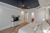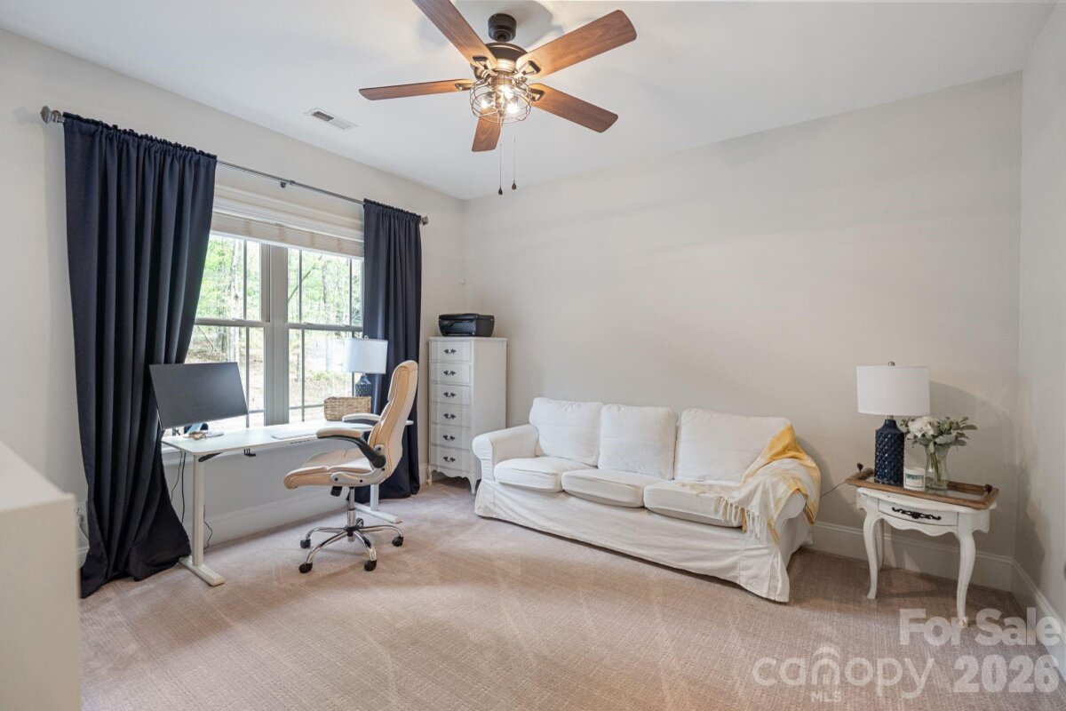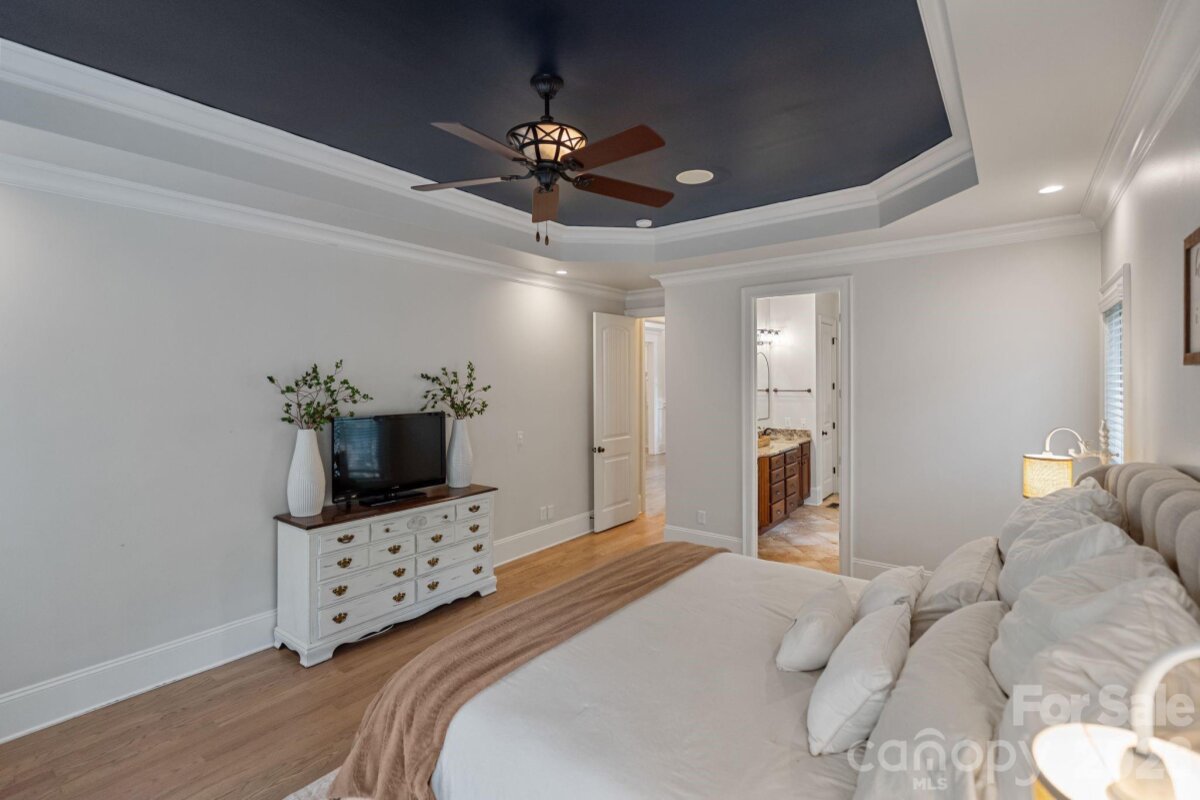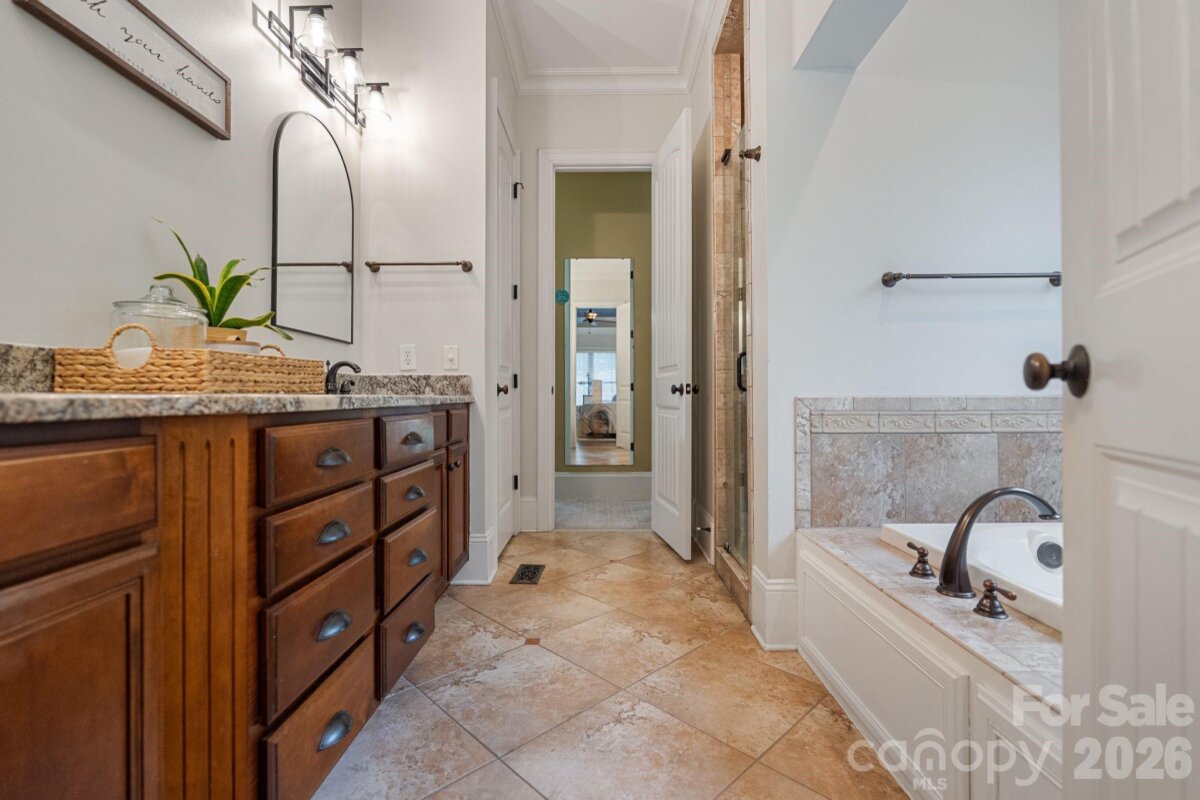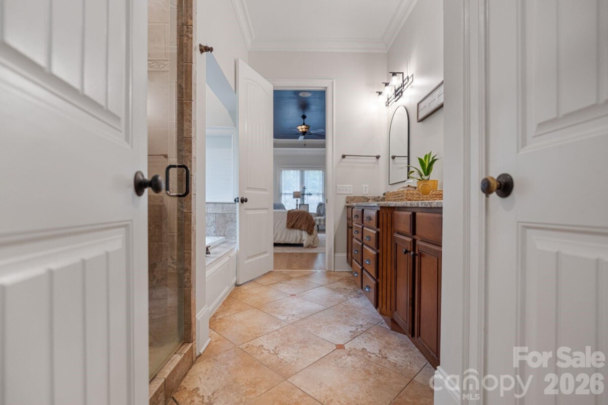 A rare offering of privacy and refinement, this exceptional property includes both the home site and an adjoining lot—together creating over 2 acres of beautifully wooded seclusion. Designed with elegance and comfort in mind, the home welcomes you with abundant natural light and a flowing open-concept layout. A dramatic two-story great room, highlighted by a soaring ceiling and open upper-level overlook, features a fireplace and creates a stunning focal point for both everyday living and entertaining. A separate cozy den with its own fireplace offers an intimate retreat. At the heart of the home, the chef’s kitchen is anchored by a large center island and opens effortlessly to the main living spaces, ideal for gathering and hosting. The main-level primary suite is a true sanctuary, generously sized and complemented by a luxurious en-suite bath featuring a soaking tub. Laundry on the main floor adds convenience to the home’s thoughtful design. Upstairs, you’ll find three spacious secondary bedrooms—each with its own private en suite bath, offering exceptional comfort and privacy. In addition, two versatile bonus/flex spaces provide endless possibilities for a media room, home gym, playroom, or additional work-from-home areas—one of which includes a closet and is currently utilized as an office. The home offers 4 full baths and 1 half bath, providing ample accommodation for both everyday living and guests. Recent upgrades include new carpet and refinished hardwoods (2025), as well as a new roof and gutters with gutter guards (2024). Additional features such as surround sound, a whole-house water filtration system, and in-ground irrigation further enhance the home’s functionality and ease of living. Outdoor spaces are equally impressive, featuring a large deck, screened-in gazebo, and a charming front porch—perfect for rocking chairs and enjoying the peaceful natural surroundings. Complete with a 3-car garage and set within a quiet neighborhood, this property offers a rare blend of luxury, space, and privacy just moments from modern conveniences.