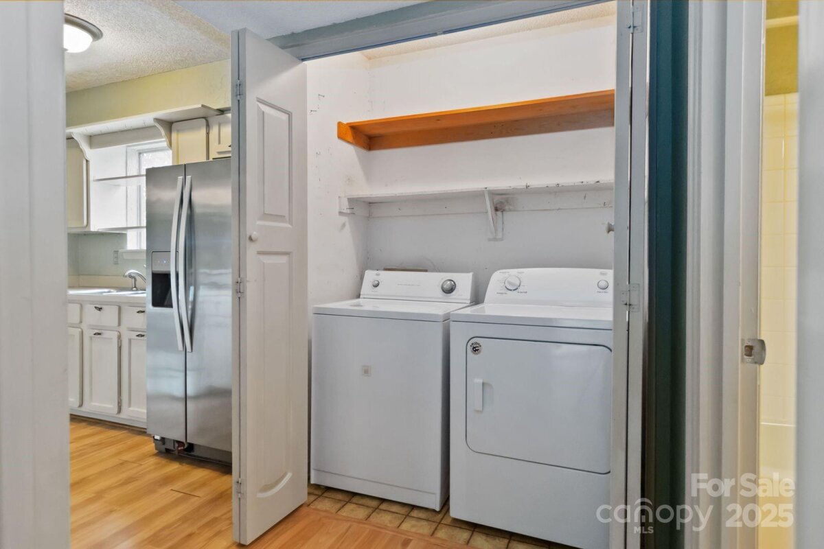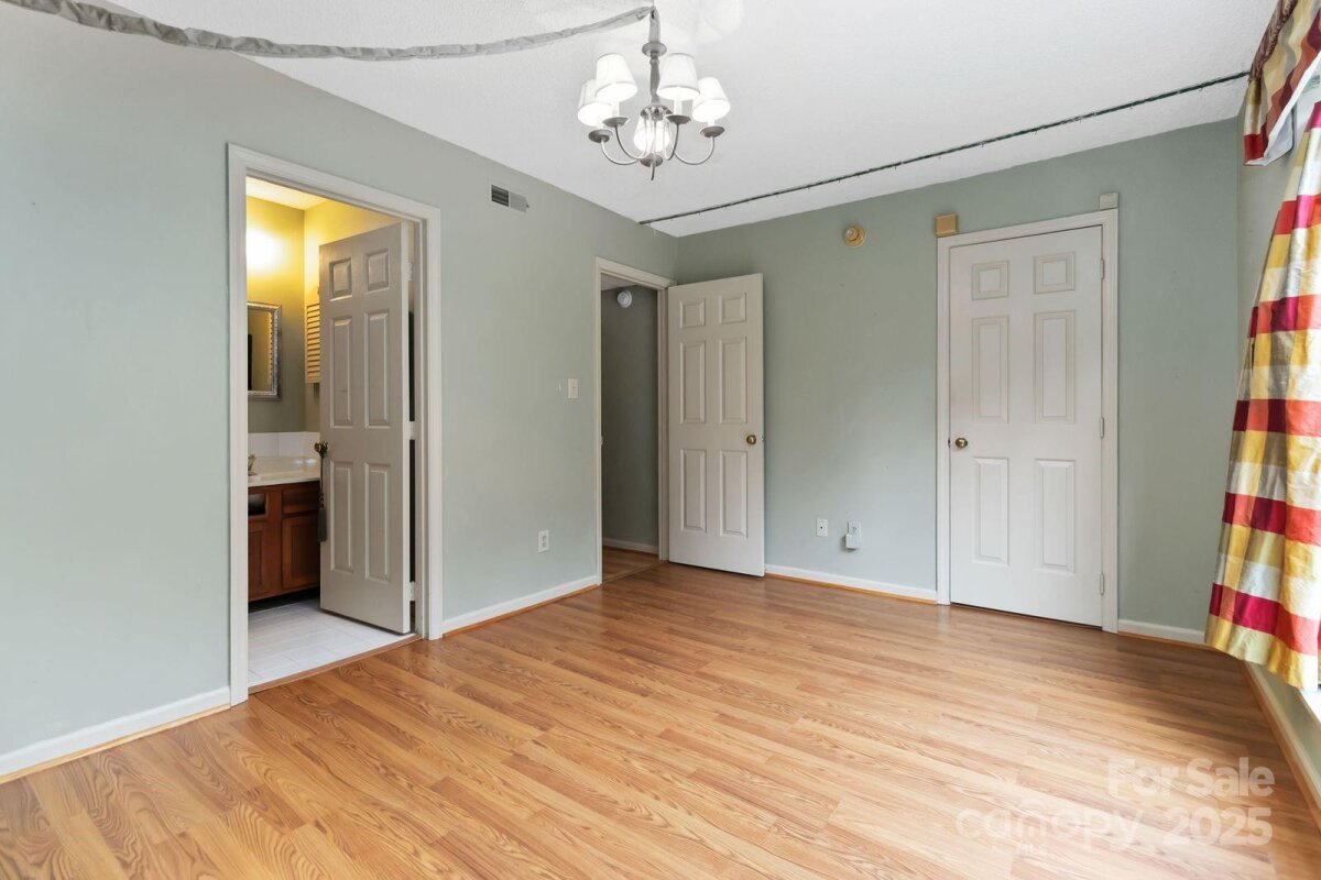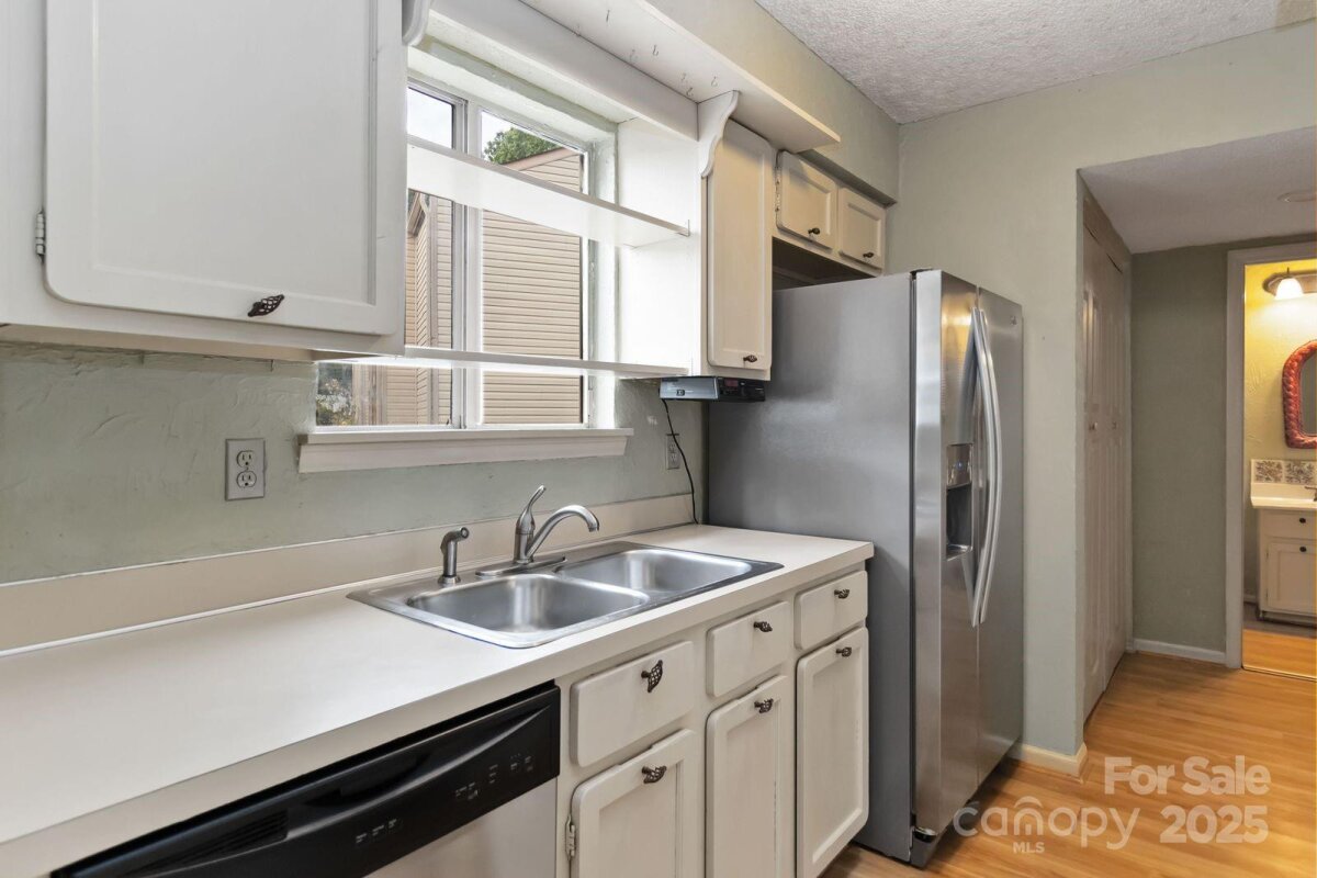 Spacious ground-floor condo offering 2 bedrooms and 2 full baths, each with direct access for privacy, generous walk-in closets, and plenty of storage. The kitchen features updated appliances including refrigerator, washer, and dryer, with a convenient passthrough to the open family room complete with a cozy wood-burning fireplace and custom built-ins. Laminate floors flow throughout, creating a clean, modern feel. Dual sliding glass doors open to a covered patio that backs to a private natural area, perfect for relaxing or entertaining outdoors. Additional storage room provides even more convenience. Both bedrooms have private bath access, making this home ideal for roommates, guests, or flexible living. Excellent location with easy access to Hwy 51 and I-485, just minutes from shopping, dining, and entertainment, and a short bike ride or walk to the greenway. A rare opportunity to enjoy comfort, convenience, and nature in one package!