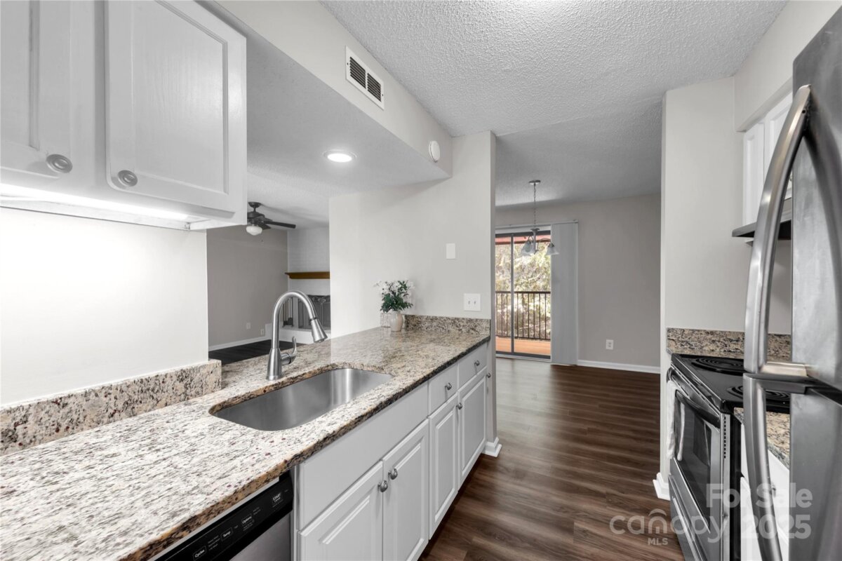 You must see this move-in ready end unit 2nd floor Condominium in Carmel Village II. The covered deck off of the Living Room and Dining Room offers a private view of the woods. The upgrades include granite countertops, stainless steel appliances, new vinyl plank flooring and paint give the unit a modern, fresh feel. This location in Carmel Village II offers a great combination of privacy with a wooded view, and also the convenience of being close to shops, dining, Uptown Charlotte, South Park, Ballantyne and 485. The neighborhood pool was just upgraded and is walkable from the unit. Special Assessments per month until Dec 31st, 2025 of $68.33 and $2.05 then back to $270.82 / month