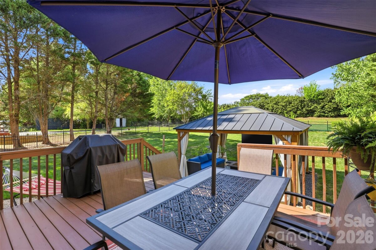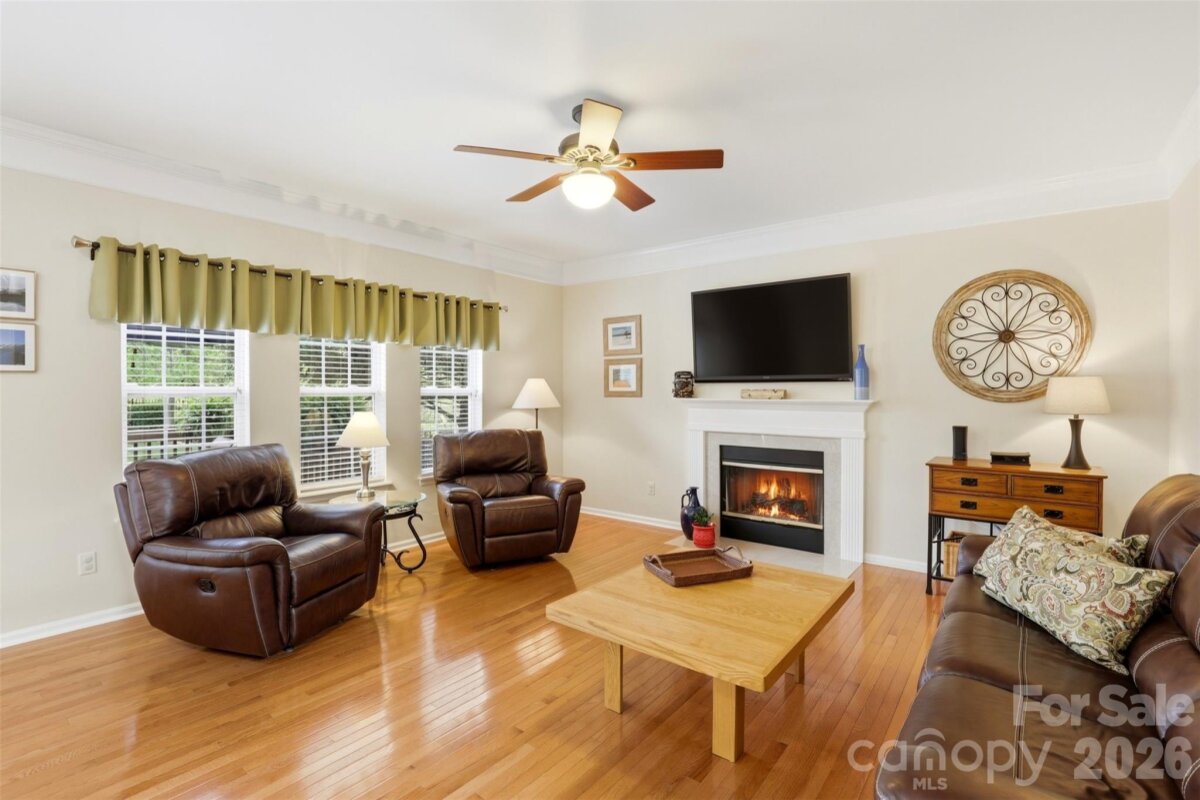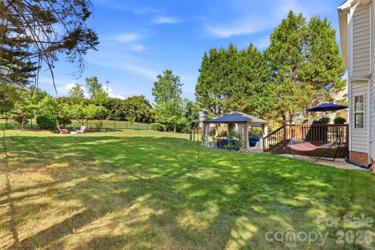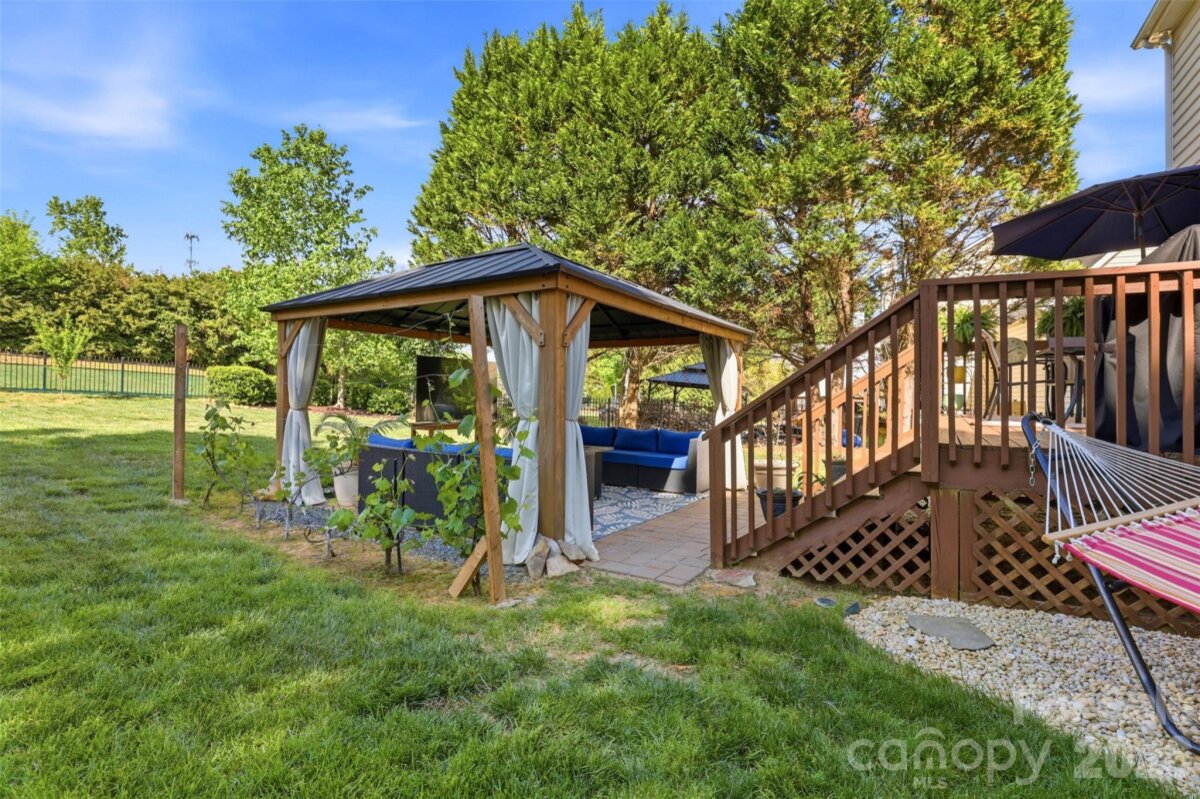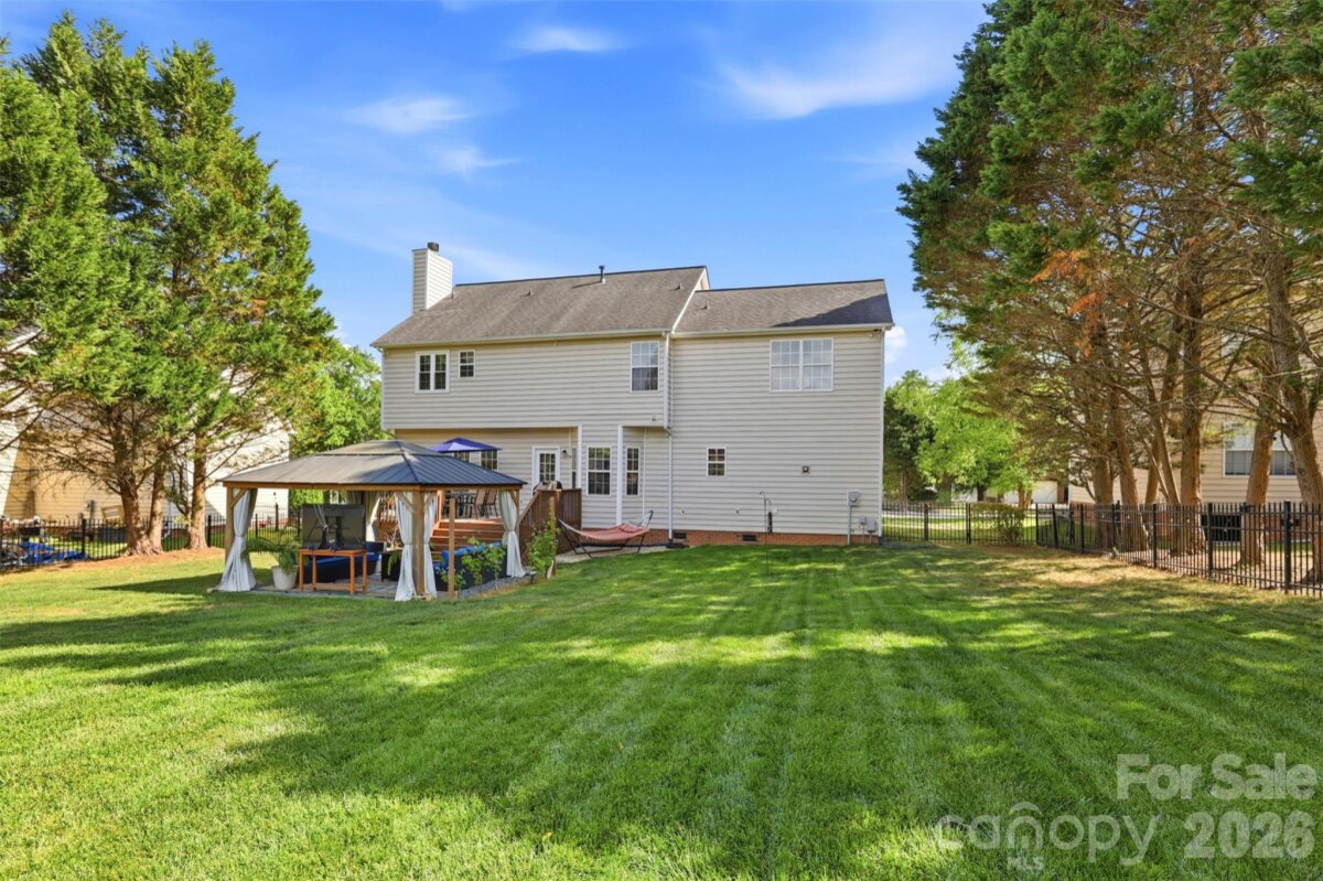 Welcome to this beautifully maintained four-bedroom home, where comfort, thoughtful updates, and an exceptional golf course setting come together in one of Mint Hill’s most sought-after communities. Perfectly positioned on a generous lot along the tee box of the 8th hole of Olde Sycamore Golf Plantation, this home offers a rare blend of privacy, scenic views, and effortless everyday living. Inside, updated flooring creates a crisp, cohesive aesthetic throughout, highlighted by rich wood floors in the living room and refreshed finishes on the stairs, hallway, and primary suite. The main living area is both warm and inviting, centered around a gas fireplace that serves as a natural focal point for relaxing evenings and comfortable gatherings. The kitchen is thoughtfully appointed with a Bosch dishwasher, a new cooktop, and a functional layout that flows seamlessly into the surrounding living spaces. The spacious primary suite offers a peaceful retreat, complemented by updated shower hardware. Secondary bedrooms are generously sized and share a well-appointed full bath. Pride of ownership is evident throughout, with features such as a vapor barrier installed in 2014 and a furnace equipped with an LED sanitizing light that has been routinely serviced—providing added peace of mind. The home also features built-in garage storage solutions. Outdoor living is where this property truly shines. A freshly painted deck overlooks a serene, tree-lined golf course backdrop, creating a private and tranquil setting. The 13' x 15' gazebo extends the living space outdoors, offering a shaded retreat ideal for dining and entertaining, while a fire pit enhances the home’s inviting, resort-like atmosphere. The landscaped and irrigated yard is both beautiful and productive, featuring mature peach and plum trees, along with established Concord and green grapevines—perfect for a true garden-to-table lifestyle. Residents enjoy access to an impressive array of community amenities, including a pool, clubhouse, tennis and pickleball courts, golf course, and driving range—supporting an active and connected lifestyle. Move-in ready and thoughtfully enhanced throughout, this home offers an exceptional balance of comfort, character, and elevated outdoor living in a premier location.