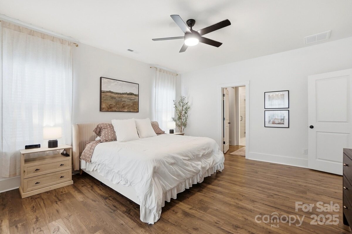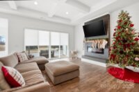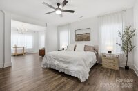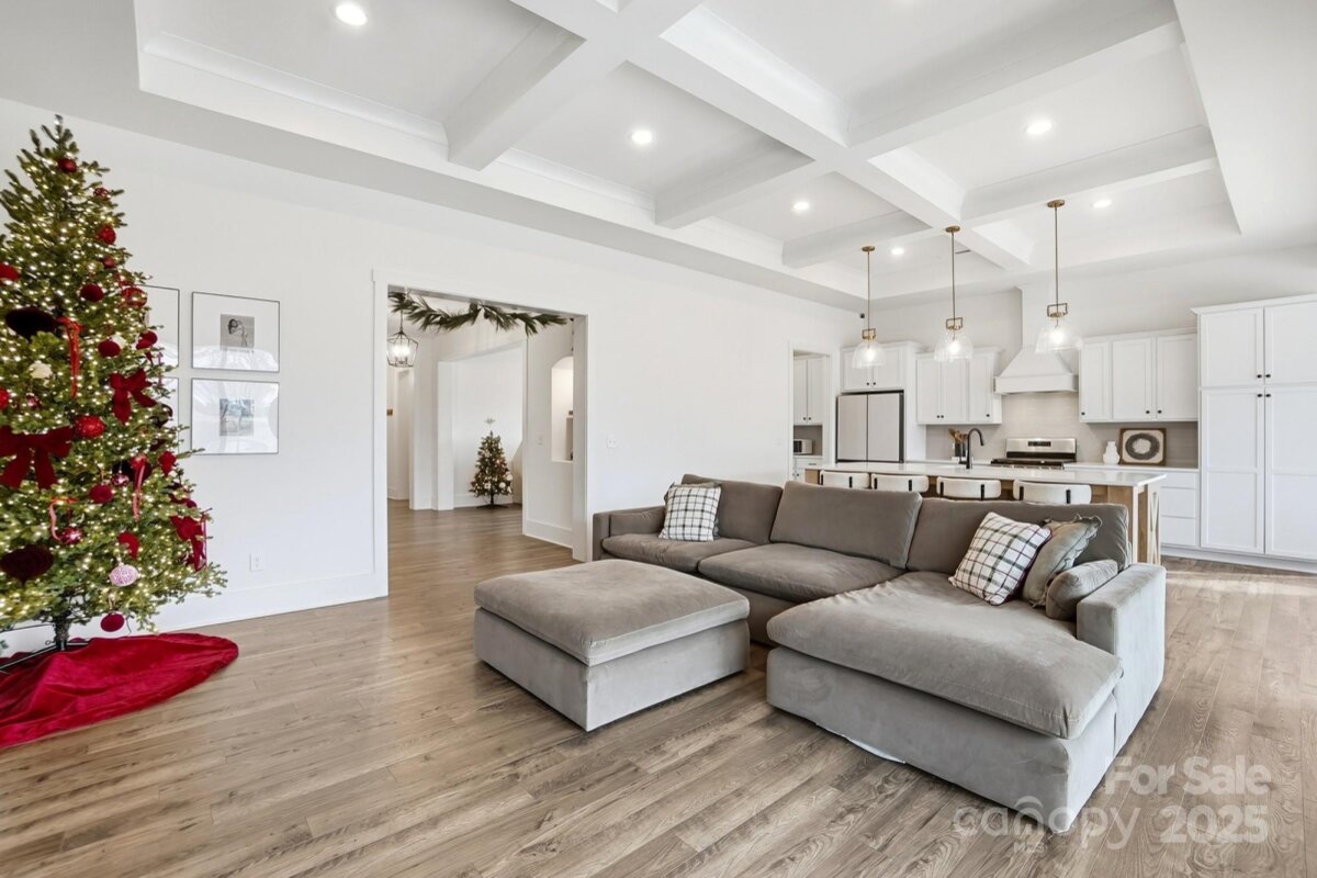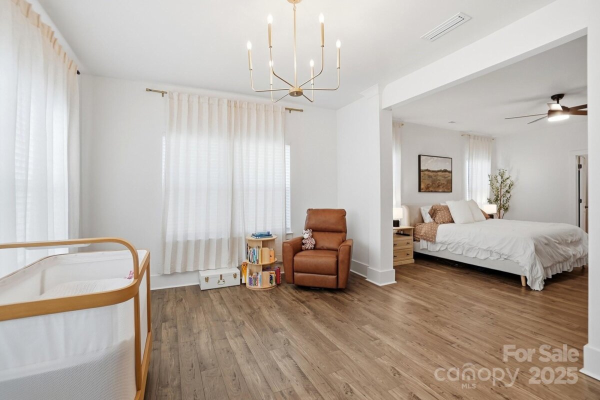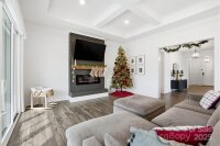 Amazing New Price!! Better than new, this gorgeous home has a welcoming rocking chair front porch sits on a beautiful corner lot on the golf course and is loaded with upgrades. Step into the dining room with crown molding that sets the tone for the rest of the home. The open family room features a raised ceiling with soffit detail, 8-inch beams with crown molding, extra can lights, and a 36-inch electric fireplace with shiplap surround. A two door, four panel sliding door with new shade opens from the family room to the screened porch, creating an easy flow for indoor and outdoor living. The kitchen offers an accented upgraded island, a custom hood over the stainless-steel gas stove, and an open floor plan that works perfectly for both everyday life and entertaining. Upgraded LVP runs throughout the main living areas, with tile flooring in all bathrooms. The expansive primary suite on the main level includes a large sitting area and a generous en suite bathroom with a 36x60 tiled shower with a 12-inch seat. A secondary bedroom at the front of the home has access to a full bath with a quartz vanity and tile flooring, ideal for guests or multigenerational living. Upstairs, there is another upgraded bedroom with its own full bath, also finished with a quartz vanity and tile flooring, offering a private retreat for guests or an older child. All lighting throughout the home has been thoughtfully upgraded for both style and function. Through the four-panel sliding door, enjoy the screened porch that opens to an extended patio and the beautifully positioned corner lot on the golf course. The sellers have invested over $37,000 in structural upgrades to this floor plan, plus a $20,000 lot premium, making this home truly stand out. All of this is close to the community clubhouse, and pool. This is one home that you absolutely do not want to miss.
