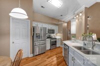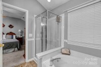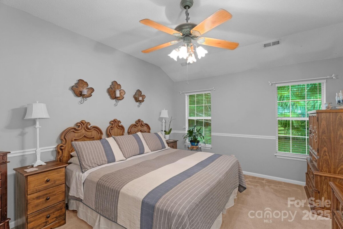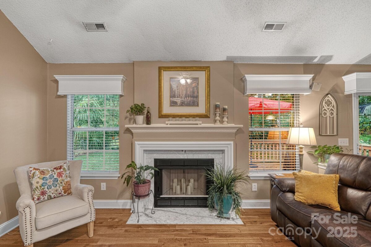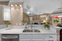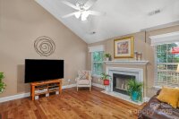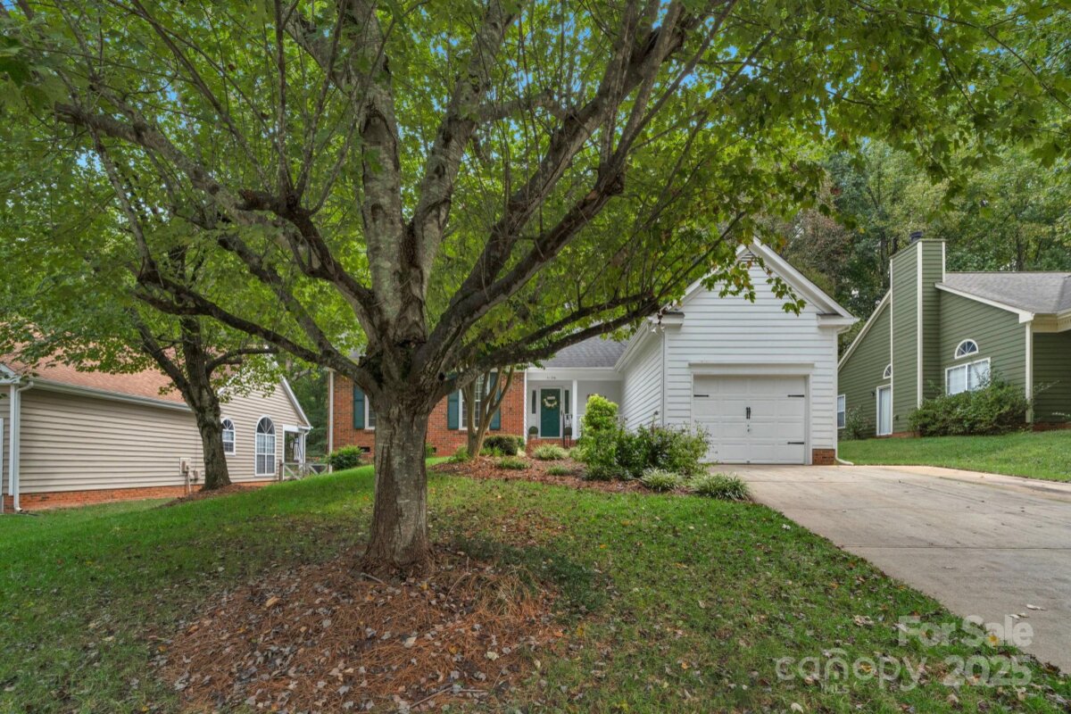 This charming ranch greets you with a welcoming rocking chair front porch and flows into a vaulted living room with a cozy fireplace. The upgraded kitchen features white cabinetry, quartz countertops, stainless steel appliances, and a breakfast bar overlooking the dining area and living room—perfect for entertaining. The primary suite boasts vaulted ceilings, a spa-like ensuite with walk-in shower, garden tub, and dual vanities. Secondary bedrooms feature chair rail detail and share a full bath with a tub/shower combo. Enjoy the outdoors on the back deck and patio overlooking a private, fenced backyard. Additional highlights include gutter guards, architectural shingles, 1-car garage with built-in storage, and a double driveway with extra parking. Conveniently located with easy access to 485, Mint Hill, and Harrisburg! 2 pools, tennis courts, clubhouse, playground, and miles of walking trails.