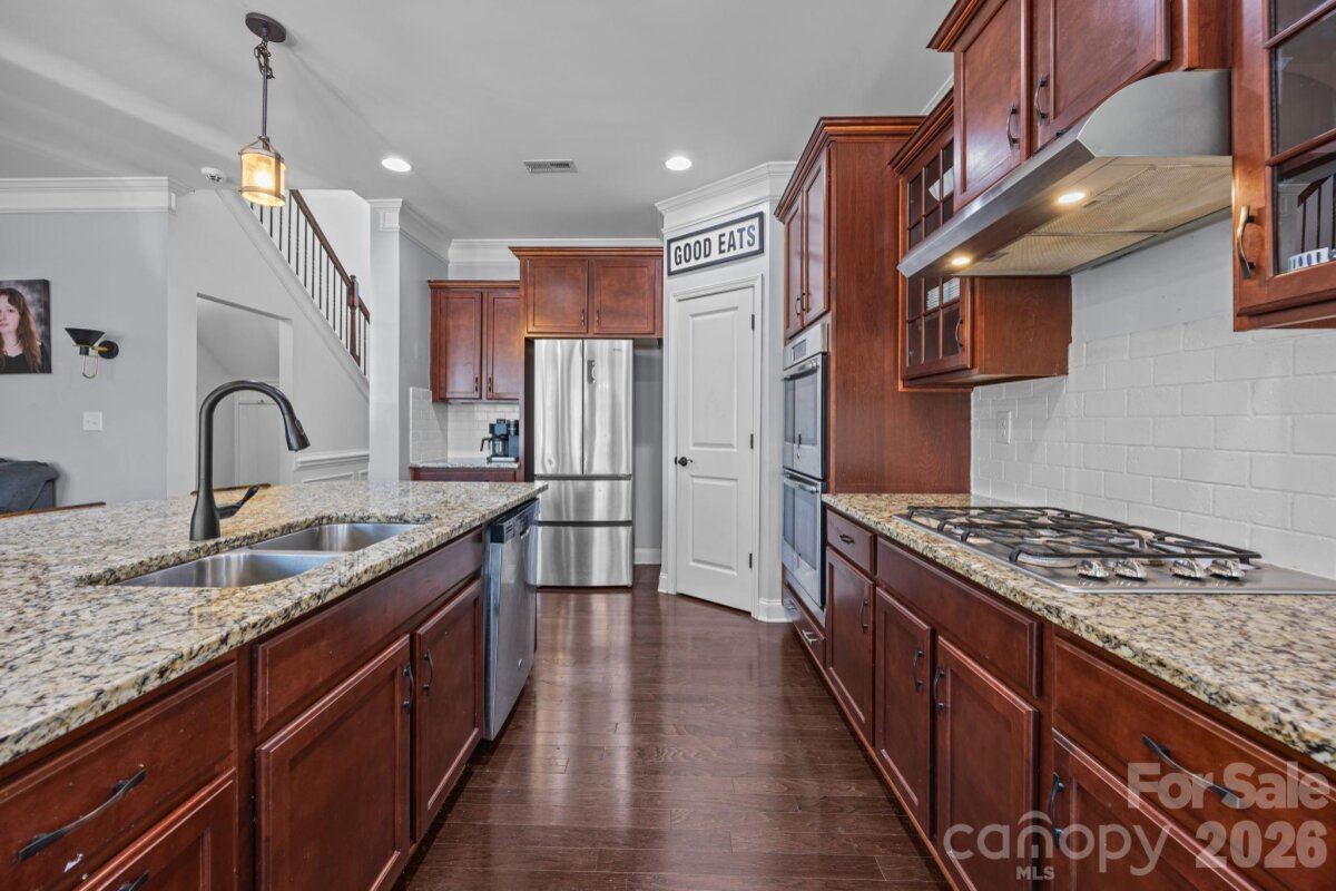 Sophistication abounds in this elegantly appointed 4-bedroom, 3-bath home located in the highly desirable Farm at Riverpointe. Step into the light-filled two-story foyer and admire the dramatic dining room, also ideal as an office or den, featuring coffered ceiling and detailed wainscoting. The inviting family room offers an open floor plan with gas fireplace and ceiling fan, perfect for both relaxing and entertaining. The dreamy chef-style kitchen is a standout, boasting an oversized entertaining island, granite countertops with subway-tile backsplash, gas cooktop, double ovens, stainless steel appliances, pantry, and updated lighting throughout the main level. A spacious breakfast nook completes the space. A main-level bedroom with an adjacent full bath provides excellent flexibility for guests or multigenerational living. Upstairs, the expansive primary suite features a tray ceiling and En-Suite bath with dual vanities, soaking tub, tiled shower and flooring, and a generous walk-in closet with custom built-ins. Two additional bedrooms, a versatile bonus room, and an open landing area complete the second floor. The backyard is designed for outdoor living, featuring a paver patio with large island grill, a fully fenced yard, and the privacy of a cul-de-sac lot. This exceptional community truly has it all, offering Resort-Style amenities including a Junior Olympic pool, tennis and pickleball courts, volleyball, soccer field, basketball court, dog park, playground, picnic and grilling area, clubhouse access, and year-round events for the whole family. Don't let this gem get away!