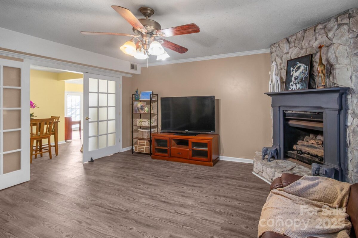 Who says you can’t have your cake and eat it too? Welcome to your own slice of peace without giving up convenience—Nestled on just over an acre with no HOA and offering quick access to Highway 74 with nearby shopping. This charming ranch provides the perfect blend of comfort, privacy, and freedom. As you step through the double doors, you’re welcomed by the inviting sunroom—the perfect space for morning coffee surrounded by views, anchored by a wood-burning stove. When you go beyond the sunroom, elegant French doors lead into a warm living room with a gorgeous fireplace, creating a cozy centerpiece for the home. Continue through to the open entertainment area, the generous space is ideal for having guests for your housewarming party, or even relaxing at the end of the day. The recently remodeled kitchen is both functional and inspiring, complete with beautifully updated cabinetry, fresh paint, a grand ceiling that enhances the sense of space, and an impressive walk-in pantry offering plenty of storage. Down the hallway, you’ll find a thoughtfully built-in book nook with views toward the front yard—a perfect spot to read or display your favorite collections. Two comfortable bedrooms provide flexibility and opportunity. The primary suite is generous in size and filled with natural light, featuring an en suite bathroom highlighted by an artist-created faux stucco finish. Outside, you’ll be greeted by whatever your dreams desire. The beautifully maintained property features mature landscaping with fruit trees, a shed with an attached wood shop, and a large double garage with an unfinished room above that’s already wired and ready for your vision. With no HOA, there’s room to create an ideal setting of your own—for entertaining, gardening, or simply unwinding. With its combination of tranquility, thoughtful updates, no restrictions, and convenient location, 1115 Jamestowne Drive is more than a home—it’s a retreat designed for everyday living and lasting memories. Schedule a showing today and see what your imagination will awaken.