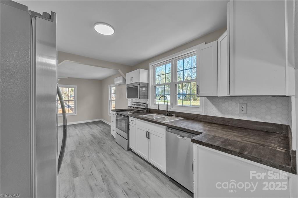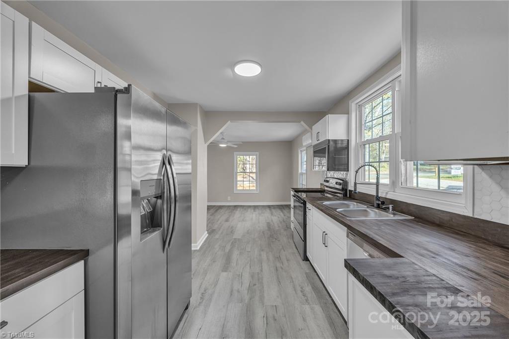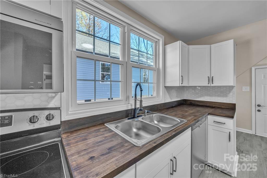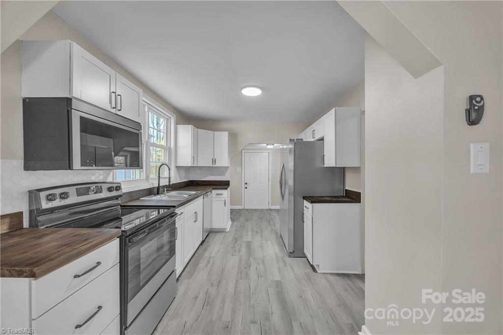 Completely updated and move-in ready! This beautifully renovated Statesville home offers a long list of brand-new features completed within the last year. Step inside to find fresh LVP flooring throughout, all-new interior paint, updated lighting, and a fully redesigned bathroom featuring a custom tile shower. The kitchen has been completely transformed with new shaker-style cabinets, a tile backsplash, butcher block countertops, new stainless steel appliances, and a premium over-the-range microwave equipped with baking and air-frying functions. Additional improvements include three new mini-split heat pumps, a new water heater, new insulation in the crawl space, and a brand-new rear deck. Outside, the home features new seamless commercial-grade gutters and downspouts, along with updated vinyl windows (some 2025, some existing). This home offers numerous recent upgrades and is truly move-in ready. Don’t miss your opportunity—schedule your showing today!
