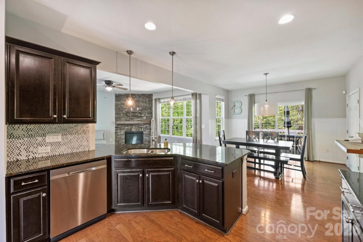 Tucked on a desirable corner lot, this home offers one of the more private, wooded settings in the sought-after Gates at Waterside community—complete with clubhouse, outdoor pool, playground, and sidewalks for easy neighborhood living. A classic rocking chair front porch welcomes you in, where wood floors and an easy, open layout make the main level feel both functional and relaxed. The kitchen is well-appointed with granite countertops, tile backsplash, stainless appliances, recessed lighting, and a breakfast bar and casual dining area that overlooks the rear deck and peaceful, wooded yard. Just off the kitchen, a formal dining room with coffered ceiling and a cozy family room with gas fireplace offer great spaces to gather. A main-level bedroom and full bath provide flexibility for guests, work-from-home, or multigenerational living. Upstairs, the spacious owner’s suite feels like a true retreat, with a large walk-in closet, dual vanities, and a separate garden tub and shower. Three additional bedrooms, a shared bath with dual sinks, and a generous ~320 SF loft give everyone room to spread out. A full-size laundry room with storage and a side-load 2-car garage round out the home. All of it, set in a community people love—this one just happens to come with a little extra privacy out back.