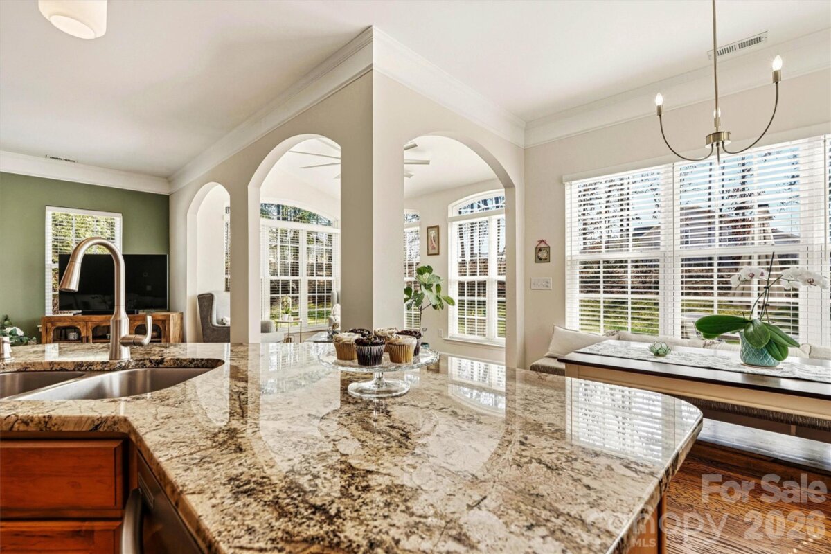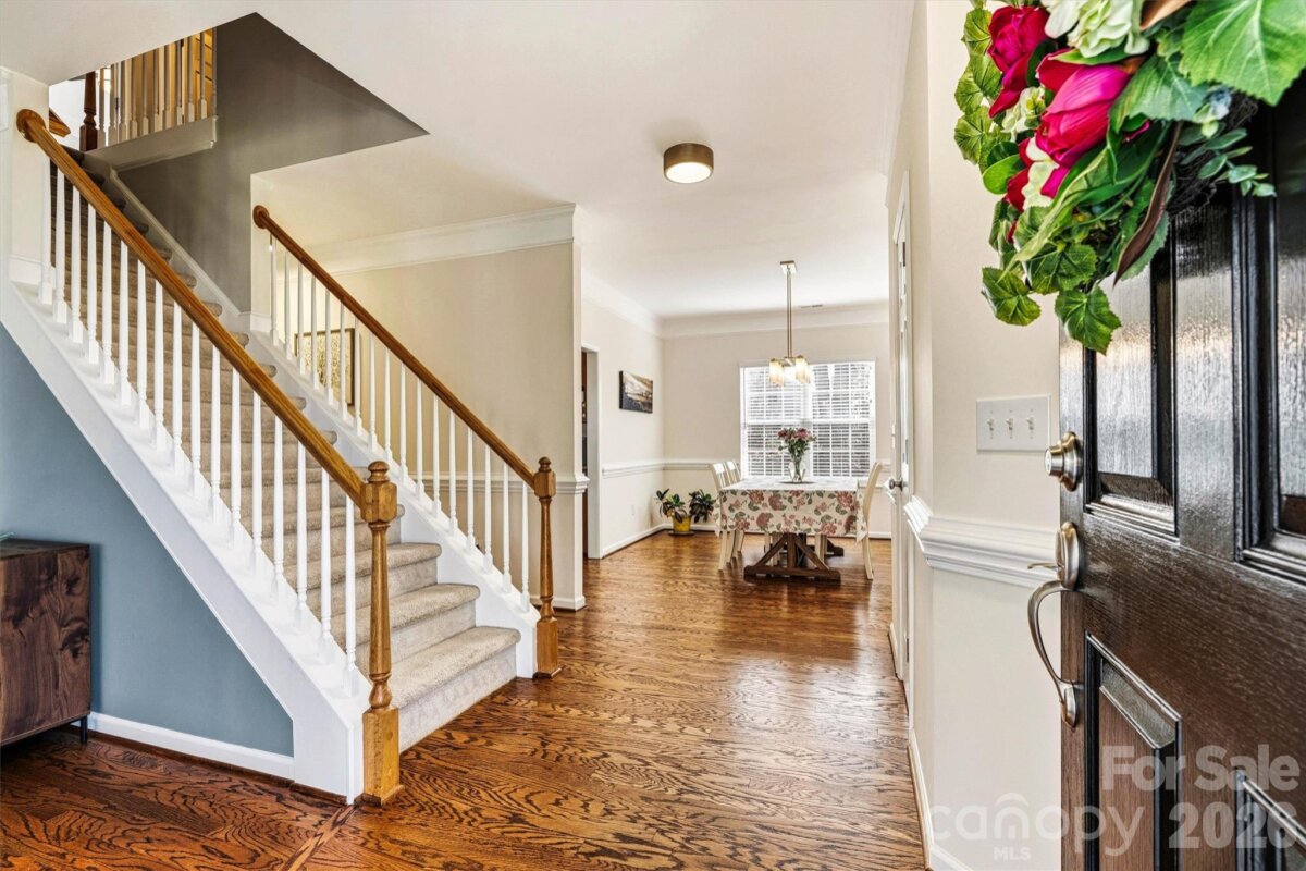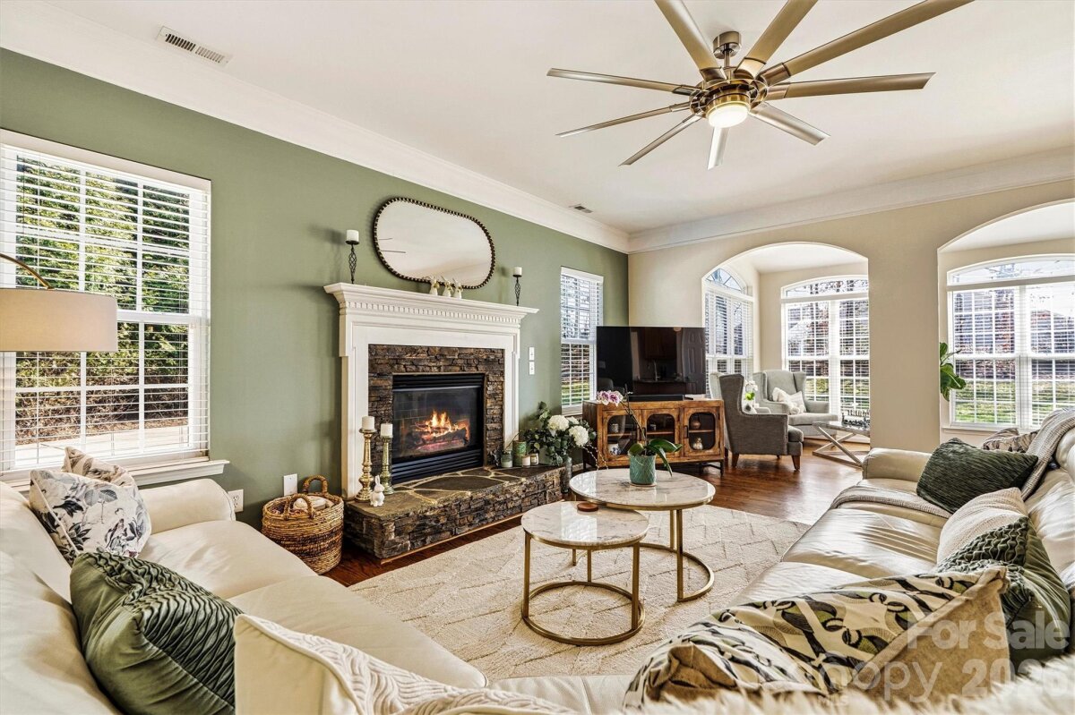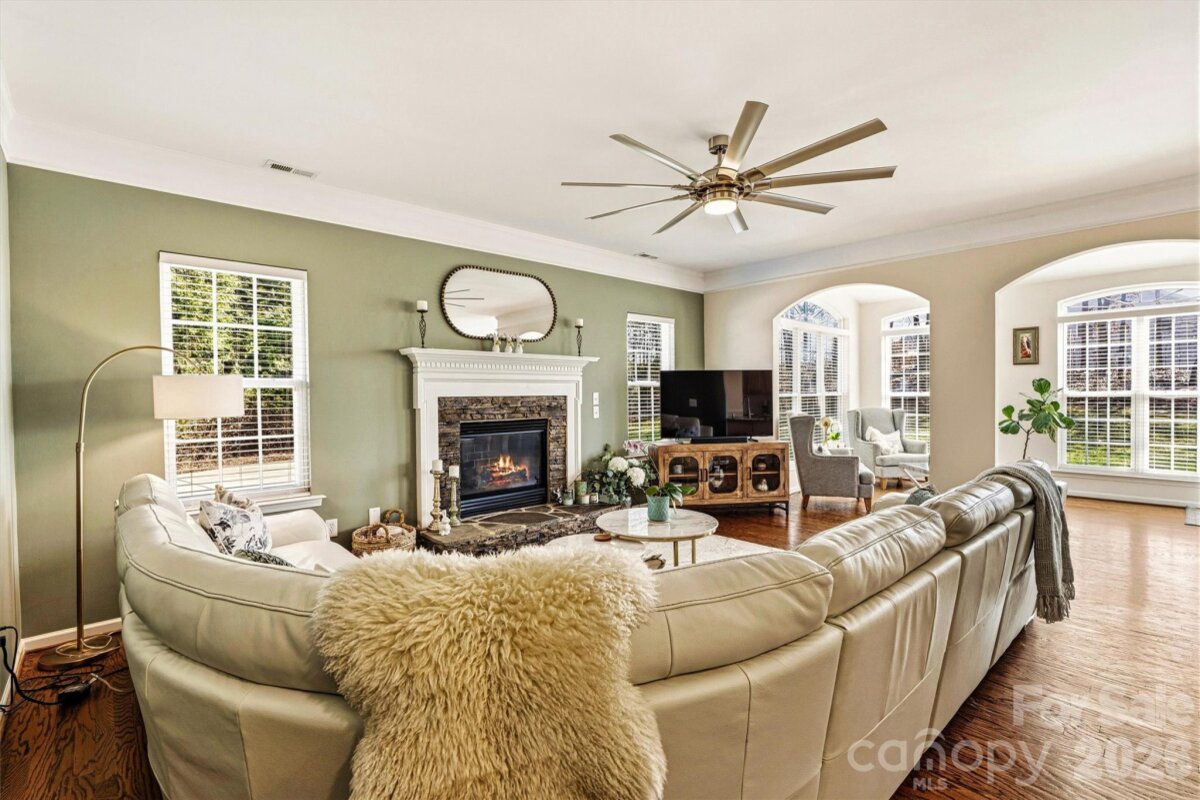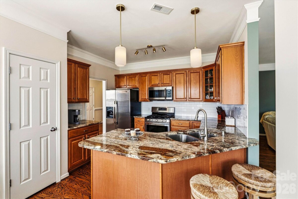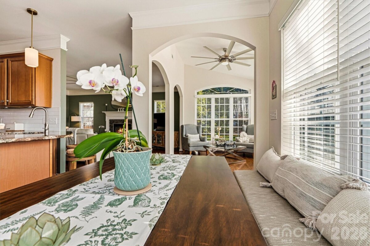 "Three Levels of Living, Endless Comfort." This 5 BR home has it all: 2002 Niblock Home, Great Room, Dining Room, Eat-in Kitchen W/ Banquette, Sun Room, Office, Large Primary with WIC and Spacious Ensuite, 3Rd Floor BR/ Bonus WIC. This beautifully maintained property features a spacious front porch and real oak hardwood floors throughout the main level. The kitchen showcases granite countertops, pull-out cabinetry, an updated tile backsplash, modern light fixtures with dimmers, and Samsung stainless-steel appliances. Bathrooms are enhanced with the same granite as the kitchen. Enjoy cozy evenings by the gas brick fireplace and entertain with ease on the large patio overlooking a mature wooded lot. The side-load garage, spacious driveway, and inviting outdoor areas make this home perfect for gatherings. Major systems have been thoughtfully updated: • HVAC replaced in 2025 • Second HVAC replaced in 2023 • Furnace replaced in 2023 • Water heater replaced in 2023 • Roof replaced in 2014 • Garage door features soft-close and Genie remote app access. Located in the desirable Harris Village community with a pool and affordable HOA at just $625 per year — all within the Mooresville Graded School District. Move-in ready with peace of mind updates already completed!
