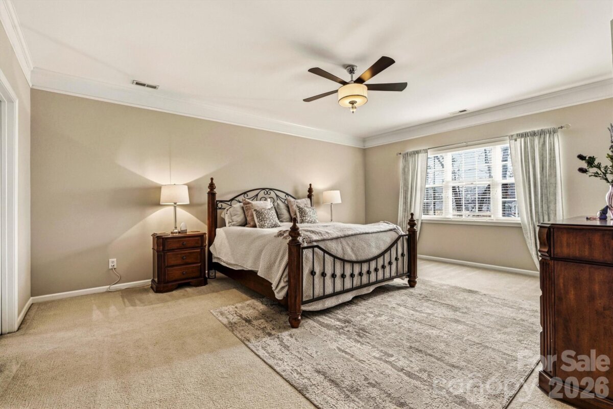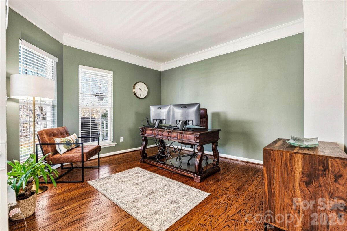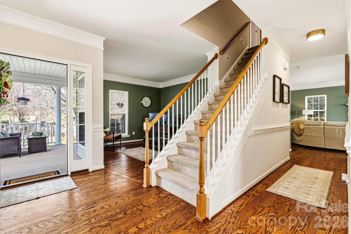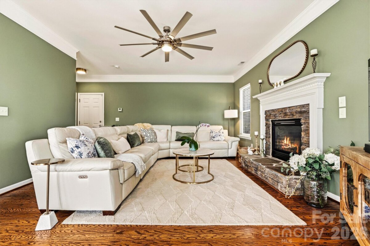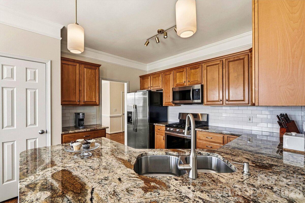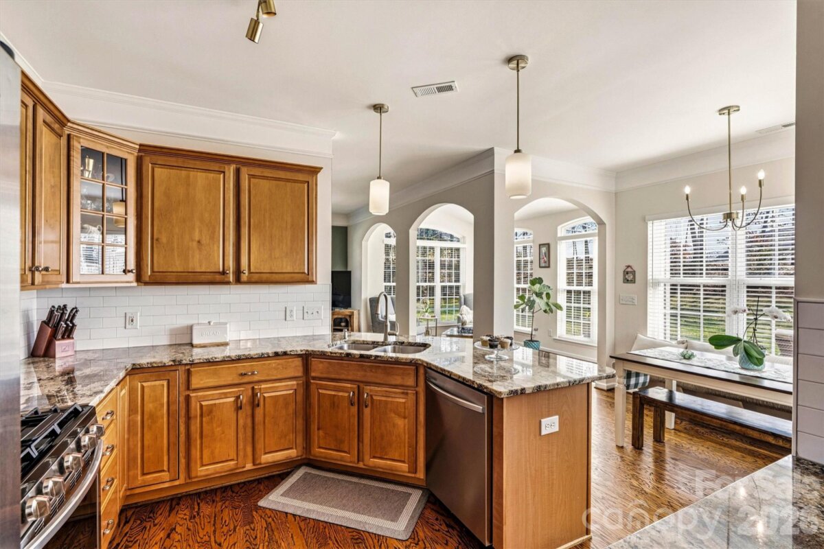 "Three Levels of Living, Endless Comfort." This 5 BR home has it all: 2002 Niblock Home, Great Room, Dining Room, Eat-in Kitchen W/ Banquette, Sun Room, Office, Large Primary with WIC and Spacious Ensuite, 3Rd Floor BR/ Bonus WIC. This beautifully maintained property features a spacious front porch and real oak hardwood floors throughout the main level. The kitchen showcases granite countertops, pull-out cabinetry, an updated tile backsplash, modern light fixtures with dimmers, and Samsung stainless-steel appliances. Bathrooms are enhanced with the same granite as the kitchen. Enjoy cozy evenings by the gas brick fireplace and entertain with ease on the large patio overlooking a mature wooded lot. The side-load garage, spacious driveway, and inviting outdoor areas make this home perfect for gatherings. Major systems have been thoughtfully updated: • HVAC replaced in 2025 • Second HVAC replaced in 2023 • Furnace replaced in 2023 • Water heater replaced in 2023 • Roof replaced in 2014 • Garage door features soft-close and Genie remote app access. Located in the desirable Harris Village community with a pool and affordable HOA at just $625 per year — all within the Mooresville Graded School District. Move-in ready with peace of mind updates already completed!