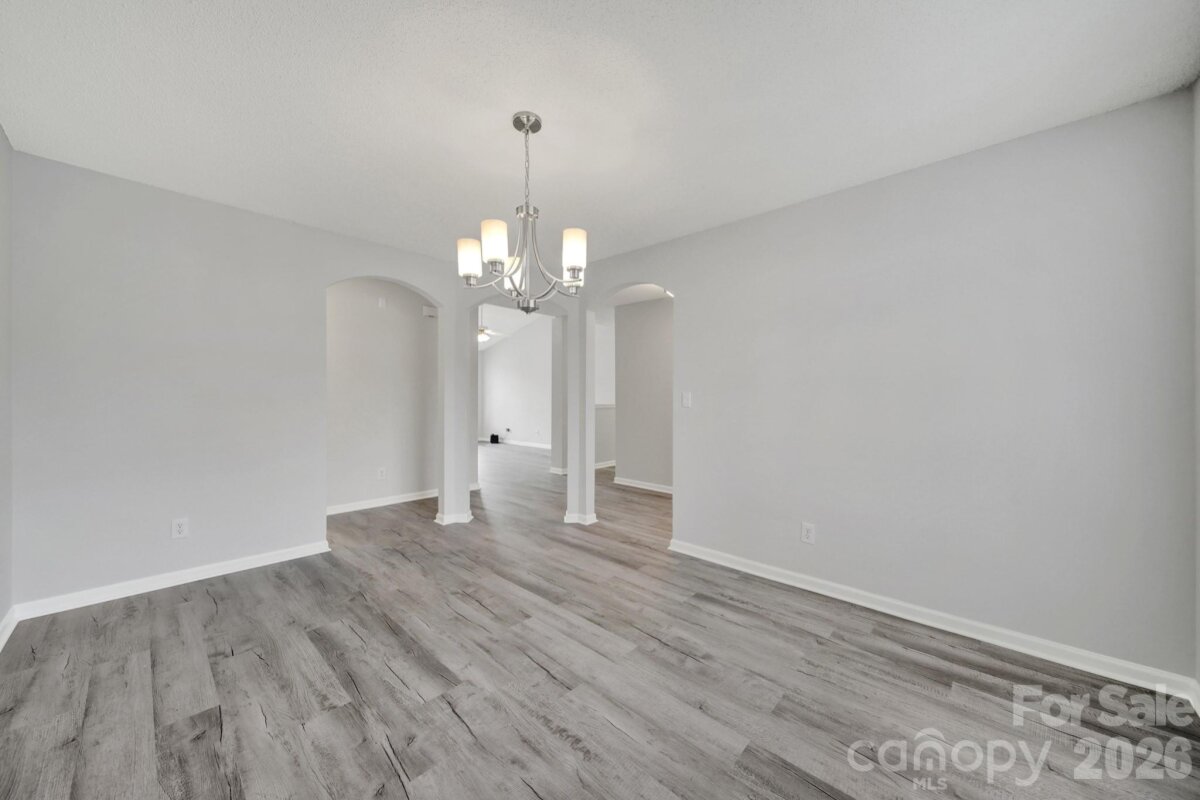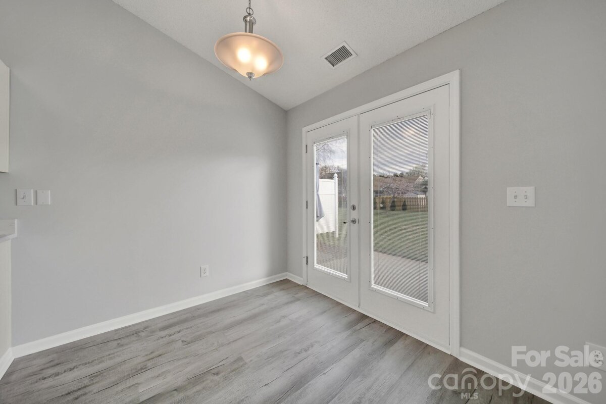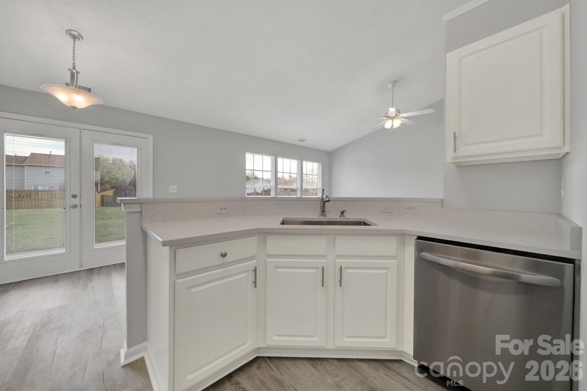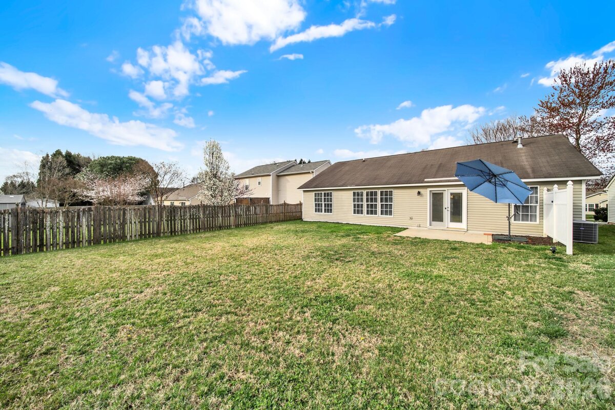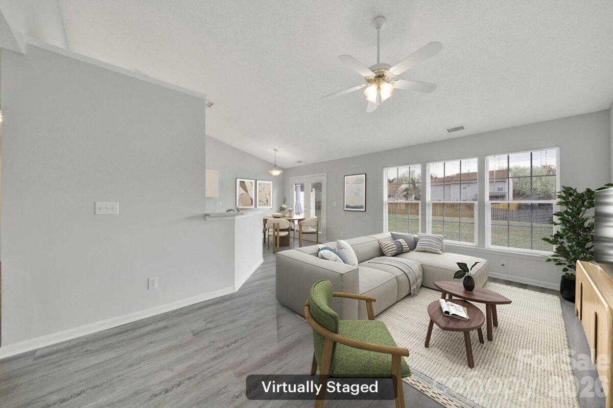 Welcome to this move-in ready, updated ranch in the Winborne community in Mooresville. Step inside and enjoy an open floor plan featuring fresh neutral paint, trendy lighting, stylish archways, and whole-home blinds. Kitchen features beautiful quartz countertops, stainless steel appliances, a self-cleaning range with a convection oven, pantry, breakfast bar, and adjacent breakfast area. Family room and dining room connect seamlessly, offering comfortable spaces to relax or entertain. Primary suite provides a peaceful retreat complete with new vanity, soaking tub, and separate stand-alone shower. Two additional bedrooms and laundry room add convenience and flexibility. Finished and painted two-car attached garage includes a utility sink and exterior access for added functionality. Enjoy the spacious, flat backyard with patio, perfect for outdoor living. Ideally located close to highly rated schools, vibrant downtown, and easy access to I-77.