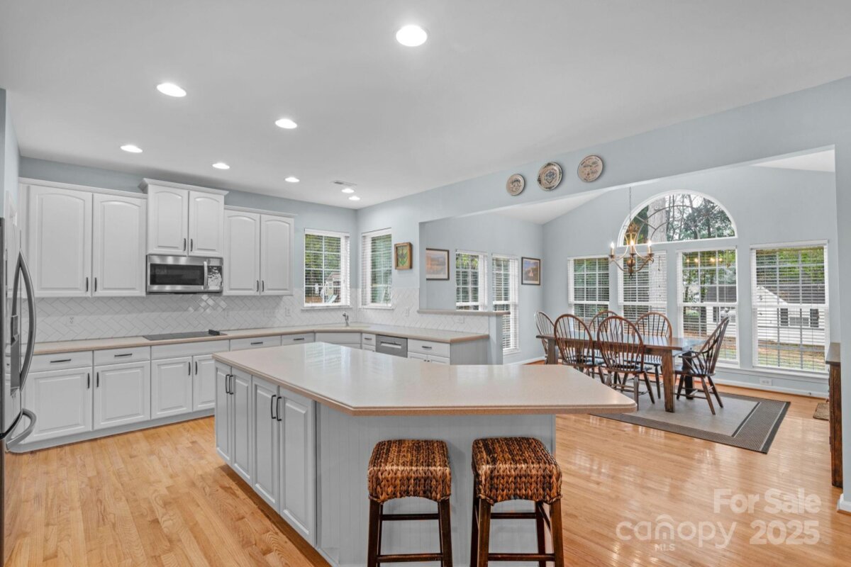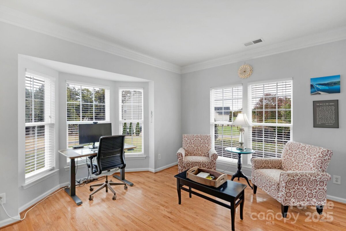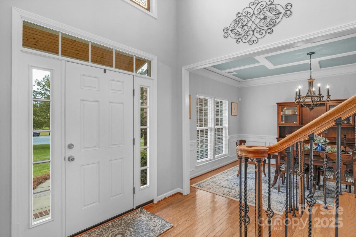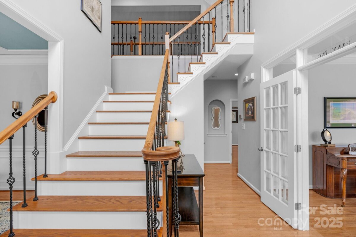 Welcome to this beautifully maintained 4-bedroom, 3-bath home offering over 4,000 square feet of thoughtfully designed living space. From the moment you enter, you're greeted by a dramatic two-story foyer with engineered hardwood floors that carry throughout the main living areas. A dedicated office with elegant French doors and a formal dining room with oversized windows fill the front of the home with natural light. The heart of the home is the two-story great room, featuring a cozy fireplace and open sight-lines into the spacious kitchen, which offers abundant cabinet storage, generous counter space, and a charming breakfast nook. Enjoy year-round comfort and views from both the sunroom and the oversized screened porch, perfect for relaxing or entertaining. The main level also includes a flex room and full bath, ideal for guests, multigenerational living or fitness area. Upstairs, you’ll find the bedrooms, including a generous primary suite with a luxurious en-suite bathroom and dual walk-in closets. Additional features include ample storage throughout, a 3-car garage, and a storage shed in the fully fenced backyard, all situated on a private cul-de-sac lot. Don't miss your chance to make this exceptional Mint Hill home yours!