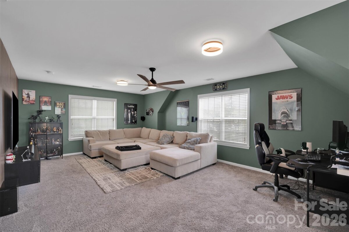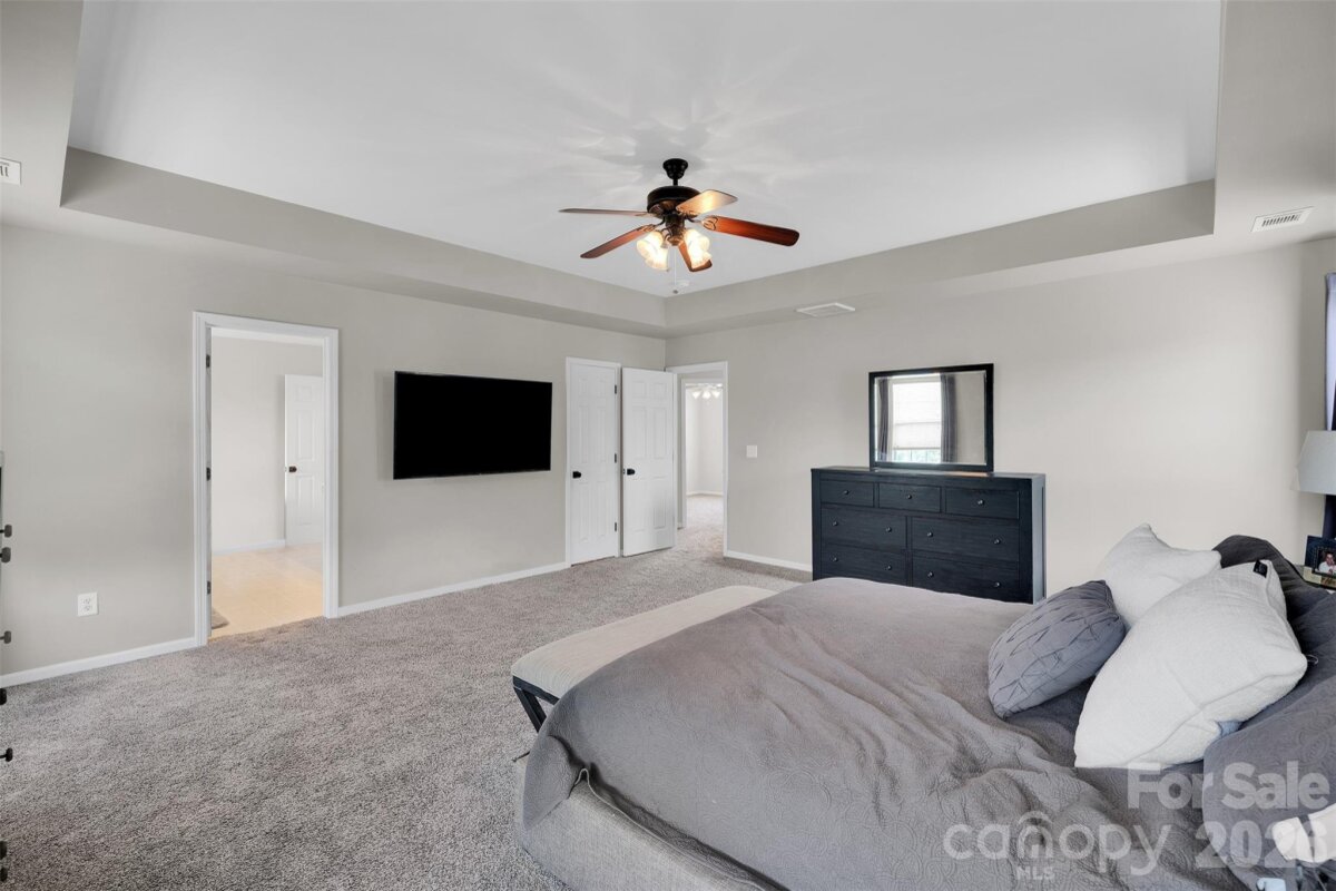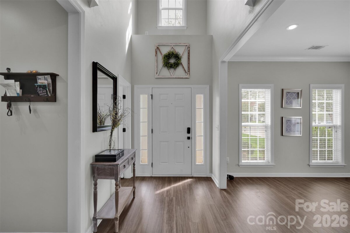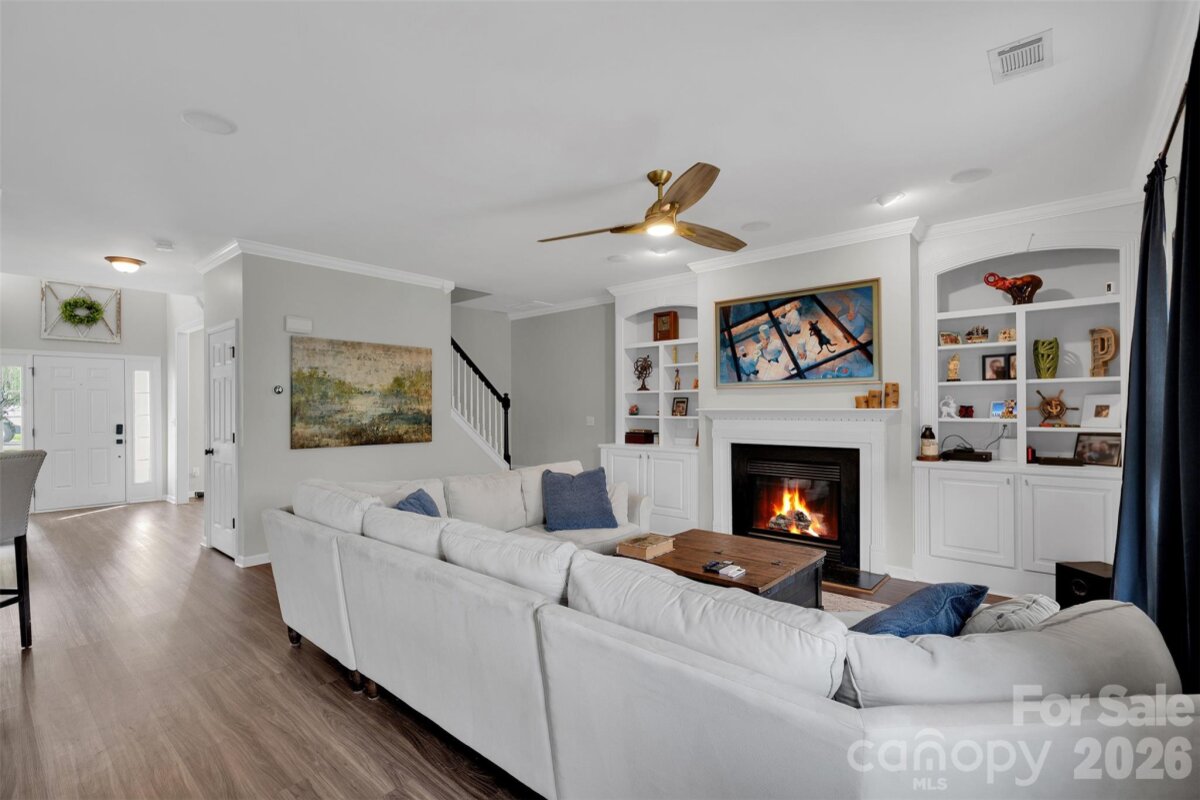 Located in The Hampshires, this home offers a functional layout, updated finishes, and flexible living spaces throughout. The main level features an open layout with abundant natural light and a seamless flow between the living area and kitchen. The kitchen has been updated and includes stainless steel appliances and quartz countertops. A newly updated half bath is conveniently located on the main level. A custom-built-in bar area with a beverage refrigerator, wine storage, and floating shelves. Upstairs, the primary suite offers generous space, a tray ceiling, a walk-in closet, and an en-suite bath with dual vanities, a soaking tub, and a separate shower. Additional bedrooms provide flexibility for guests or office space, with one additional full bathroom serving the secondary bedrooms. The upper-level bonus/living area creates an additional gathering space, ideal for media, recreation, or an additional bedroom.