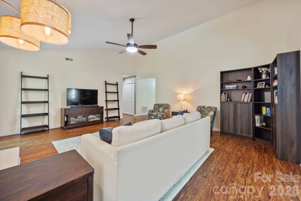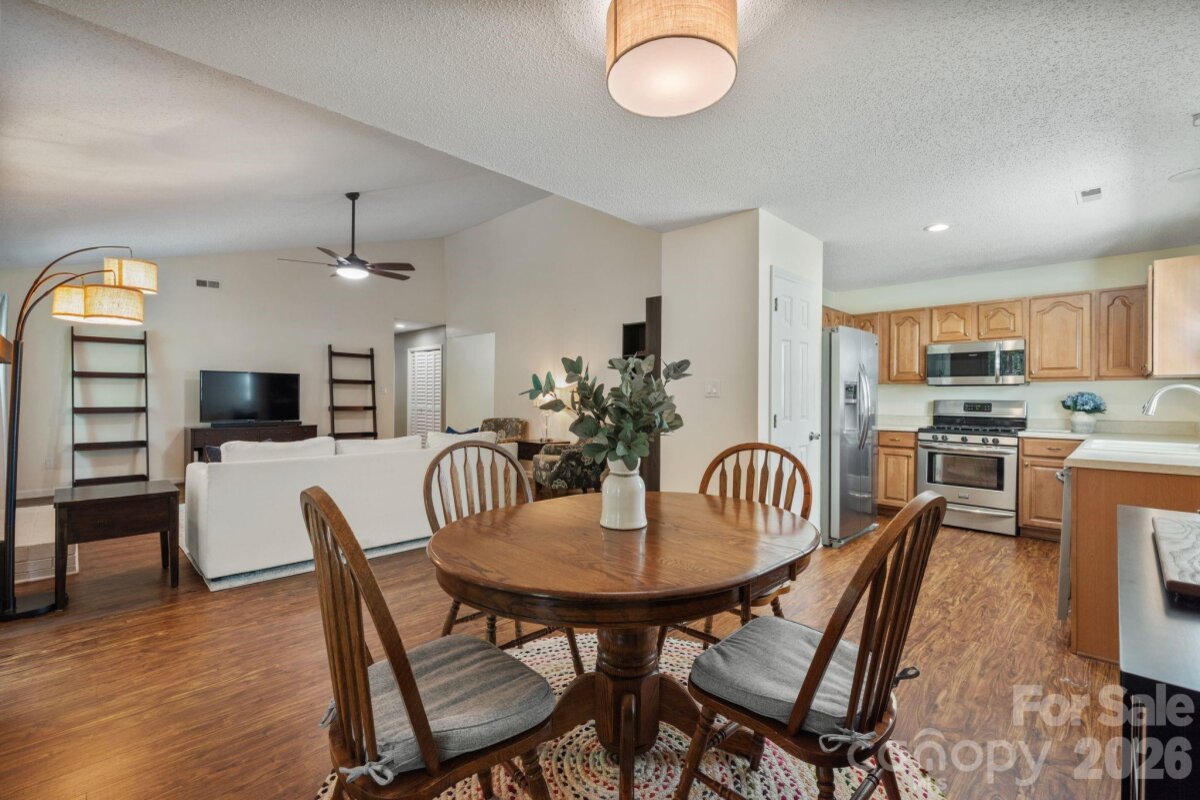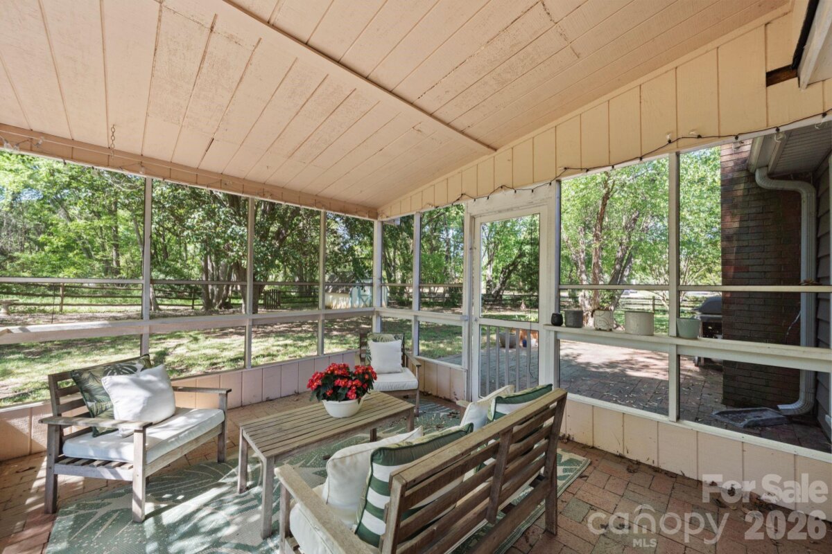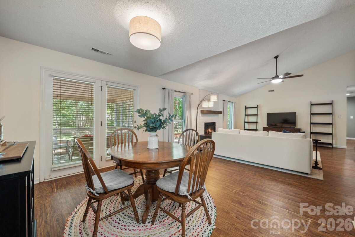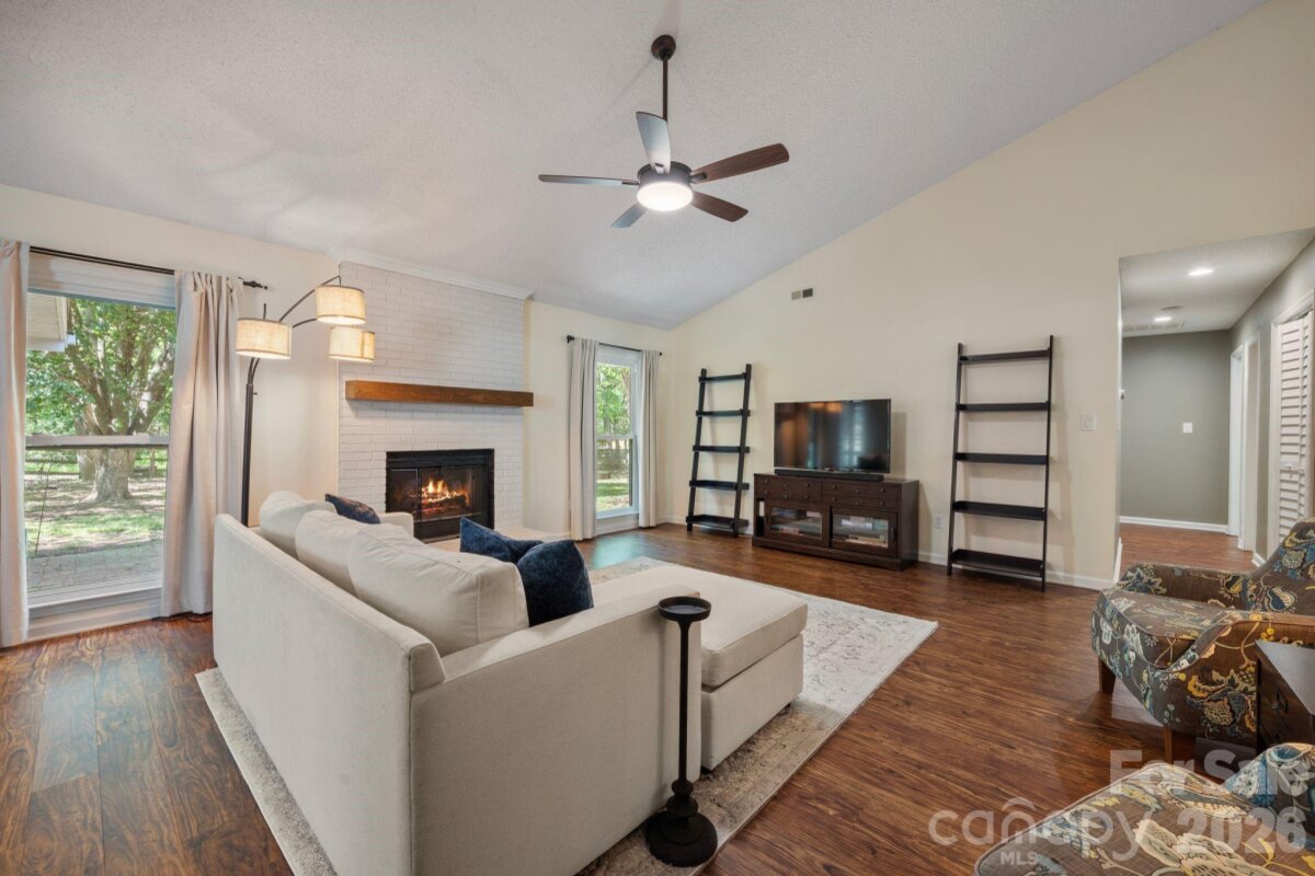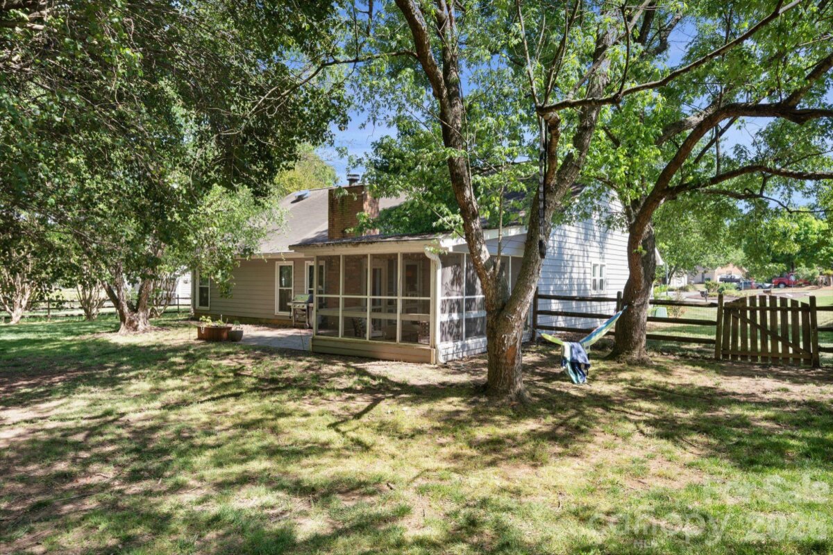 Don’t miss this beautiful 4-bedroom, 2-bath ranch in the heart of Steele Creek! A bright and airy living room welcomes you with vaulted ceilings, expansive windows, and a cozy gas fireplace that creates the perfect focal point. The open-concept layout flows into the kitchen and dining area, featuring a gas range, stainless steel appliances. Fresh paint throughout the main living areas enhances the light, move-in-ready feel. The private primary suite offers an ensuite bath with dual vanities, a tiled shower, and large walk-in closet Three additional bedrooms offer flexibility for guests, a home office, or additional living space. Enjoy outdoor living year-round on the screened-in porch overlooking a generous .50-acre cul-de-sac lot with a fully fenced, private backyard—perfect for relaxing, entertaining, or enjoying quiet evenings at home. Community amenities include a pool, playground, volleyball court, and tennis court. Conveniently located just minutes from shopping, dining, and everyday conveniences, this home offers the perfect blend of space, comfort, and location. Schedule your showing today!
