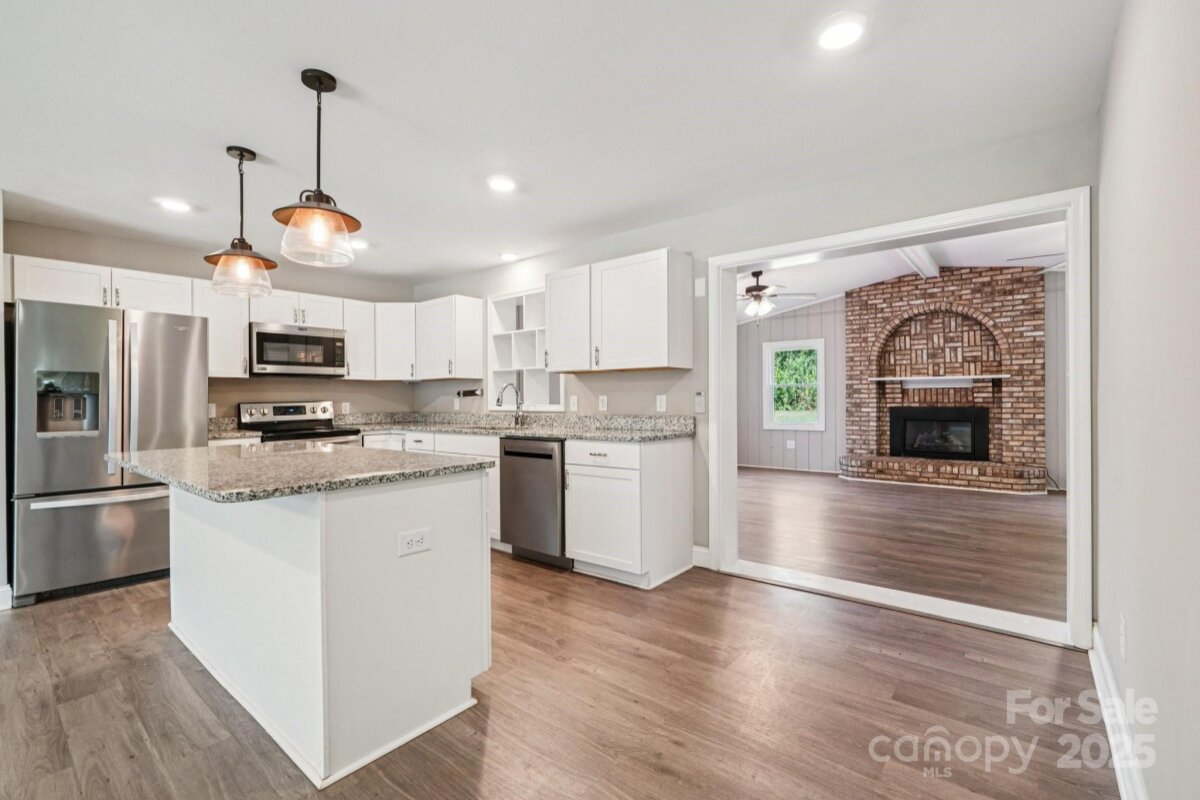 Welcome to this charming 3-bedroom, 2-bathroom ranch-style home set on nearly a half-acre lot! A covered front porch invites you inside, where you’ll find two spacious living areas—one seamlessly connected to the kitchen and the other featuring a cozy fireplace for relaxing evenings. The kitchen is the heart of the home, complete with stainless steel appliances, a large island, and plenty of room for gathering. Natural light flows throughout, creating a warm and inviting atmosphere in every room. Step outside to enjoy the expansive fenced backyard, featuring a large deck perfect for entertaining, grilling, or simply unwinding in your private outdoor space!