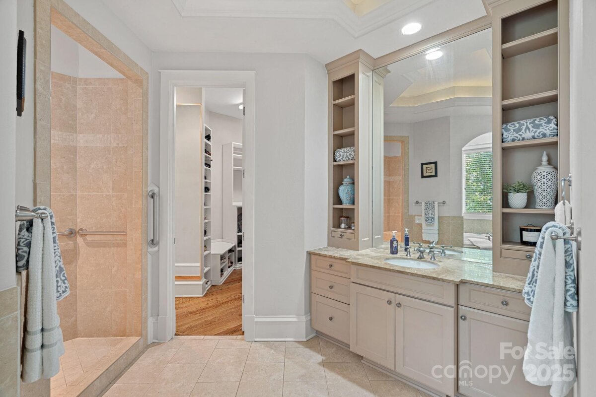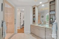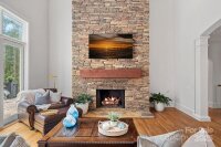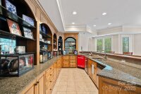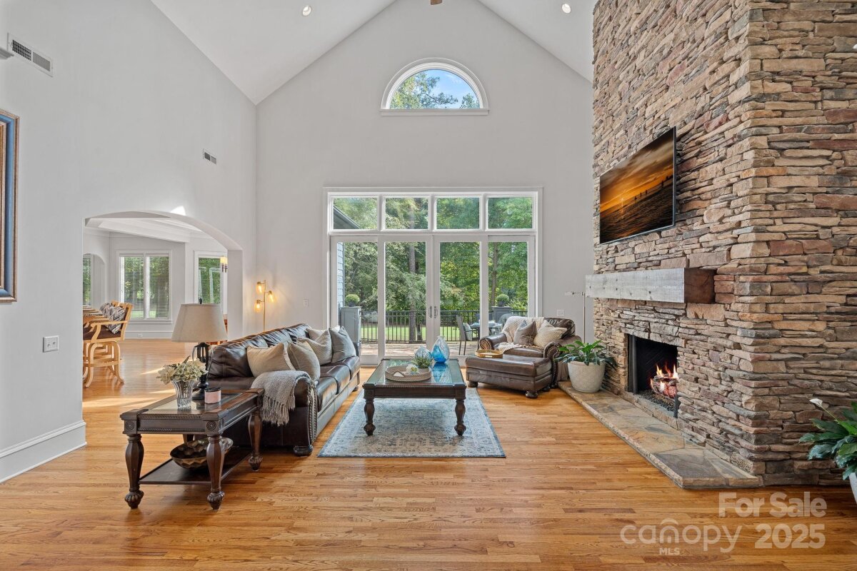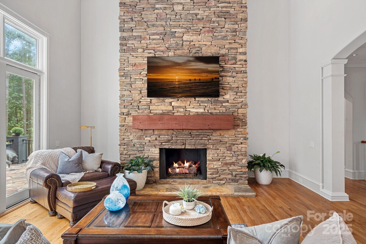 This stunning Simonini-built custom home is perfectly positioned on the 3rd tee of the prestigious Trump National Golf Course. A grand stone front porch invites you into an open floor plan with exquisite details, featuring soaring vaulted ceilings in the foyer and Great Room. The expansive Great Room, centered around a striking floor-to-ceiling stone fireplace, seamlessly connects to the gourmet kitchen, equipped with a high-end Viking six-burner range and a large granite island offering ample prep space. Adjacent, the breakfast nook, with its elegant octagonal tray ceiling, accommodates a large kitchen table for gatherings. The main floor also features a spacious primary suite with a tray ceiling and doors leading to a stone terrace, paired with a luxurious primary bath boasting dual marble vanities and an oversized closet. An additional ensuite bedroom/Flex Room on the main level provides versatility, complemented by a large dining room ideal for entertaining. The lower level is an entertainer’s paradise, featuring a large wet bar with a beverage fridge, kegerator, and dishwasher, alongside a billiards area, family room with a stunning stone fireplace, office, and three additional bedrooms with two full baths, all finished with durable LVP flooring (installed in 2021). Ample storage space adds practicality. Step outside to enjoy stunning golf course views from the upper terrace or lower covered patio, or unwind by the private pool and spa. Extensive landscape lighting and an irrigation system enhance the property’s beauty. The home includes a three-car garage with custom Race Deck flooring. A deeded boat slip (#W3) with lift, located nearby, offers easy access to Lake Norman’s sparkling waters.