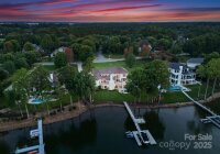 Welcome to "Villa Bianca," a breathtaking waterfront estate in The Point. The white façade, timeless architectural design & expansive .89-acre setting on the shores of LKN create an unforgettable first impression. Step inside to soaring ceilings & refined finishes where the primary suite is conveniently located on main level. At the heart of the home lies a true chef’s gourmet kitchen designed w/state-of-the-art appliances, custom cabinetry & an oversized island that seamlessly flows into open living & dining spaces. Upstairs, discover 3 add'l bedrooms, private study, cozy library & spacious bonus room. The fully finished basement transforms into a retreat of its own, complete w/a 2nd full kitchen, large living space & home movie theater, all designed to entertain in style. Step outdoors to a resort-like escape w/golf course views & Lake Norman, offering breathtaking sunsets & unmatched serenity. A private dock with a boat lift ensures seamless access to lake life at its finest.