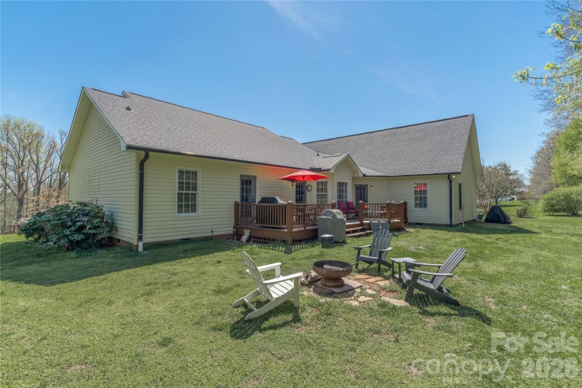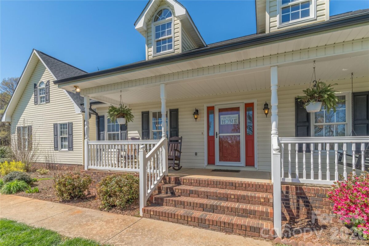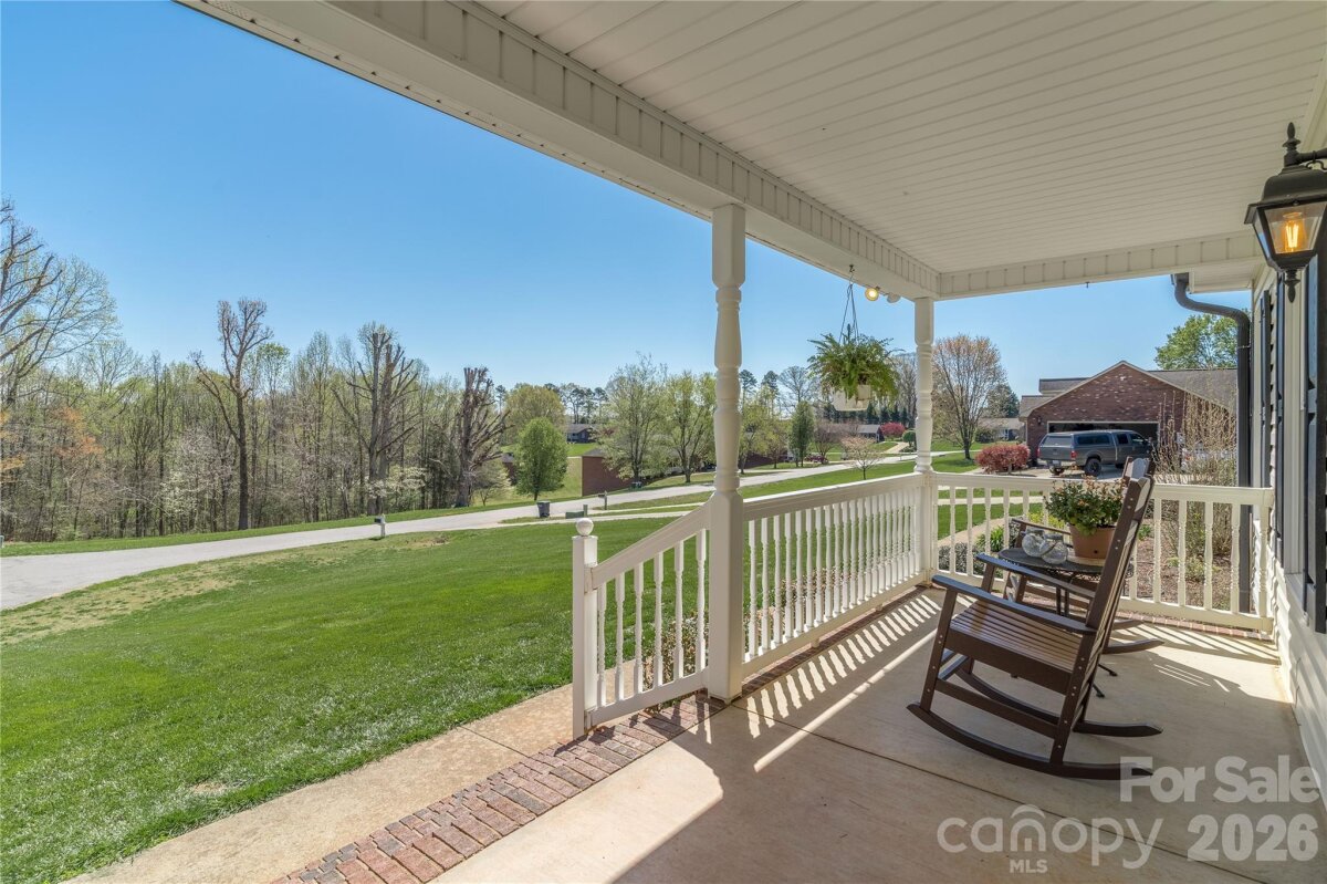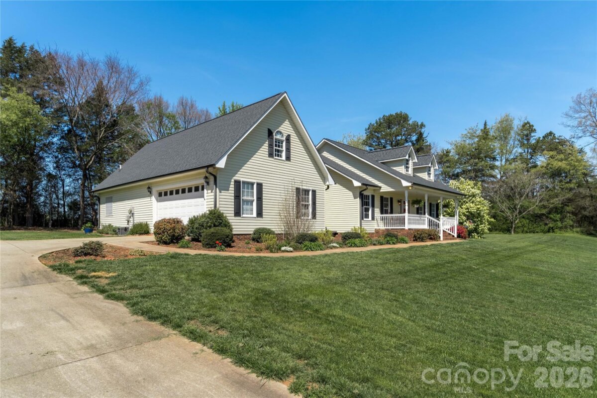 Country living in this one level home with relaxing rocking chair front porch to admire the lush landscaping. Located on a large lot in a quiet cul-de-sac, yet only minutes from I40 or I77. Primary bedroom on main along with a spacious dining room, open kitchen and great room, breakfast area and a large bonus room upstairs that would make a great office, theatre room, or workout area. Primary bath has separate shower, tub, dual vanity sink and walk-in closet. A spacious deck for enjoying your private backyard and a brand new 10X16 shed was just installed and conveys with the property.
