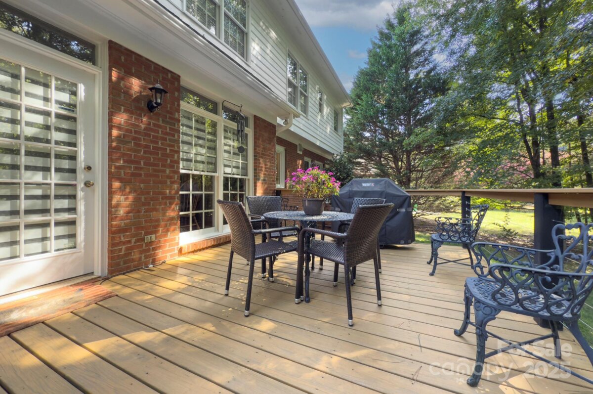 Meticulously maintained full-brick home in the heart of Providence Crossing, offering award-winning schools and a rare, private, level wooded lot—perfect for play and entertaining! Enjoy outdoor living on the expansive deck overlooking a lush backyard oasis. Inside, the totally renovated kitchen (2017) features new cabinetry, quartz countertops, updated appliances, a walk-in pantry, added storage, and a picturesque window overlooking the yard. The main level showcases gleaming hardwood floors, freshly painted living and dining rooms, a two-story foyer with a stunning chandelier, and a private office with French doors and custom built-ins. Upstairs, you'll find four spacious bedrooms, including a luxurious primary suite with a huge walk-in closet, garden tub, walk-in shower, and private water closet. An oversized bonus room offers flexibility and convenient access via a secondary staircase. Major systems include a 2010 roof, 2005 HVAC, and 2020 gas water heater. The property is partially in the 100-year flood zone. The homeowner does not have flood insurance and is not required to have it. This is a rare opportunity to own a beautiful, move-in-ready home in one of the most desirable neighborhoods in South Charlotte. Don’t miss it—Amazing!