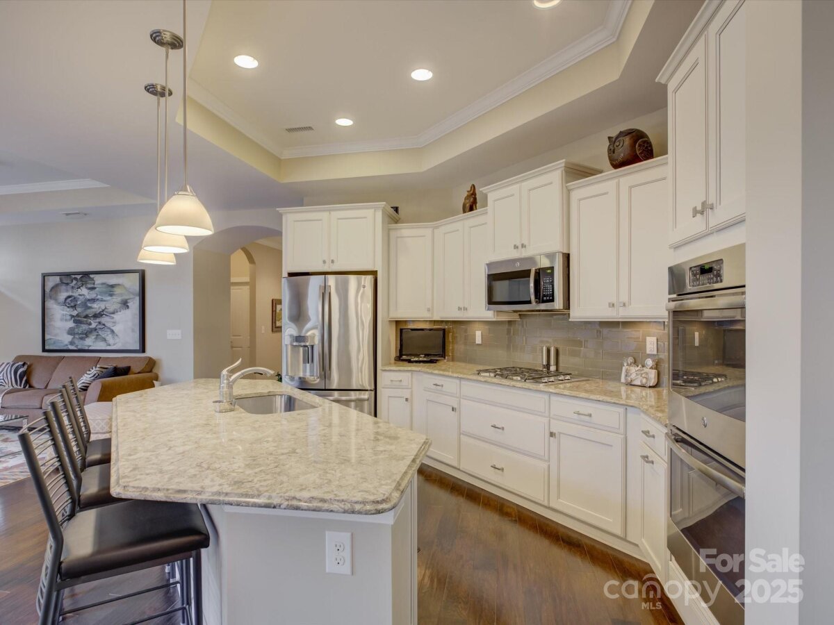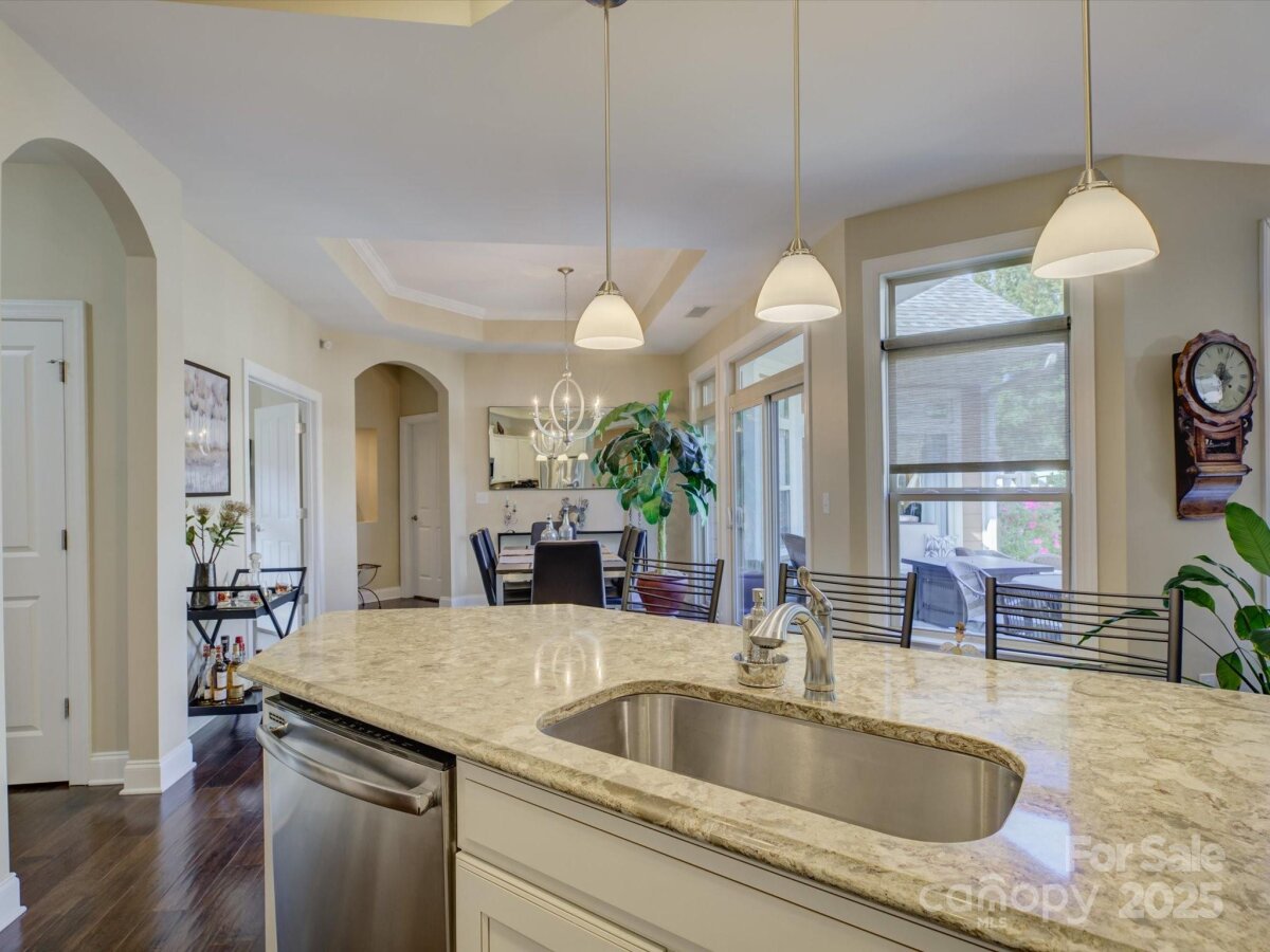 Experience the perfect blend of elegance, comfort, and convenience in this beautifully appointed 2-bedroom, 2-bath ranch-style home located in The Courtyards of Marvin, one of the Charlotte area’s most prestigious 55+ communities. Manicured landscaping and architectural details create a warm first impression, welcoming you to a residence that blends charm with contemporary design. Step inside and you’re greeted by a bright, open layout where natural light fills the space, highlighting the hardwood floors, recessed lighting, and a custom built-in wall unit that adds both character and functionality. The spacious living room invites you to unwind, entertain, or simply enjoy a quiet evening at home. The gourmet kitchen is a true showpiece—perfectly suited for both casual dining and hosting gatherings. Quartz countertops, stainless steel appliances, custom cabinetry, and a large central island offer a modern aesthetic paired with everyday practicality. Flexible den or office with French doors just off the living room provides extra space for work or relaxation. The primary suite offers a private escape designed to feel both luxurious and serene. The generous bedroom easily accommodates a king-sized bed and sitting area. The adjoining ensuite bathroom exudes spa-like tranquility, featuring dual sink vanities with upgraded tile shower. A spacious walk-in closet provides ample storage and organization, keeping everything conveniently at hand. The home’s second bedroom offers exceptional flexibility. Whether used as a guest suite, hobby space, or home office, it’s thoughtfully sized to accommodate various lifestyles. Guests will appreciate the easy access to the second full bathroom. Outdoor living is an essential part of the lifestyle at The Courtyards of Marvin, and this home was designed to take full advantage of it. Step through the glass doors from the living area to a covered porch and extended patio, offering the ideal space for morning coffee, casual gatherings, BONUS.. HOA includes lawn care which means your time is truly your own—no more weekends spent mowing, mulching, or pruning. Life at The Courtyards of Marvin is all about balance—luxury without hassle, independence with community, and activity without stress.