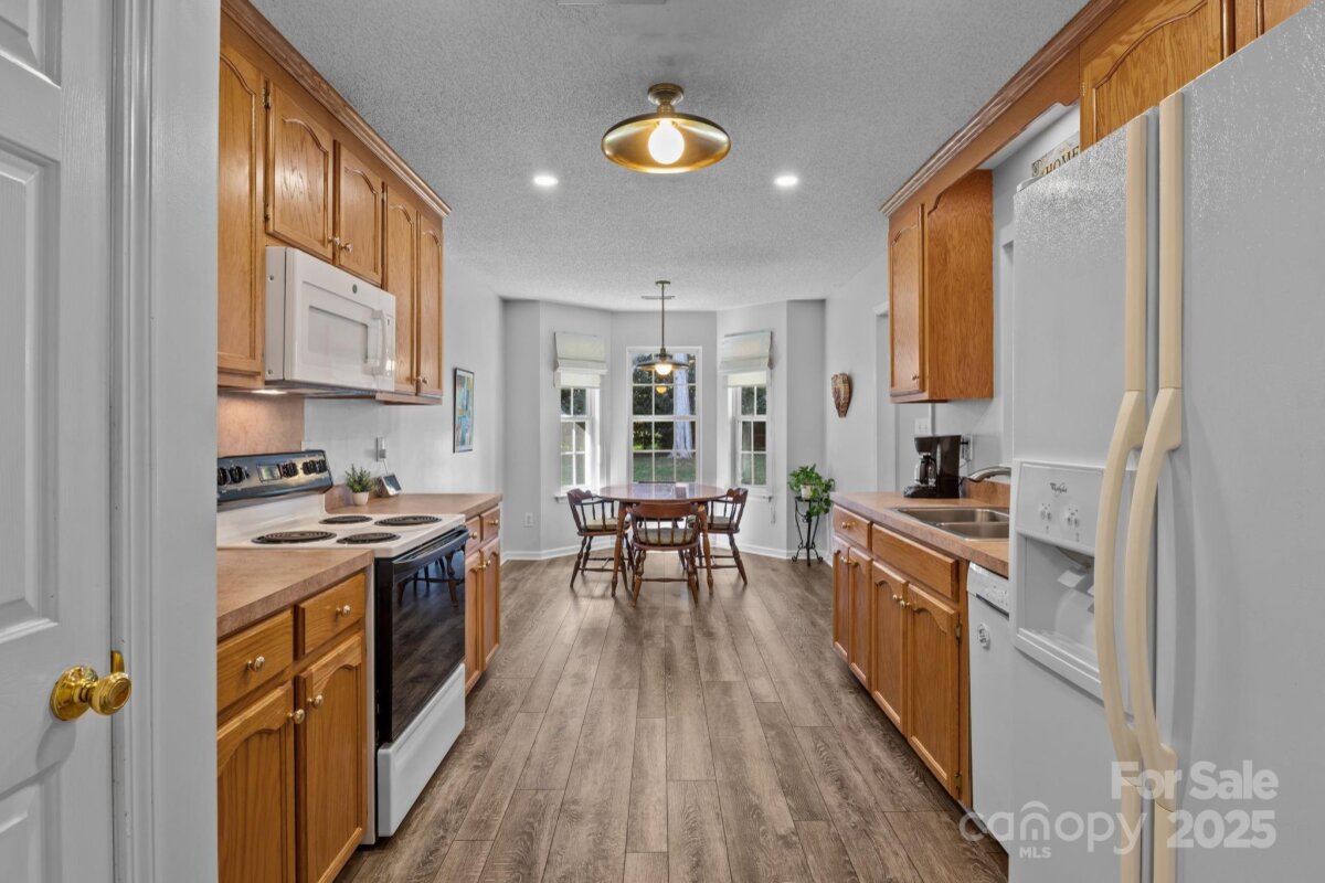 Welcome to this beautifully maintained one-level home located in the highly desirable Deerfield neighborhood of Mt. Holly. Tucked away on a peaceful cul-de-sac lot, this property offers curb appeal, comfort, and convenience all in one. The home features 3 spacious bedrooms and 2 full bathrooms, including a lovely primary suite with a tray ceiling, walk-in closet, and a spa-like en-suite bath complete with dual vanities, a custom tile shower, and a separate soaking tub. The main living areas are warm and inviting with durable luxury vinyl plank flooring, while the bedrooms feature brand new carpet for added comfort. The open-concept great room boasts a vaulted ceiling, a cozy gas fireplace, and direct access to the rear deck—perfect for entertaining or relaxing while overlooking the fenced backyard and lush, custom landscaping. The kitchen is designed for both function and charm, offering 42-inch oak cabinets, laminate countertops, a pantry, and plenty of workspace for meal prep. A breakfast area provides casual dining space, while the formal dining room is ideal for hosting family gatherings or dinner parties. Outside, the home continues to impress with a two-car garage plus an extra parking pad—perfect for a golf cart, RV, or additional vehicles. A storage shed offers plenty of room for tools and outdoor equipment. The yard is beautifully manicured, showcasing thoughtful landscaping that enhances the home’s curb appeal and provides a peaceful outdoor retreat. Important system updates include a new AC system installed in 2025 and a new furnace installed in 2019, offering peace of mind and energy efficiency for years to come. Located just minutes from downtown Mt. Holly, you’ll enjoy easy access to a vibrant community filled with local shops, breweries, restaurants, and coffee houses as well as a thriving farmer's market. The neighborhood’s central location also places you close to the U.S. National Whitewater Center, the Catawba River, Belmont, Gastonia, Charlotte Douglas International Airport, and Uptown Charlotte—all within a short drive. Whether you’re looking for a quiet retreat or a home close to everything, this Deerfield property offers the best of both worlds—small-town charm with modern conveniences. Don’t miss your chance to call this move-in-ready Mt. Holly gem your new home!