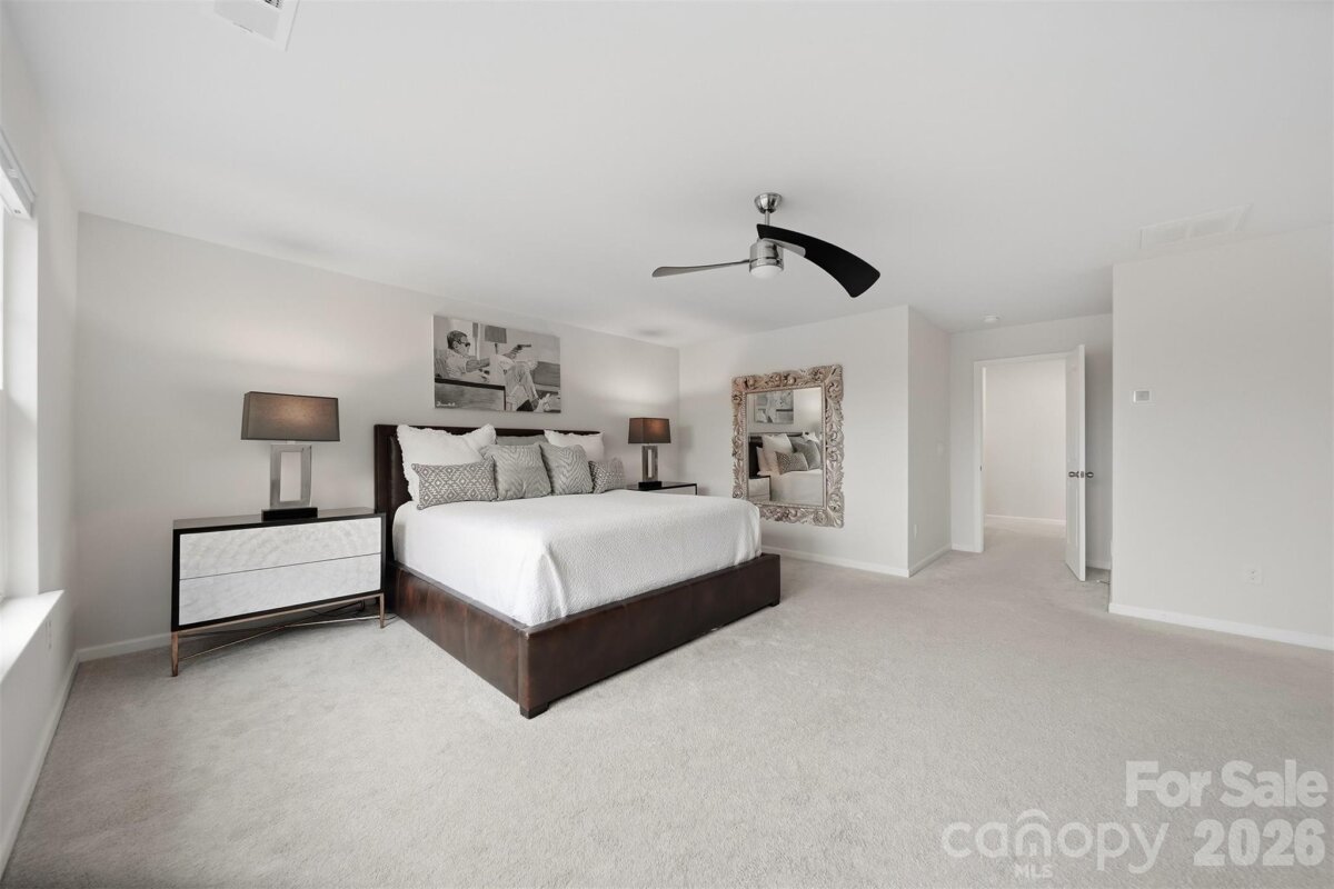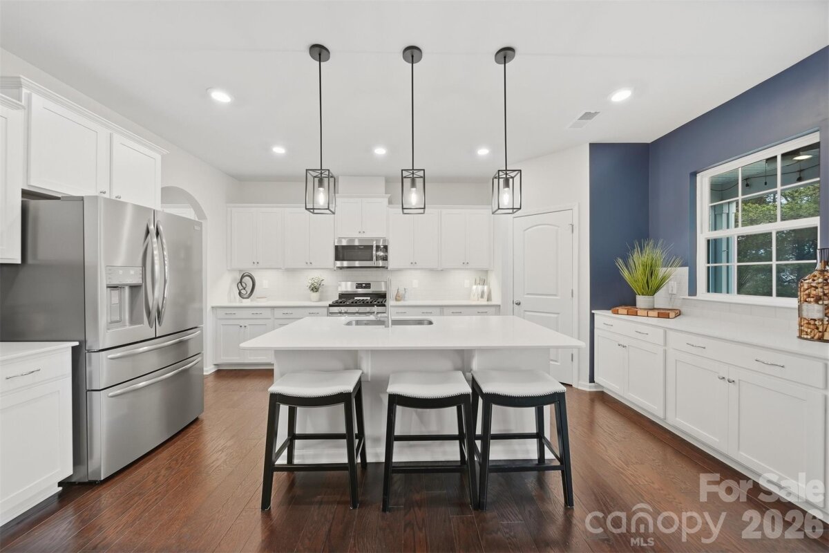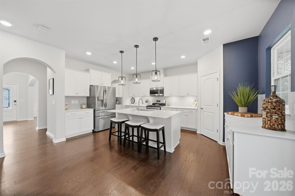 Welcome to a home that checks every box—and then a few more. This stunning and spacious four-bedroom, three-and-a-half-bathroom home, built in 2020, offers modern living with both style and functionality in the heart of Mooresville. Step inside to gorgeous wood flooring that spans the entire main level, leading you through a thoughtfully designed layout perfect for everyday living and effortless entertaining. The spacious kitchen steals the spotlight with white shaker cabinetry, quartz countertops, a gray tiled backsplash, stainless steel appliances, a walk-in pantry, and a cozy breakfast sitting area. Just between the kitchen and dining room, you’ll find a charming coffee bar—because mornings deserve a little magic. The inviting living room anchors the main floor with a warm gas-burning fireplace, creating the perfect space to relax and unwind after a long day. Upstairs, you’ll discover all four bedrooms, three full bathrooms, and a versatile loft area ideal for a home office, playroom, or additional living space. The primary suite serves as a true retreat, featuring an en-suite bathroom with dual vanities, a large walk-in shower, and not one—but two—spacious walk-in closets, giving your wardrobe room to breathe. Step outside to enjoy the covered screened-in back patio, offering a peaceful space for morning coffee or evening gatherings. Residents also enjoy access to the community pool, along with neighborhood amenities including paved walkways and street lighting throughout the community. Downtown Mooresville’s shopping, dining, and entertainment are just minutes away, making the location as convenient as it is desirable. With all major components practically brand new, this home is truly move-in ready and waiting. Schedule your showing before someone else falls in love first.