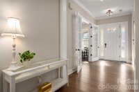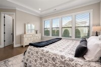to this stunning 5-bedroom, 3.5-bath home located in the amenity-rich Chapel Cove community aoffering over 3,400 square feet of thoughtfully designed living space. Engineered hardwoods flow throughout the main level, creating a comfortable and welcoming atmosphere, while 9-foot ceilings and 8-foot doors enhance the home’s refined feel. A white chef’s kitchen features a gas cooktop, wall oven, and an oversized island, and flows seamlessly into the dining area and family room—ideal for entertaining. With an abundance of natural light this homes feels light and airey. The family room includes crown molding and the warmth of the fireplace. This floorplan showcases the sought after main level primary suite with a large garden tub and shower with a bench. Two custom walk-in closets provides room for everyones clothes. Additional details include a main level home office w/french doors and a mud room outfitted with a drop zone. Upstairs, you will find a large bonus room (or 5th BR) and 3 secondary bedrooms (two sharing a Jack-and-Jill bath and the 3rd with a private bath) making space for everyone. Enjoy seamless Indoor/Outdoor with an oversized covered patio with a stone fireplace and a spacious fenced in yard overlooking the treed rear yard.