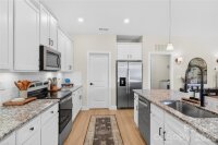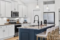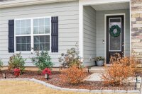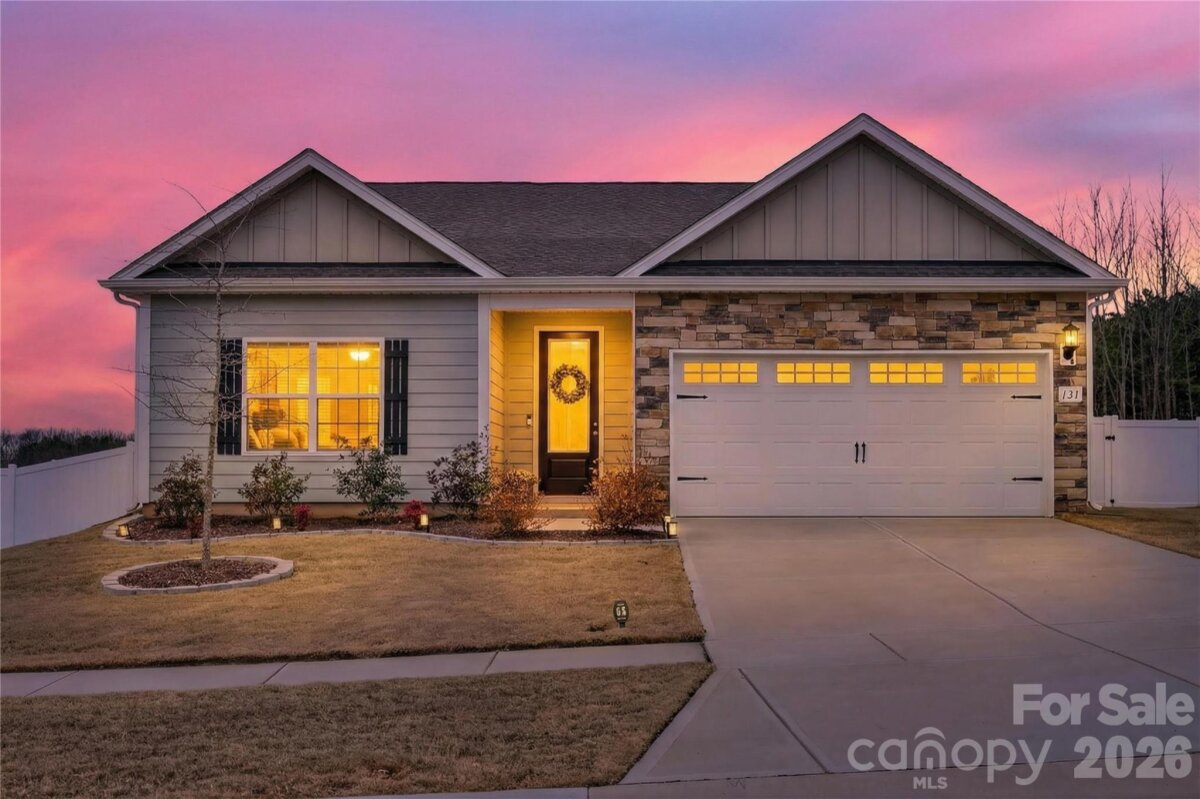 USDA qualified, ZERO DOWN! Like new and beautifully upgraded, this stunning ranch home blends modern convenience with thoughtful designer touches throughout. From the moment you enter, you’ll notice the attention to detail, including decorative picture frame moulding that enhances the entryway and kitchen island for a refined, custom feel. The spacious living area is anchored by a striking natural stone fireplace wall featuring an electric fireplace, natural wood mantel, matching floating shelves, and custom cabinetry—creating the perfect focal point for relaxing or entertaining. Multiple decorative wall sconces add warmth and ambiance in the living room, entryway, and primary bedroom. The kitchen shines with updated black cabinet and drawer hardware, a modern black faucet, and convenient hideaway garbage can storage. Updated black door hinges and hardware throughout the home create a cohesive, modern look. The primary suite offers a relaxing retreat with a spa-inspired bathroom featuring a handheld rainfall shower head. Both bathrooms include upgraded shower fixtures for enhanced comfort. Step outside to enjoy the private backyard with a white vinyl privacy fence and side entry gate. The front yard has been thoughtfully landscaped with retaining wall edging and landscape lighting along the porch for beautiful evening curb appeal. Additional features include remote-controlled motorized blinds at the patio doors, a whole-house water filtration system, garage wall organization with shelving and slat wall panels, a built-in shelving and cabinet wall unit in the home office, and a Ring security system with front doorbell and additional cameras. This move-in ready home offers stylish upgrades, smart features, and everyday functionality—perfect for today’s lifestyle.