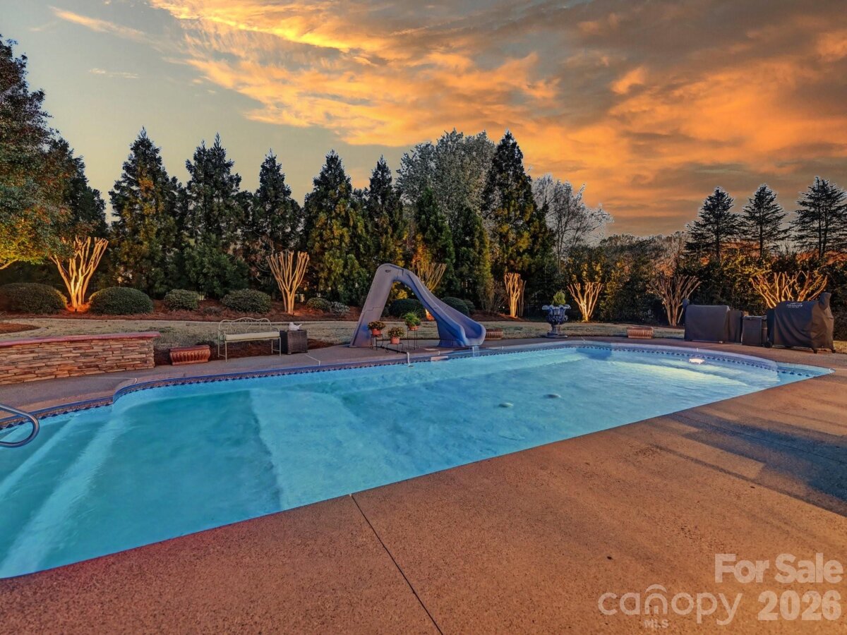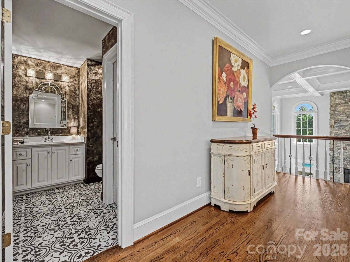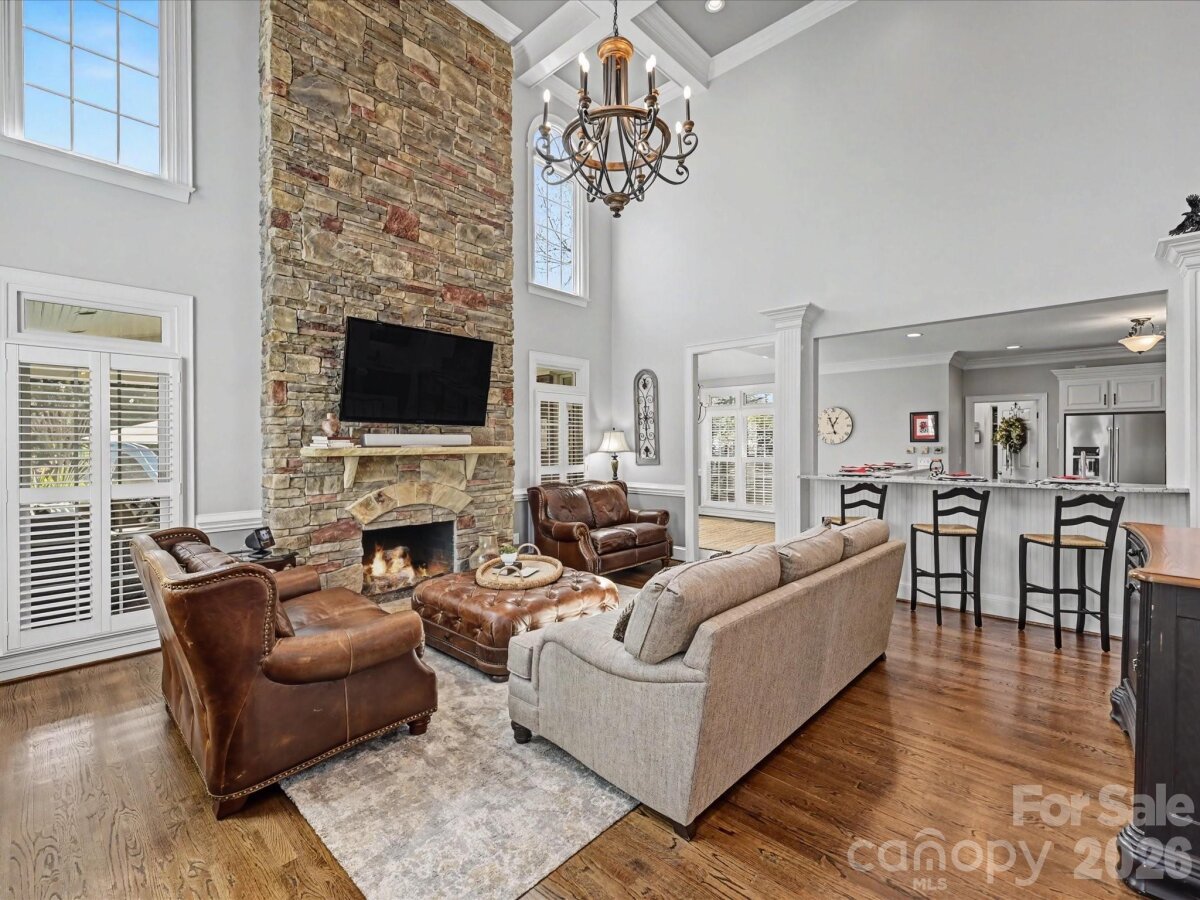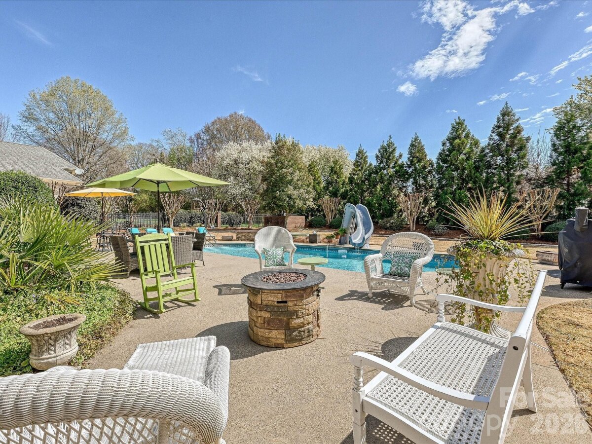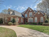 Welcome to 1321 Churchill Downs Drive, a stately all-brick residence tucked inside the fully gated community of Providence Downs. With a circular drive, impressive curb appeal, and a thoughtfully designed layout, this 4-bedroom, 3 full bath, 3 half bath home blends timeless elegance with modern updates, making it perfect for both everyday living and unforgettable entertaining. Step through the grand foyer, featuring classic wainscoting and a stunning turned staircase that immediately set the tone. The main-level primary suite offers a peaceful retreat with a deep tray ceiling, an expansive custom walk-in closet, and a spa-like bath complete with dual vanities, new tile flooring, a Jacuzzi tub, and separate shower. Gorgeous formal living spaces provide room for spectacular entertaining, while the heart of the home is the beautifully updated kitchen and family room. The sellers thoughtfully opened the space for seamless flow and painted the cabinetry crisp white, complementing stainless steel appliances, including double ovens and a gas cooktop. The two-story family room makes a statement with a coffered ceiling, a custom chandelier, and a floor-to-ceiling stone fireplace with a limestone mantle. Plantation shutters run throughout the home, and the windows were all replaced in recent years, adding both efficiency and peace of mind. Upstairs, you’ll find three generously sized bedrooms, one with a private en-suite bath, plus a loft area, walk-in attic storage and a huge, yet cozy, media room/bonus room ideal for movie nights or game days. Outdoor living shines with a level, fenced backyard featuring a saltwater pool with a fun slide, all overlooked by a lovely screened porch. A convenient door from the pool area leads directly into the laundry/mud/half bath which is perfect for guests. A 3-car garage with extra storage space completes the package. Residents of Providence Downs enjoy resort-style amenities including a community pool, clubhouse, playground, tennis courts, walking trails, and more, all within a secure gated setting and zoned for top-notch Marvin schools. This is luxury living designed for gathering, relaxing, and making memories!