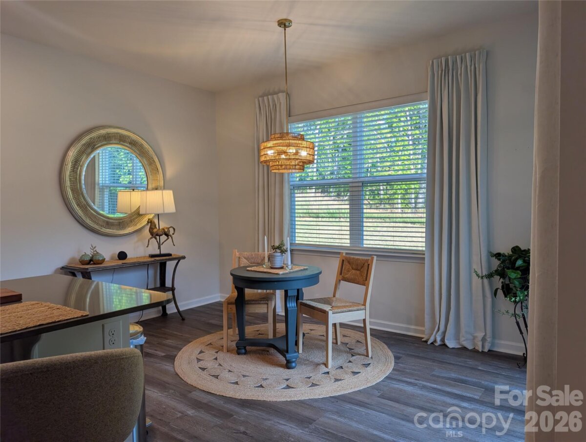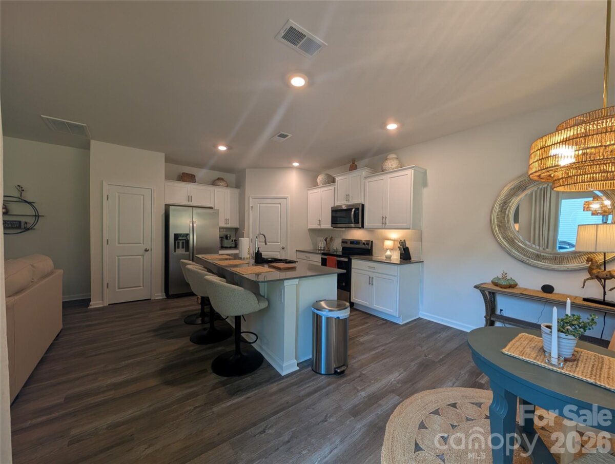 Step inside to a bright, inviting interior where natural light and a thoughtfully designed layout create an immediate sense of comfort. A wide foyer draws you into the open-concept living, dining, and kitchen area—ideal for both everyday living and easy entertaining—anchored by a modern electric fireplace. The kitchen offers stainless steel appliances and a seamless connection to the main living spaces, while upstairs features all bedrooms, including a spacious primary suite with a private bath and walk-in closet. Convenient upper-level laundry enhances the home’s functional design. Positioned on a curve, the backyard provides a bit more space than nearby homes, with a patio and a tree-lined backdrop that creates a more private, comfortable outdoor setting. Additional highlights include an attached garage and close proximity to a nearby dog park just across the street. Built in 2025, this 3-bedroom, 2.5-bath home offers a clean, modern feel throughout with a layout designed for ease and livability.