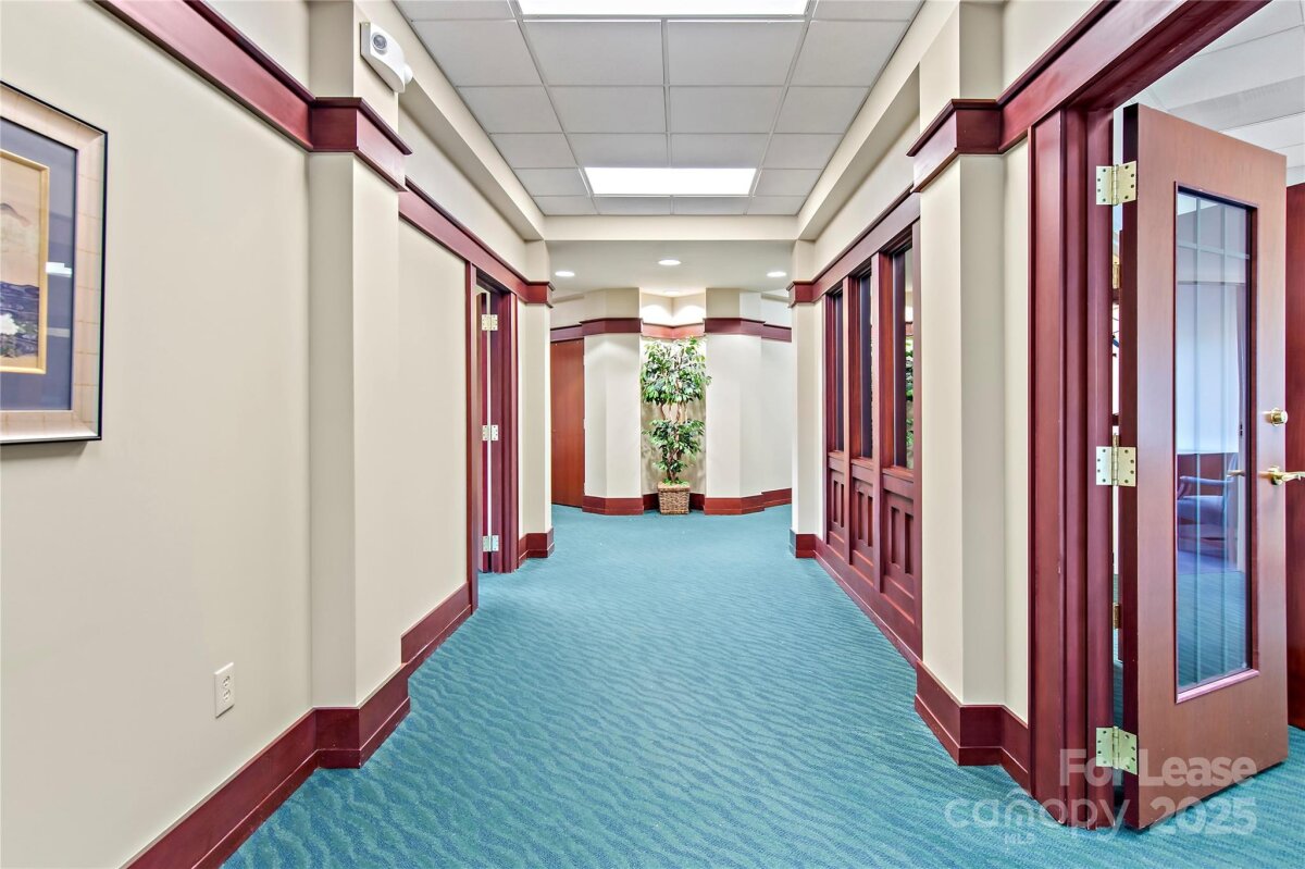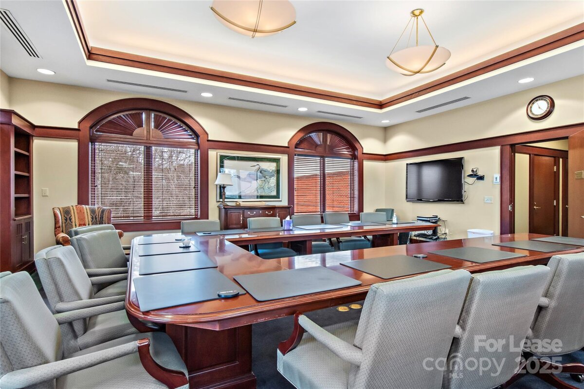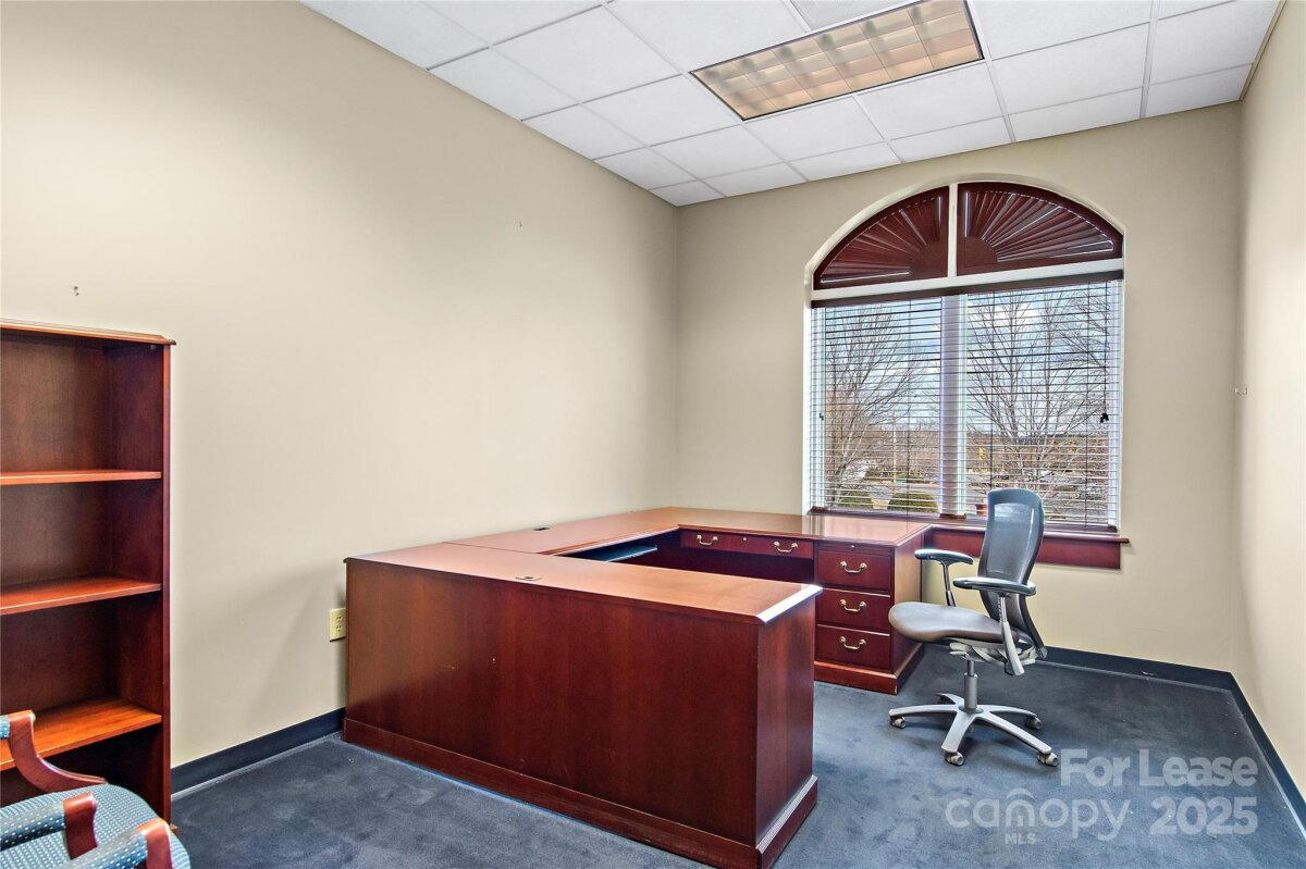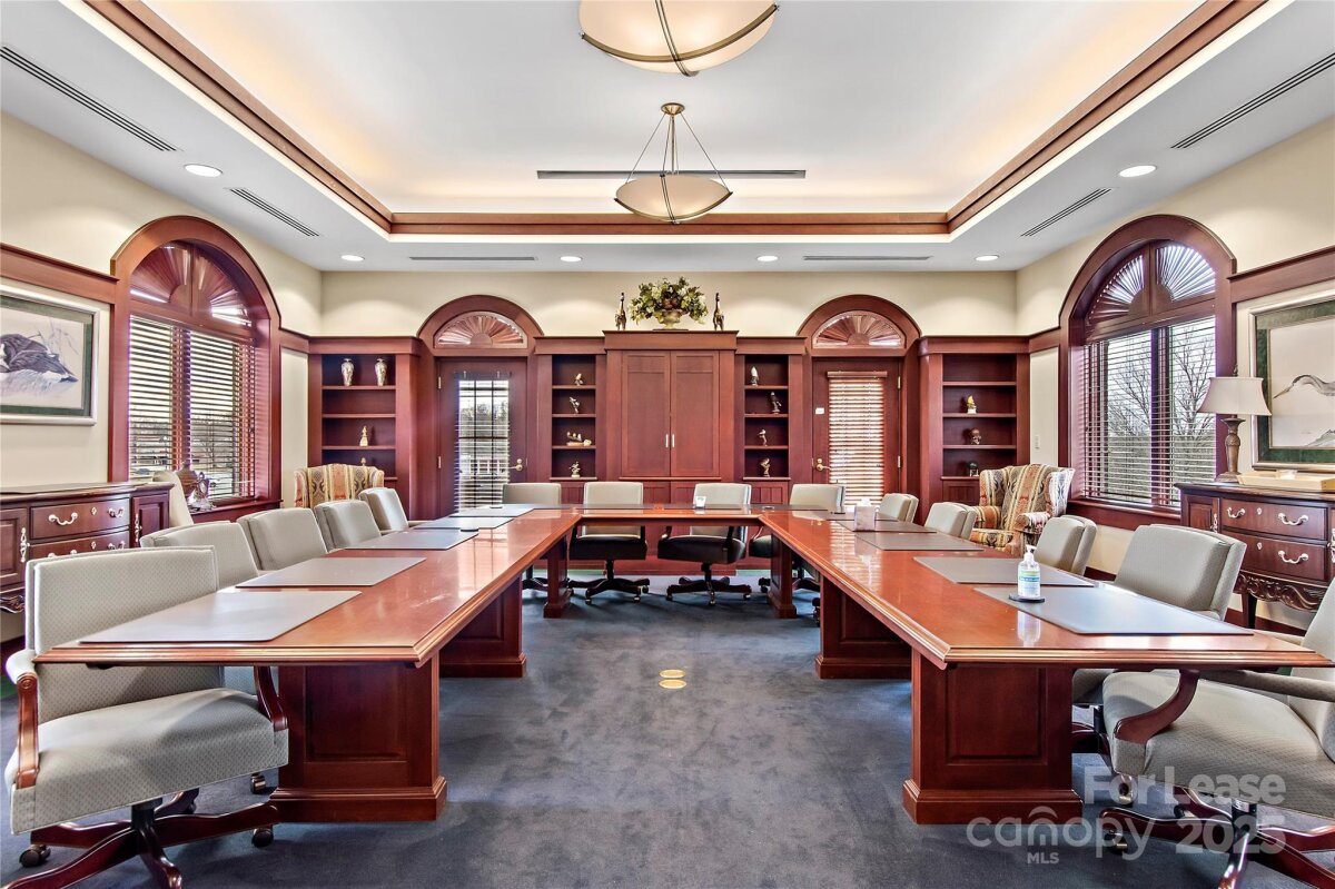 Available for Lease. This office suite is upstairs in Bank OZK serviced by an elevator in the entry. It offers 9 offices, 5 exterior with windows on the right side and two window offices on the left side and two interior offices. There are additional rooms that could be used for reception, waiting and storage. The conference and break room are shared spaces with the bank and there is a patio outside the conference room. The space can also be accessed from a back or front stairwell. Furniture can remain. The floor plan is conducive to two independent companies sharing the space.