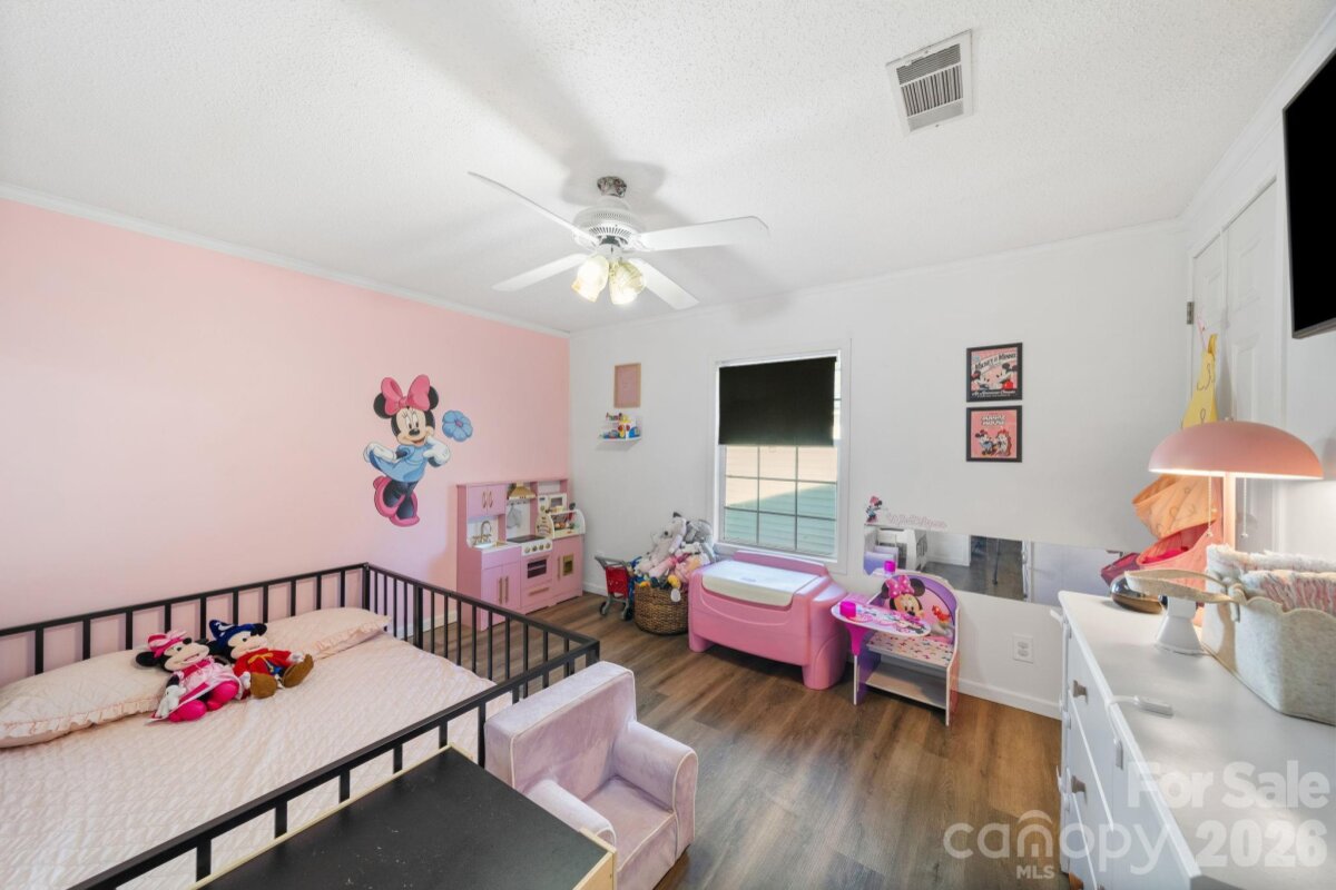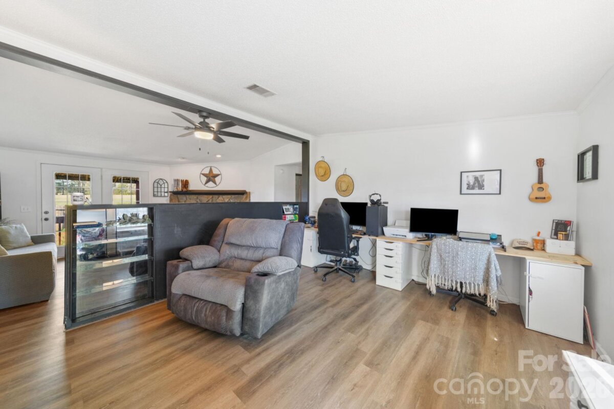 This spacious, split-bedroom floor plan features three bedrooms and two bathrooms, situated on 2.4 acres of land. The property includes a large primary bedroom, a fenced backyard, and a detached garage and shop.