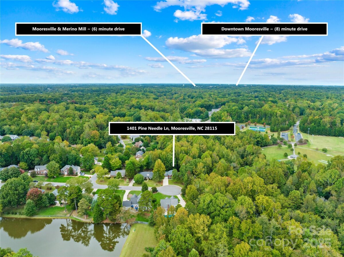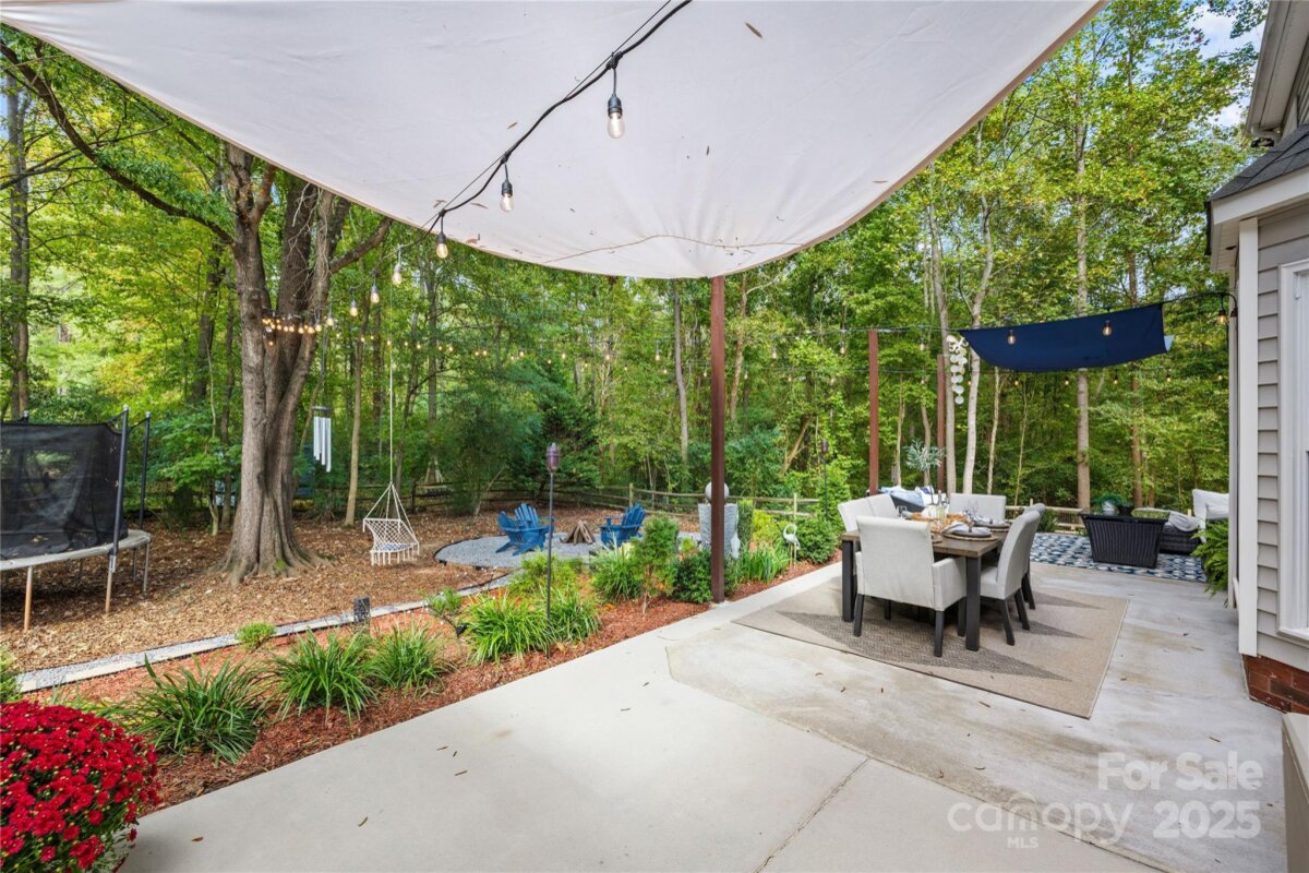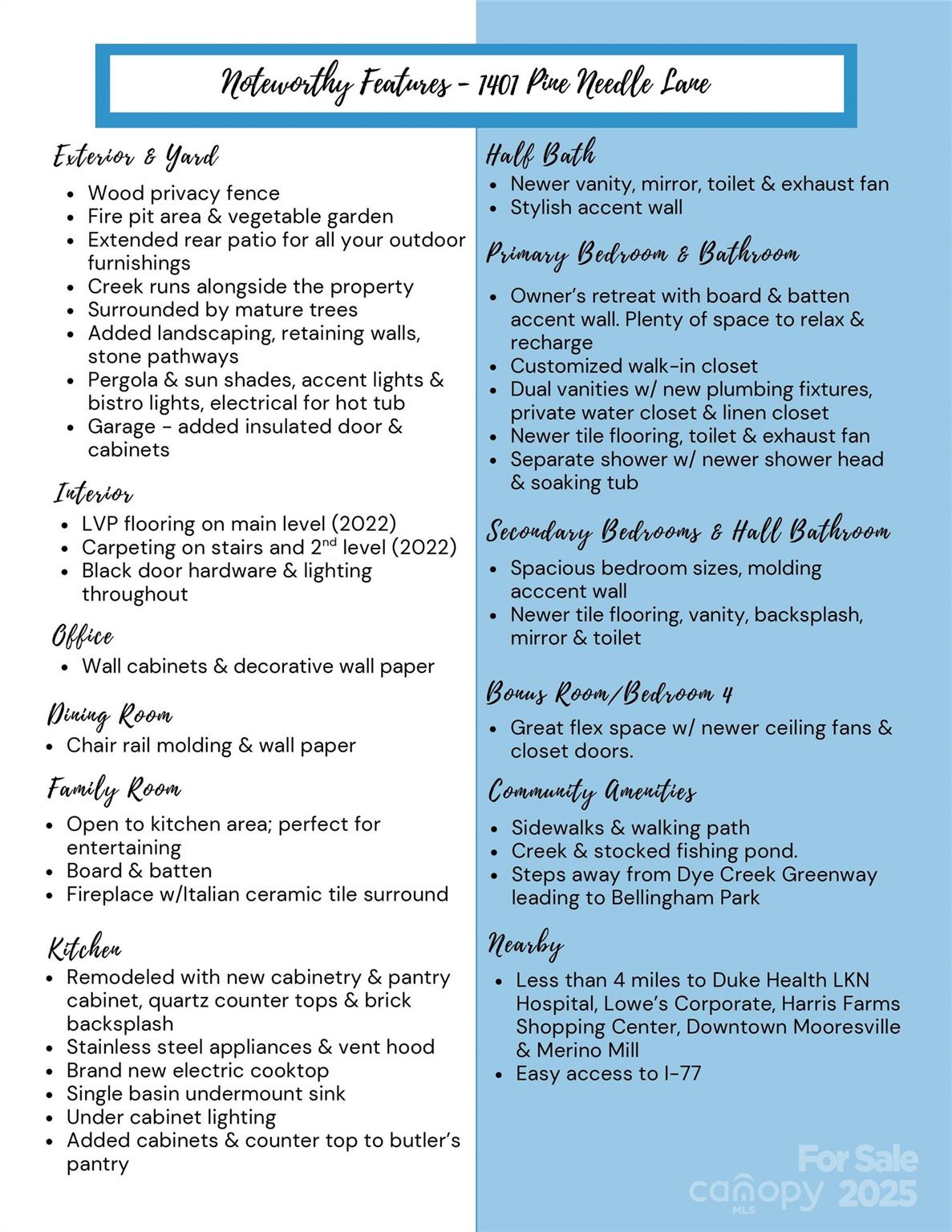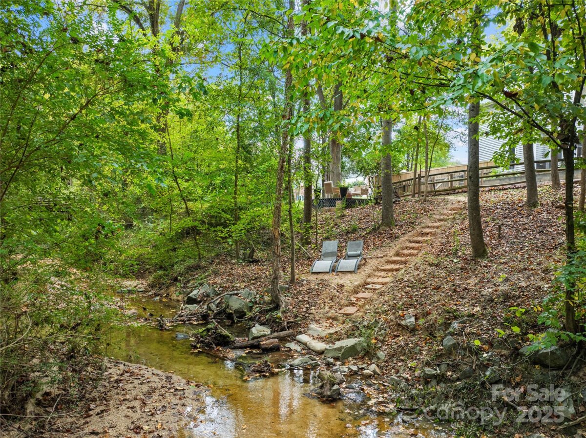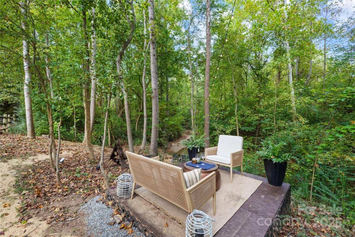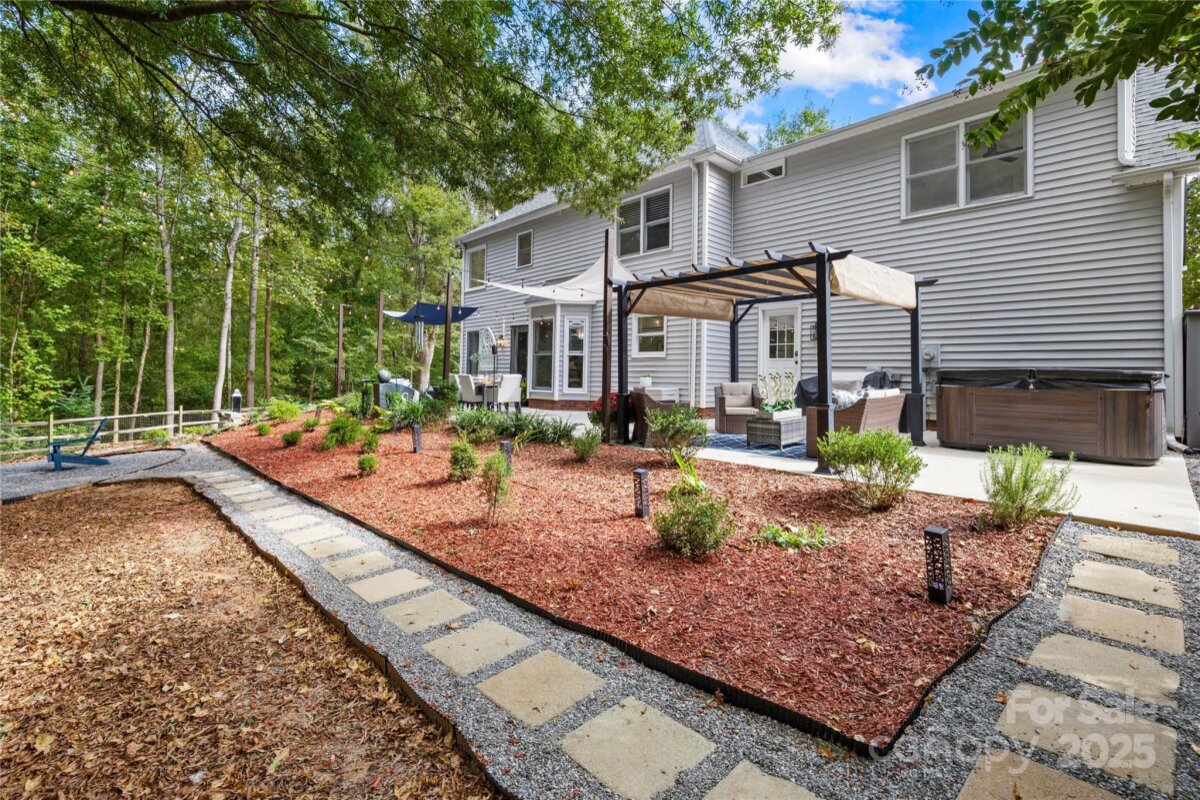 Welcome to your own private retreat in Franklin Grove! Nestled on a quiet cul-de-sac street in a picturesque community with a pond for fishing and steps from Dye Creek Greenway to Bellingham Park, this beautifully updated home offers the perfect blend of serenity, outdoor living, and modern design. The over 1/3 acre homesite is a nature lover’s dream—surrounded by mature trees and a peaceful creek that flows alongside the property. Follow the charming blue stone path to the water’s edge, unwind by the fire pit, or relax under the pergola and canopies while listening to the sounds of the creek. Entertain or dine alfresco on the extended patio accented by stone pathways, retaining walls, and bistro string lights that create an inviting evening glow. A wooden privacy fenced backyard, vegetable garden, and lush landscaping complete this tranquil outdoor escape. Inside, the home is equally impressive with thoughtful updates throughout. LVP flooring, designer light fixtures, and sleek black door hardware create a modern, cohesive look. A new back door and updated blinds on most windows complete the home’s refreshed aesthetic. In the family room, a gas fireplace with Italian ceramic tile surround serves as a striking focal point, while the living room/office showcases built-in cabinetry. The dining room features elegant chair rail and decorative wallpaper, adding warmth and sophistication to the space. A fully renovated kitchen steals the show with quartz countertops, a brick backsplash, new cabinetry and pantry cabinet, electric cooktop with vent hood, double wall ovens, under-cabinet lighting, and a walk-in butler’s pantry. Completing the main level, the half bath impresses with a new vanity, mirror, lighting, and accent wall. Upstairs, the primary suite feels like a sanctuary with a dramatic tray ceiling, custom board & batten feature wall, and a large walk-in closet with custom shelving and designer wallpaper. The primary bath offers dual vanities, a soaking tub with views of the wooded backyard, separate shower, and updated tile flooring, faucets, and fixtures. Secondary bedrooms are generous in size, including one with a custom accent wall and another oversized bedroom/bonus with a new closet door and ceiling fans. The hall bath was also remodeled with a new vanity, backsplash, mirror and tile flooring. Even the garage has been upgraded with an insulated door and abundant cabinetry for organized storage. The home is served by coveted Mooresville Graded Schools and offers unbeatable convenience— under 4 miles to Lowe’s Corporate, Duke Health Lake Norman Hospital, Harris Farms Shopping Center, Merino Mill and Downtown Mooresville with quick access to I-77. Every inch of this property has been enhanced with care and creativity. From the curated landscaping to the designer interiors, this home is more than move-in ready—it’s a lifestyle. Come experience the peace, charm, and character that make this property truly one of a kind. **New roof 2022**