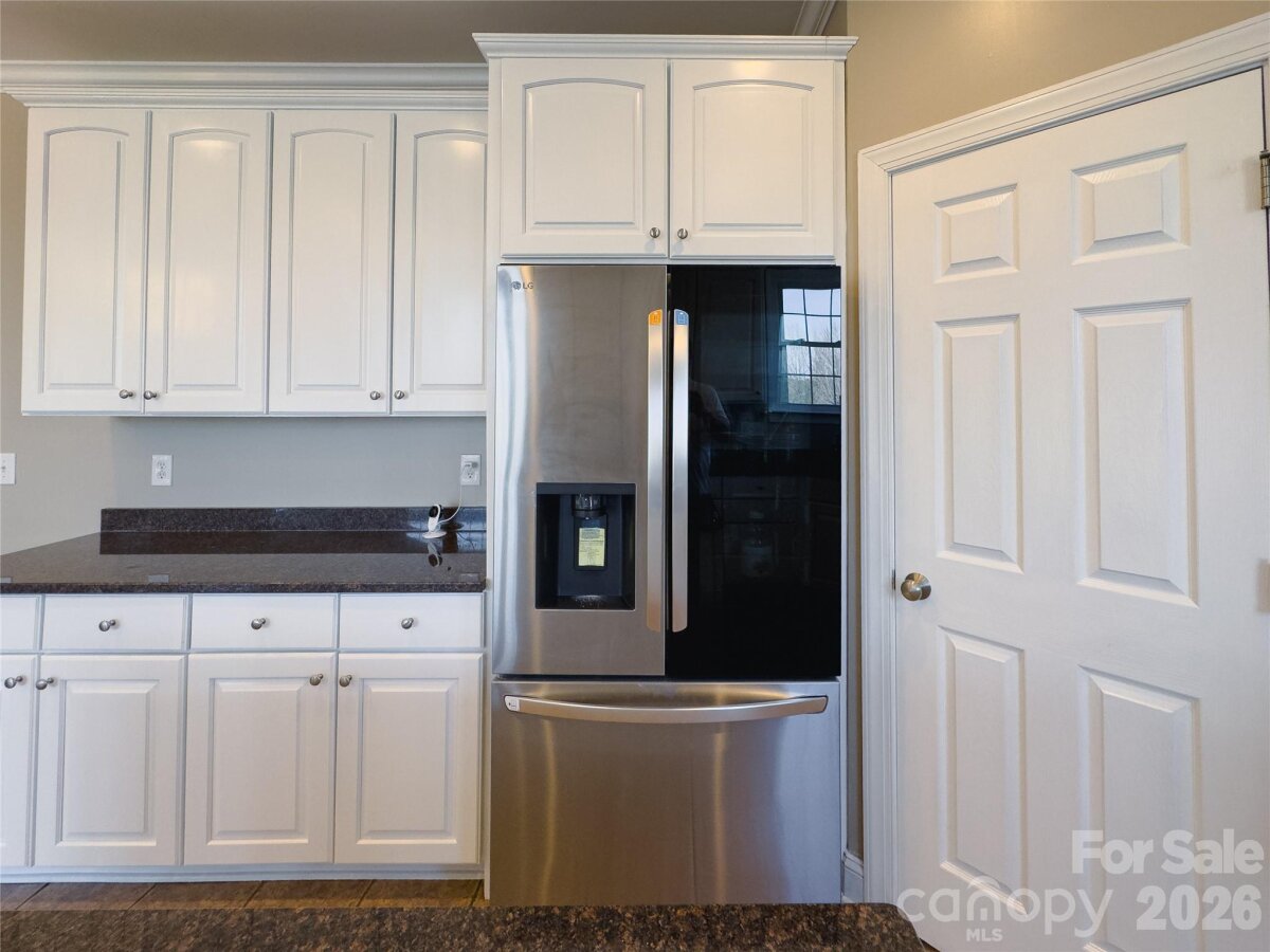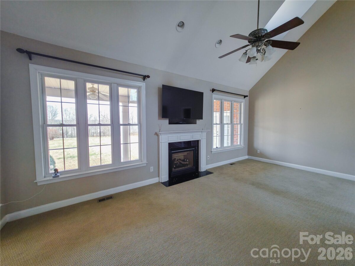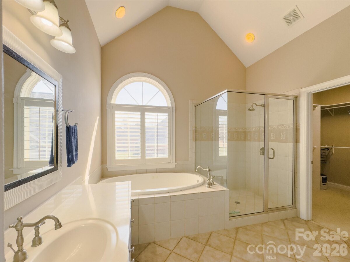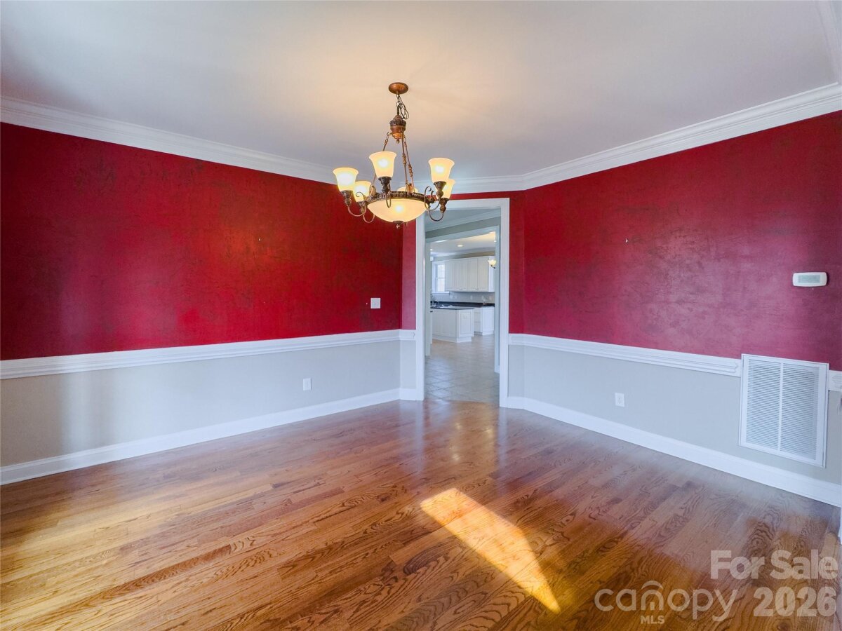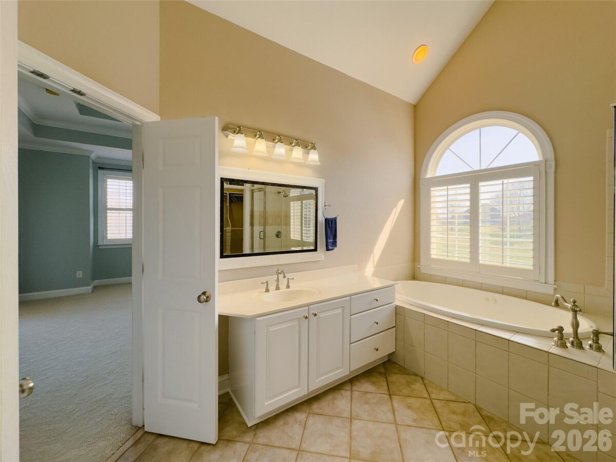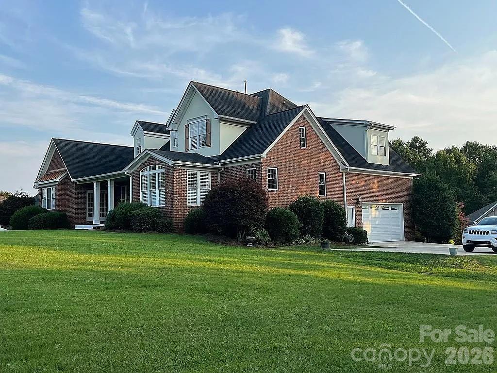 This beautiful custom home is located in the desirable Larkin Golf Club community in Statesville, offering spacious living areas on a large lot backing up to the 9th fairway. This all-brick home with stucco dormers features cathedral ceilings in the entryway and living room, custom crown molding, plantation wood blinds, and ¾" tongue-and-groove hardwood floors throughout much of the main level. The living room showcases skylights and a gas fireplace, creating a warm and inviting gathering space. The kitchen offers granite countertops, ample storage with real wood cabinetry, stainless steel appliances, and a new LG Smart refrigerator, along with a bright sunroom where French doors open to the covered back porch with new Trex decking, ideal for relaxing or entertaining. The main-level primary suite features French doors to the back porch, a cathedral ceiling, Jacuzzi tub, and a spacious walk-in closet. A second flex room on the main floor works well as a guest room, office, den, or craft space. Upstairs includes two additional bedrooms, one with golf course views, a large bonus room or potential fifth bedroom, and a sitting area ideal for a game room, office, or reading nook. Additional highlights include a new roof (2025), on-demand hot water, an oversized garage with a storage system, and mature landscaping, including rose bushes, crape myrtle trees, and Japanese maple trees offering seasonal color. Enjoy access to Larkin Golf Club amenities including golf, pool, tennis, pickleball, and dining.