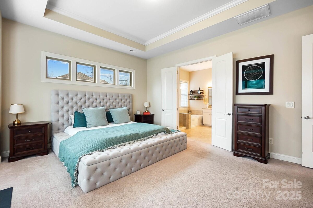 Welcome to this open, light-filled home sitting on a 1/2 acre lot! This popular Somerset, 1.5 story floor plan, by Bonterra features the primary and 2 additional bedrooms on the main with 10' ceilings ,8' interior doors, hardwoods in the main rooms and a beautiful stained wood staircase. Step inside to the entry hall where you will find an office, two generous size secondary bedrooms with full bath and the formal dining room with plenty of space to host holiday gatherings or casual family night meals. The well appointed kitchen features a 5 burner gas cooktop, wall microwave/oven, large center island with barstool seating and a breakfast area with plenty of windows for natural light. The kitchen opens directly into the large great room with a 1 story stone fireplace! The primary suite offers a special retreat for the owner with tray ceiling, private luxury bath with shower and separate soaking tub and a generous size walk-in closet. A conveniently located laundry room completes the main level. On the upper level you will find a bedroom with full bath and large walk in closet and a bonus room that can also serve as an additional bedroom if needed. Exterior features include a 3 car garage, full irrigation, and a covered back deck with beautiful views of the fenced back yard! Great location with Blair Mill Park close by and the Greenway Trail adjoins the Vickery Neighborhood. Access to I-485 is only 1 mile away.