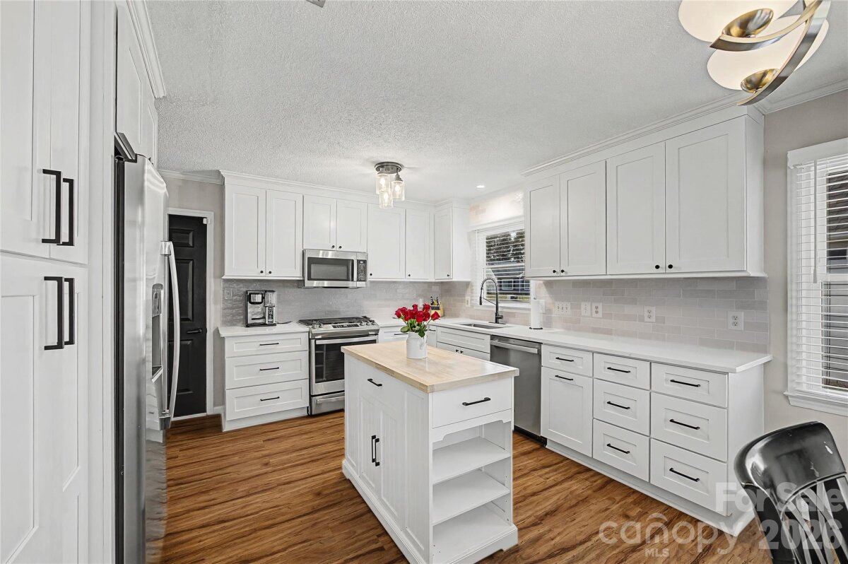 THIS IS THE ONE YOU HAVE BEEN WAITING FOR! Fabulous, open concept ranch home with all the bells and whistles. ALL NEW kitchen and appliances in 2024 including custom "soft-close" cabinetry, Quartz countertops, deep single bowl SS sink, 5 burner SS gas range, tile backsplash, and pantry! Large dining area with bay window that overlooks the private backyard. You will love the HUGE great room with brick woodburning fireplace and vaulted ceiling with attractive wood beam. The owner's retreat also has vaulted ceiling w beam and lots of windows, making it feel light and airy. Vaulted owner's bath with double sinks, garden tub, sep shower, tile floors. Wood laminate flooring thru kitchen, living area, foyer, and primary bedroom. Relax on the extended back deck and patio overlooking the backyard with privacy fence. NEW heat in 2023, NEW windows 2022. All black hardware and lots of new fixtures. NO HOA, neighborhood access to the greenway that connects to Rivergate shopping center and walking distance to Rivergate Elementary. Easy access to shopping and I-77 for easy commute!