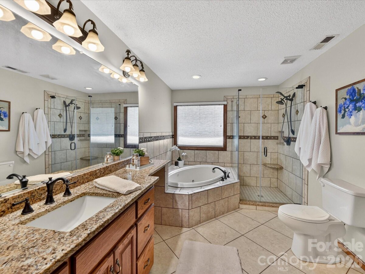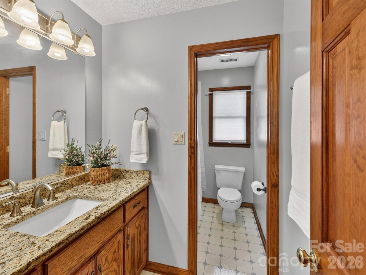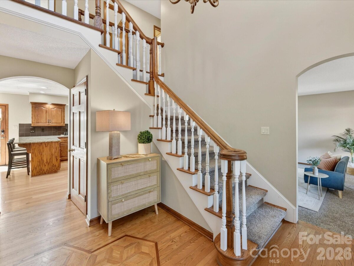 Charming two-story home nestled on a spacious corner (.93 acre) lot, with 3 car, side load garage, surrounded by mature trees and offering a peaceful, private setting. A welcoming, expansive front porch leads into a bright foyer with elegant staircase detailing and beautiful hardwood floors that flow throughout the main living areas. The home features a warm and inviting living room, a cozy great room with brick surround fireplace, and an elegant dining room with large windows and serene views. The well-appointed kitchen offers granite countertops, rich wood cabinetry, stainless steel appliances and a functional island, seamlessly connecting to a sunlit breakfast nook and overlooking the backyard. Upstairs, the relaxing primary suite provides a comfortable retreat with an ensuite bath featuring a dual-sink vanity, soaking, whirlpool tub, and separate tiled shower, along with a spacious walk-in closet with built-in storage. Additional bedrooms are generously sized with soft natural light and flexible space, complemented by a well-maintained full bath. The basement level expands the living space with a large recreation area and dedicated storage room, offering versatility for a variety of needs. Step outside to enjoy the spacious back deck and private patio, perfect for outdoor entertaining, all overlooking a large fenced backyard with room for a pool & to play, garden, or relax. A detached storage building adds even more functionality. With an expansive driveway, attached garage, and a serene, tree-lined setting, this home offers the perfect blend of comfort, space, and privacy in a desirable neighborhood.