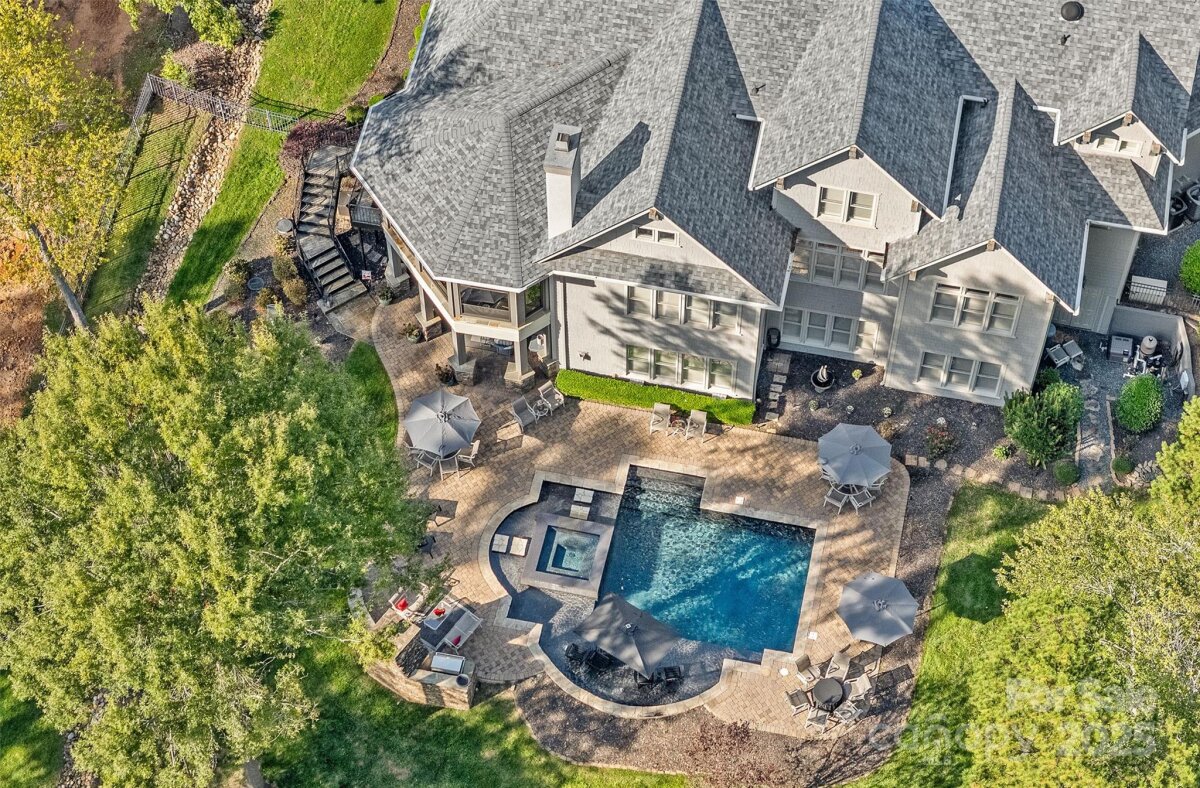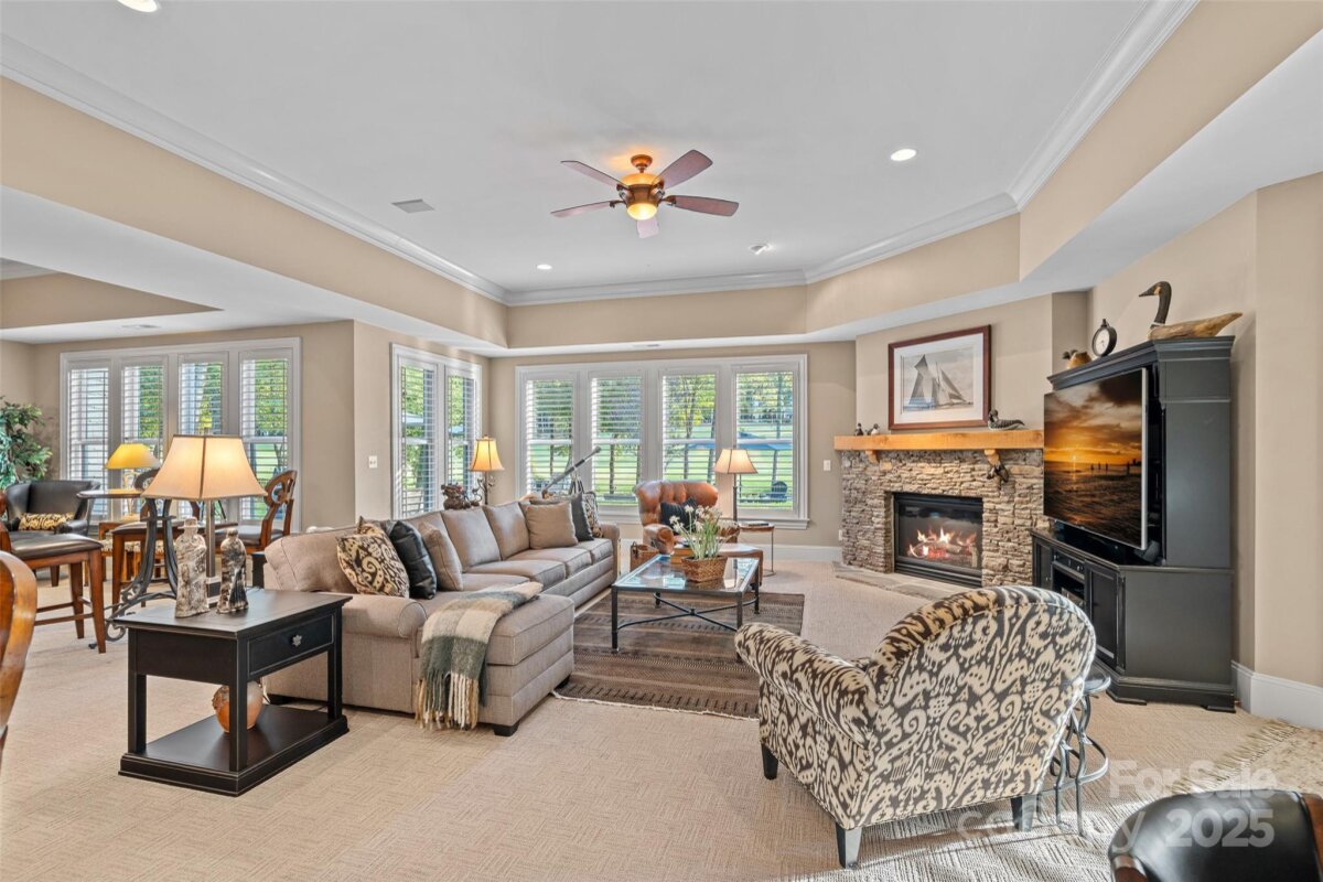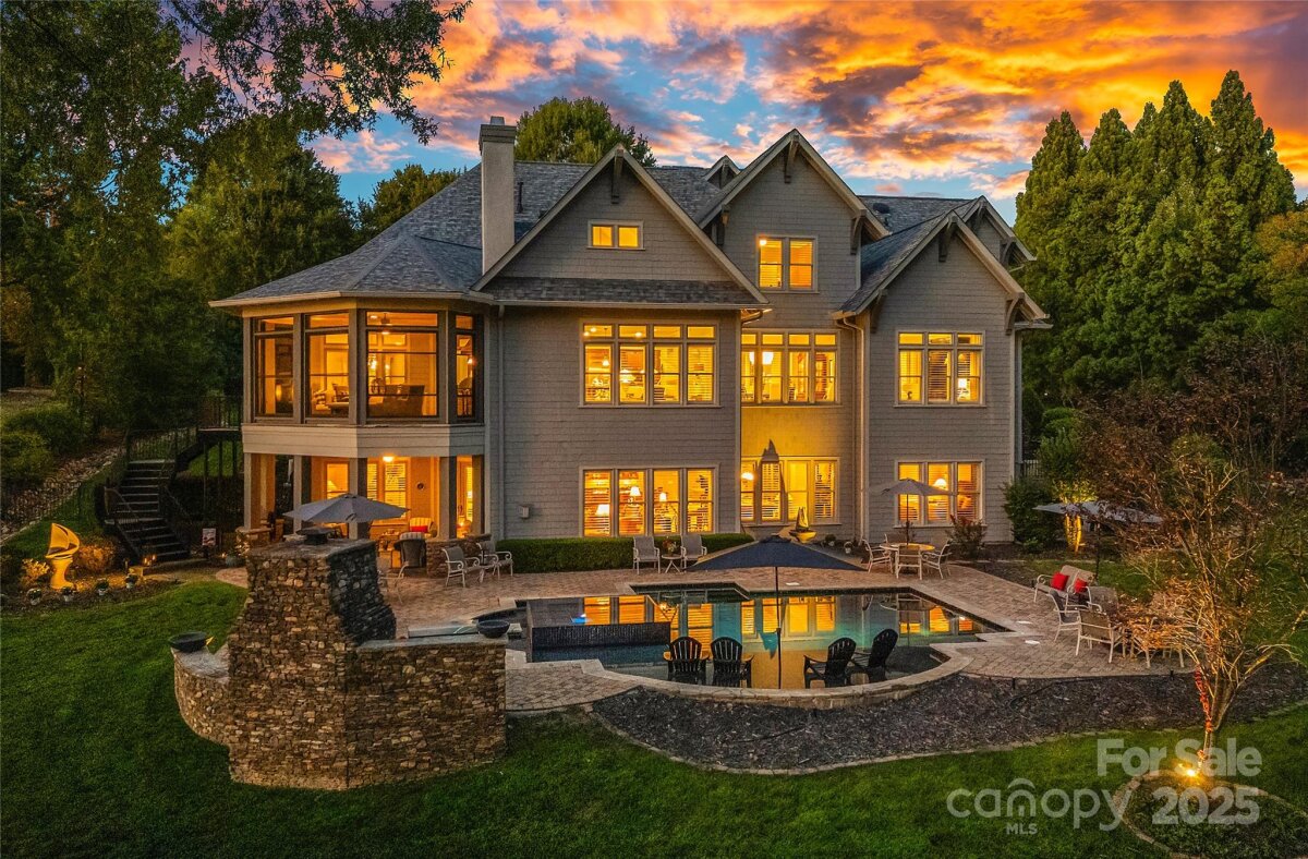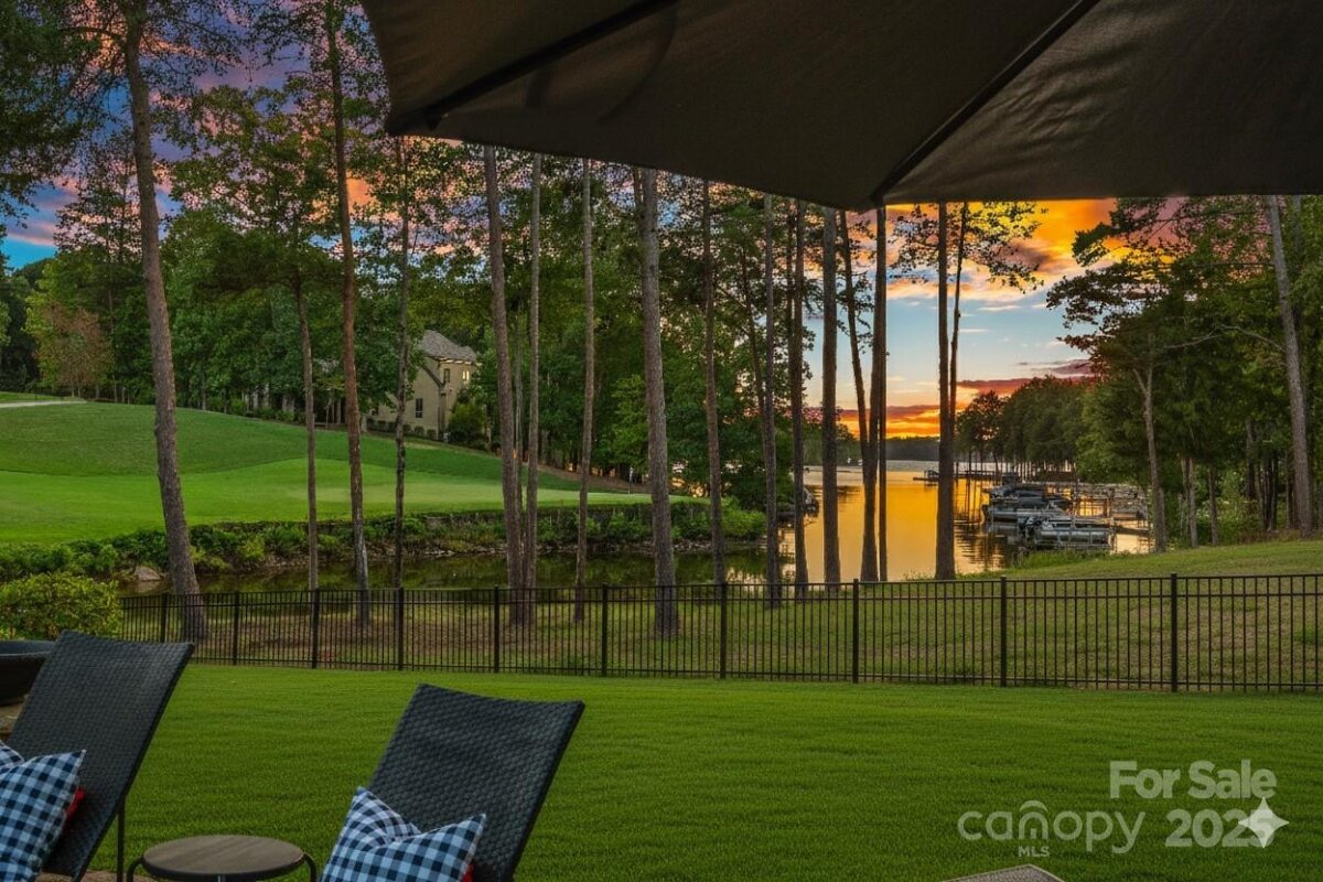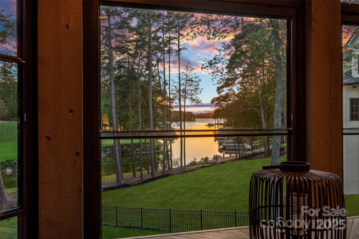 Nestled within The Point on Lake Norman, this custom-built luxury estate is a masterpiece of design, offering an unparalleled lifestyle where lakefront tranquility meets championship golf. Situated on approximately 1.5 private, park-like acres in a quiet cul-de-sac, the residence captures spectacular, simultaneous sunset views of Lake Norman and vistas across the 10th fairway of Trump National Golf Club Charlotte. Exquisite craftsmanship defines the interiors, which showcase intricate detailed molding and an open-concept layout designed for both grand entertaining and sophisticated lake living, featuring five en suite bedrooms and a powder room. The main level specifically features a private office with Custom Paneled Wood Wainscot Molding and a coffered ceiling, a second office for two with lake views, and an expansive dining room with a modern chandelier. The gourmet kitchen is a chef's dream, appointed with an abundance of walnut cabinetry, professional Thermador appliances, a Miele coffee maker, and an oversized island with seating for 12, seamlessly flowing into a vaulted great room with a stone fireplace and a uniquely versatile solarium that offers year-round enjoyment with its retractable glass and screen system. The luxurious main-level primary suite boasts beautiful views, dual closets, and a spa-like bath, while the upper level thoughtfully provides three additional en suite bedrooms, a cozy loft with built-in bookshelves and a two-person desk area, with a large walk-in attic for storage. The finished lower level provides the ultimate retreat, complete with a guest suite, full bar, a dedicated billiards area, a warm family room with a stone fireplace, a yoga/flex room, a commercial-grade gym, and a large sauna. Outside, the resort-style amenities continue with a heated saltwater pool and spa, an outdoor stone fireplace, and a built-in grill, all overlooking the dual water and golf course scenery, with direct backyard access to the lake for paddle boarding, complemented by a four-car garage plus a whole-home generator. Trump National Golf Club Charlotte includes golf, pickle ball courts, tennis courts, a fitness center, restaurants and tons of social events.