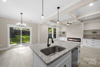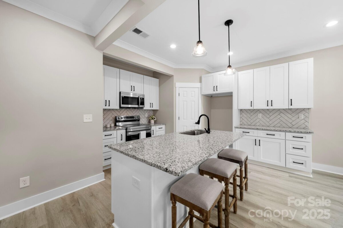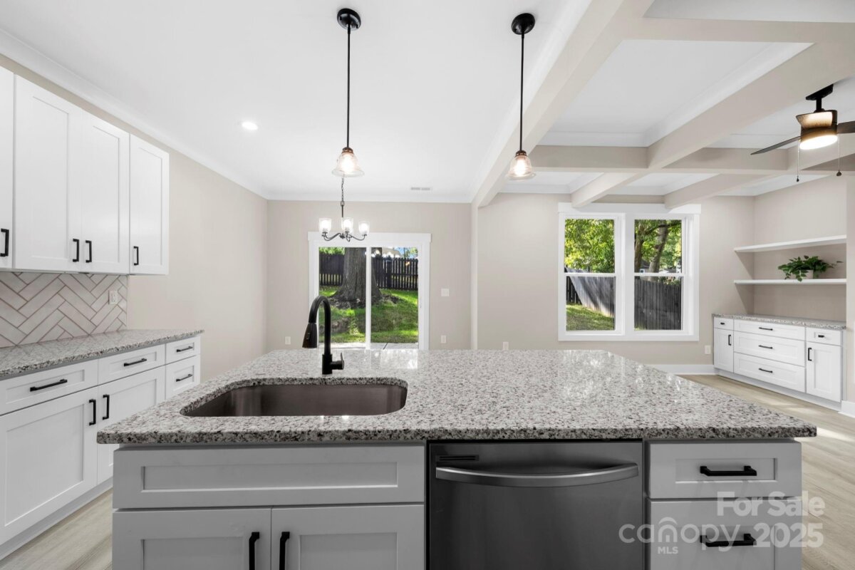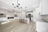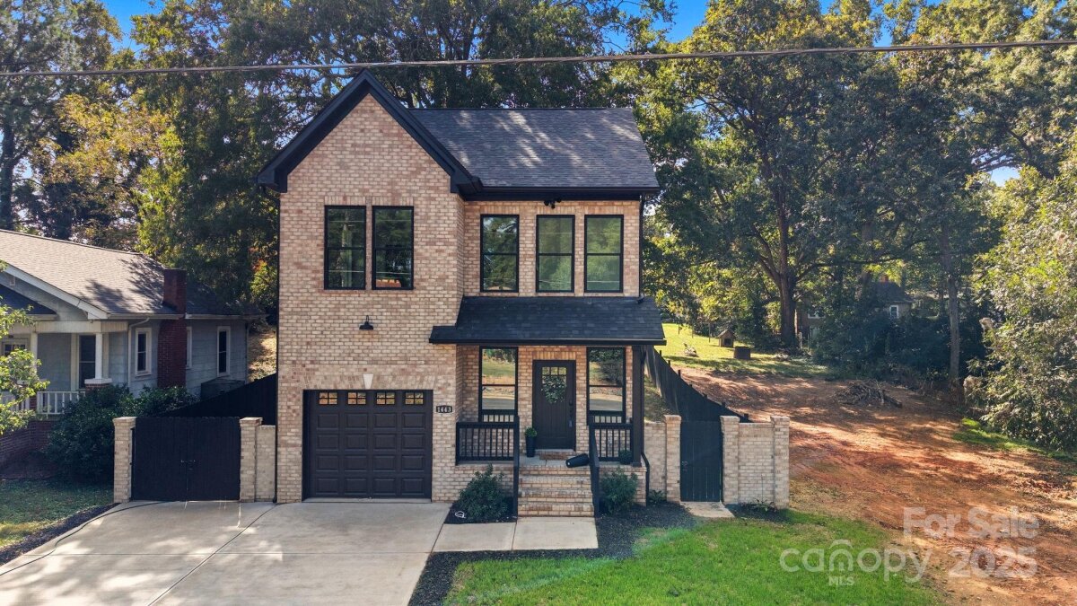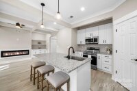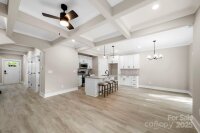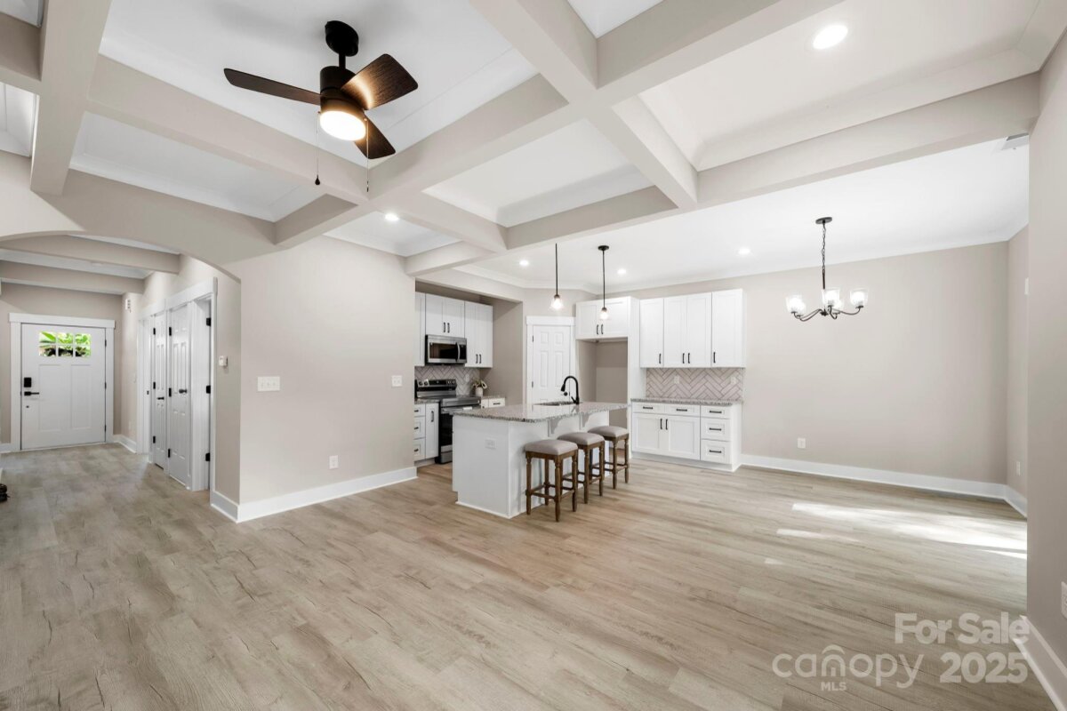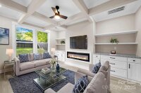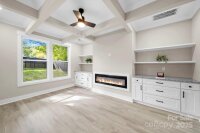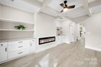 This stunning two-story home features 3 bedrooms and 2.5 bathrooms, beautifully blending modern elegance with timeless charm. The exterior showcases a clean brick facade with black accents on the garage door and side gate, nestled among mature trees that provide privacy and natural beauty. Inside, the inviting living room boasts exquisite coffered ceilings and a built-in entertainment center with a sleek linear fireplace—creating a cozy focal point for gatherings. Large windows flood the space with natural light, highlighting the bright and airy atmosphere. The open floor plan flows seamlessly into spacious living and dining areas, perfect for entertaining or everyday comfort. Neutral tones, crisp white built-ins, and light wood-look flooring add a contemporary and welcoming touch. Upstairs, the primary suite offers a luxurious retreat complete with an ensuite bathroom and a custom walk-in closet, complemented by two additional bedrooms and a guest bathroom. Enjoy convenient access to nearby amenities, including Stanly Community College, Pfeiffer University, lakes, parks, and the vibrant Albemarle community. This home perfectly combines comfort, style, and location—schedule your tour today and make it yours!
