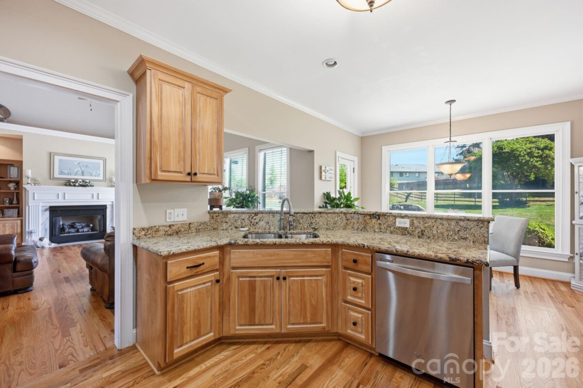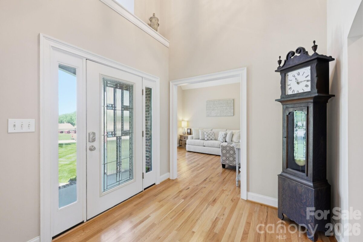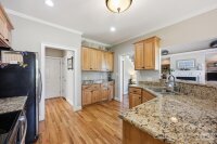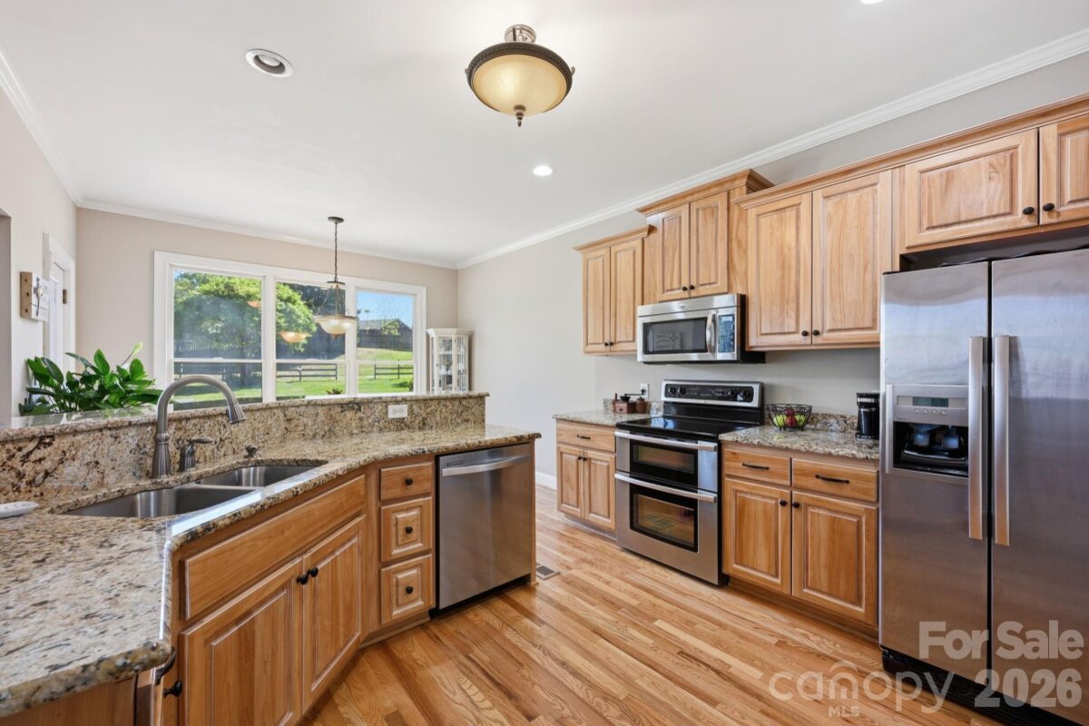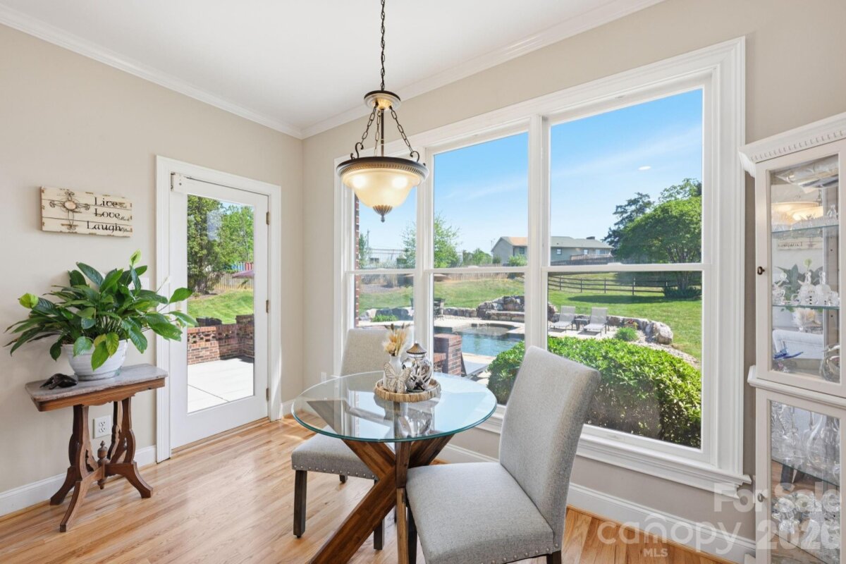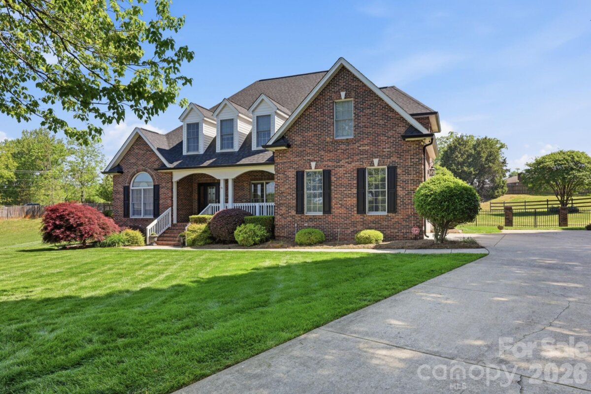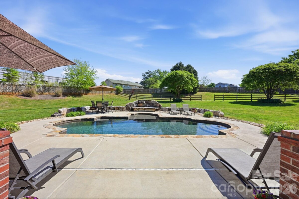This beautifully maintained full-brick home is tucked on a cul-de-sac lot of over 3/4 acre, offering a thoughtful blend of space, comfort, and standout features both inside and out. The inviting exterior showcases a covered front porch, manicured landscaping, and a private backyard retreat complete with an in-ground pool featuring built-in stone benches, fully fenced back yard, and an additional partially fenced area in the far back corner of the fenced yard. The pool pump and filter were replaced in 2024, adding peace of mind for the next owner. Inside, the two-story foyer welcomes you with abundant natural light, hardwood floors, and elegant architectural details that continue throughout the home, including arched openings, crown molding, and custom built-ins. The two-story great room features a gas log fireplace with decorative mantle and flanking built-ins, while the kitchen offers granite countertops, stainless Whirlpool appliances including a double-oven smooth-top range with 5 burners, both a breakfast bar and large breakfast nook for less formal dining, and a built-in buffet for added storage and functionality. The nearby laundry room offers a large closet for a pantry or extra storage. The main-level primary suite provides a spacious retreat with a tray ceiling, dual walk-in closets, and a beautifully updated bath featuring a freestanding tub, tiled shower with frameless glass, and dual vanities. Upstairs, additional bedrooms offer flexible space for a variety of needs, along with a full bath and hardwood flooring in the landing. Practical features include a security system, irrigation, epoxy-finished garage with built-ins, and a spacious laundry room with added storage. Tucked back in a neighborhood with no HOA dues, conveniently located near I-77, shopping, and dining, and within the award-winning Mooresville Graded School District, this home combines a desirable location with everyday livability and inviting outdoor spaces.